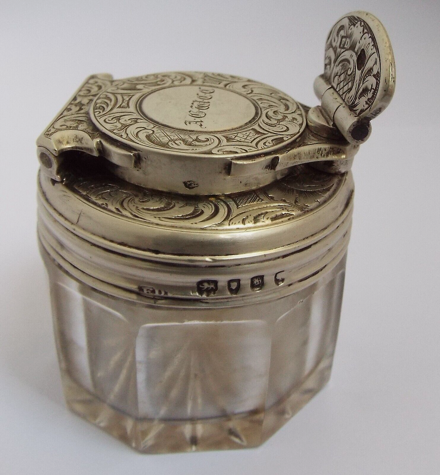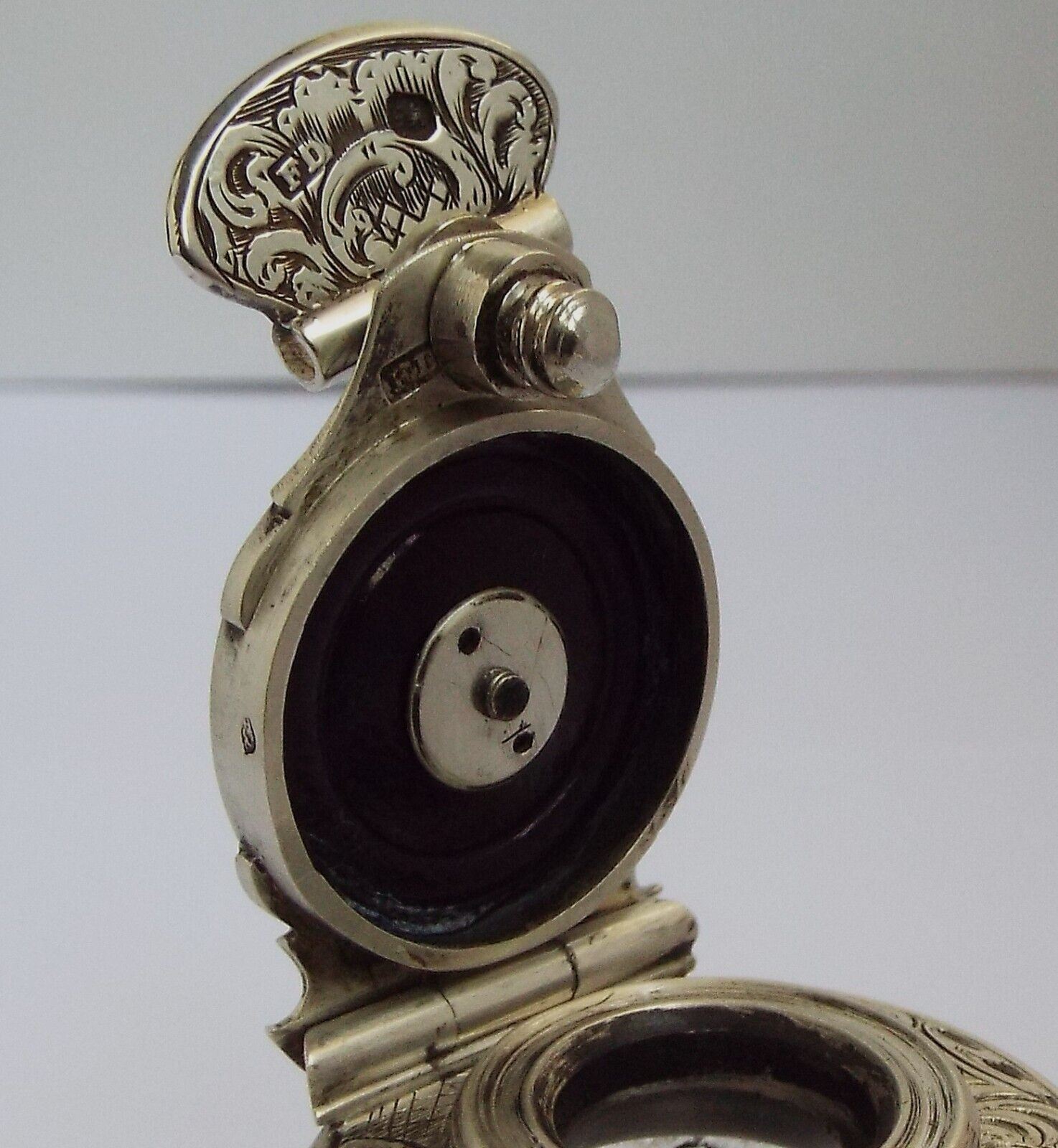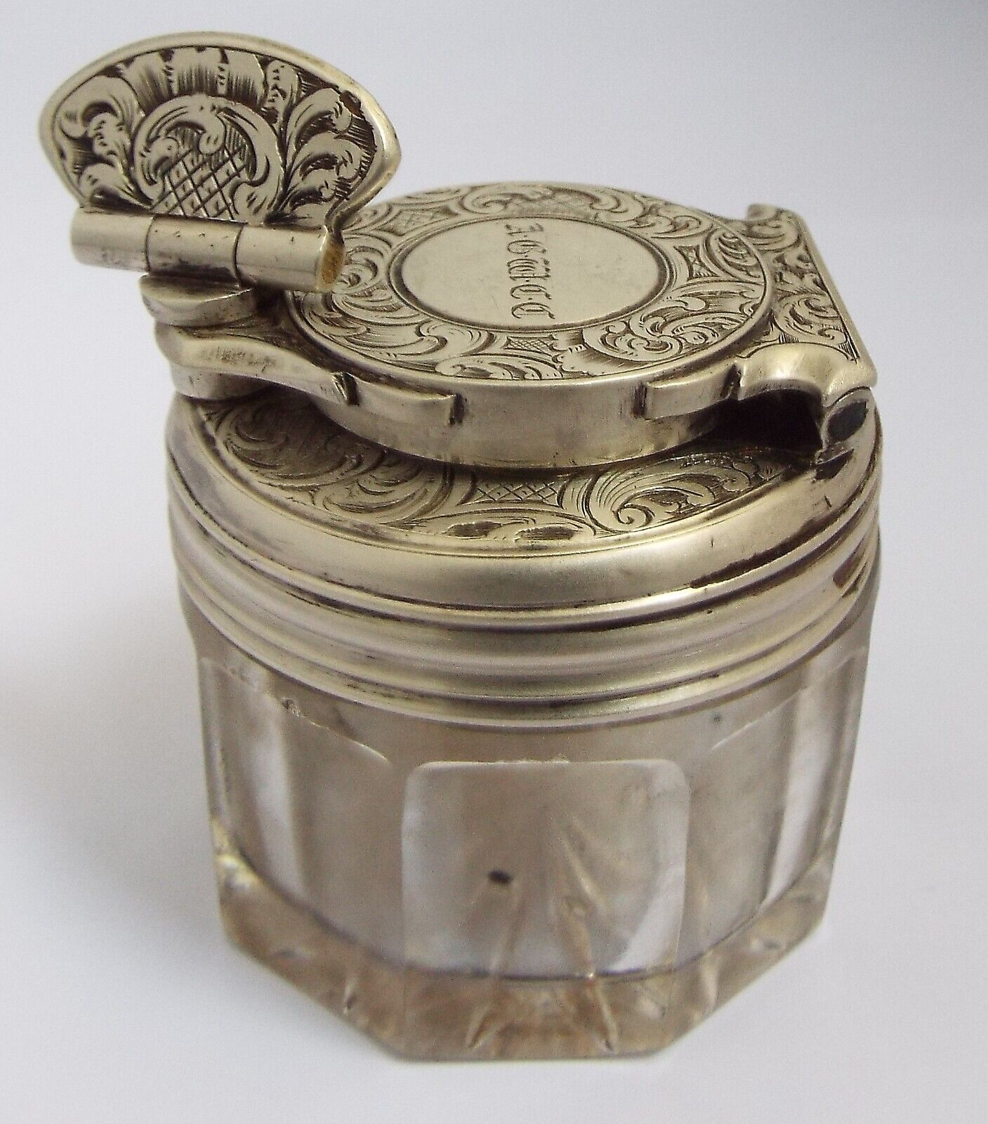 The inkwell has a full set of English silver hallmarks for London 1843 (Gothic letter “h”) with further matching silver hallmarks on the lid and key and includes the silver duty stamp of Queen Victoria. The silversmith’s initials are “F.D.” (Frances Douglas 1837-1856).