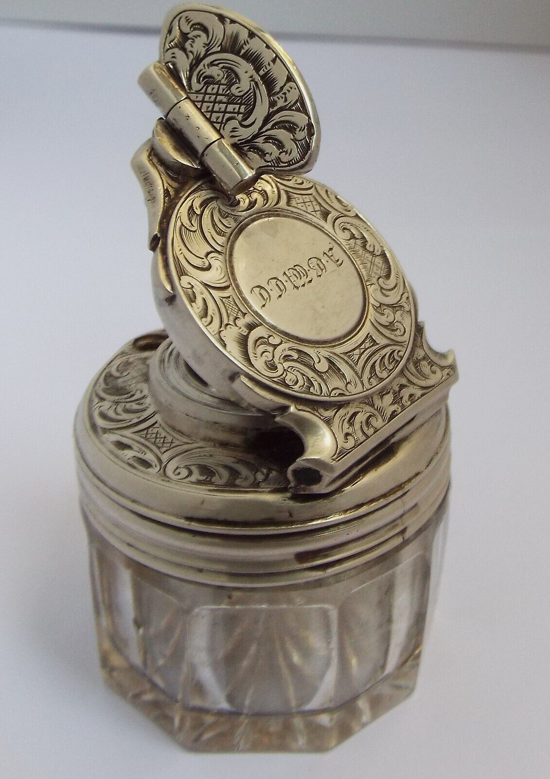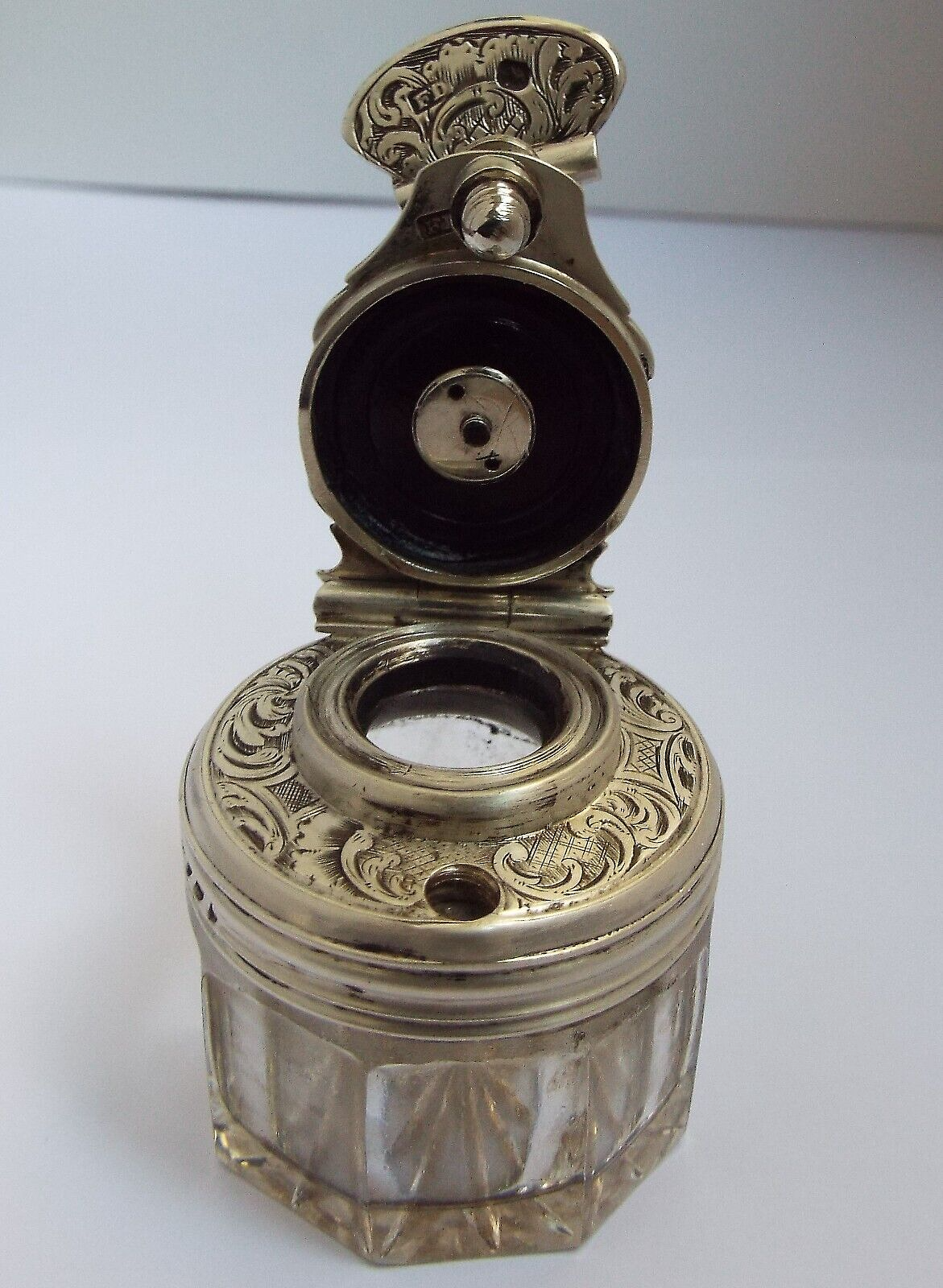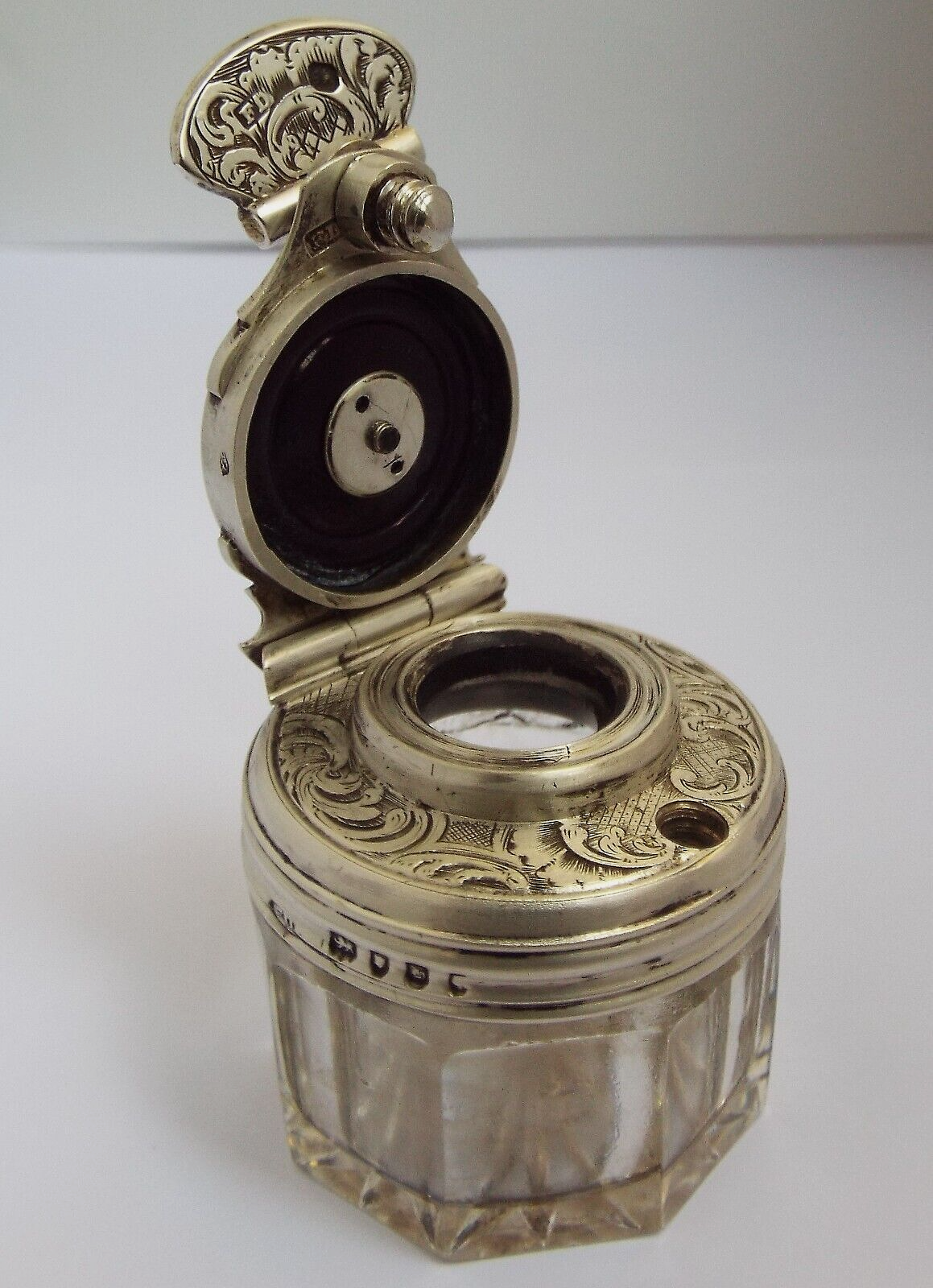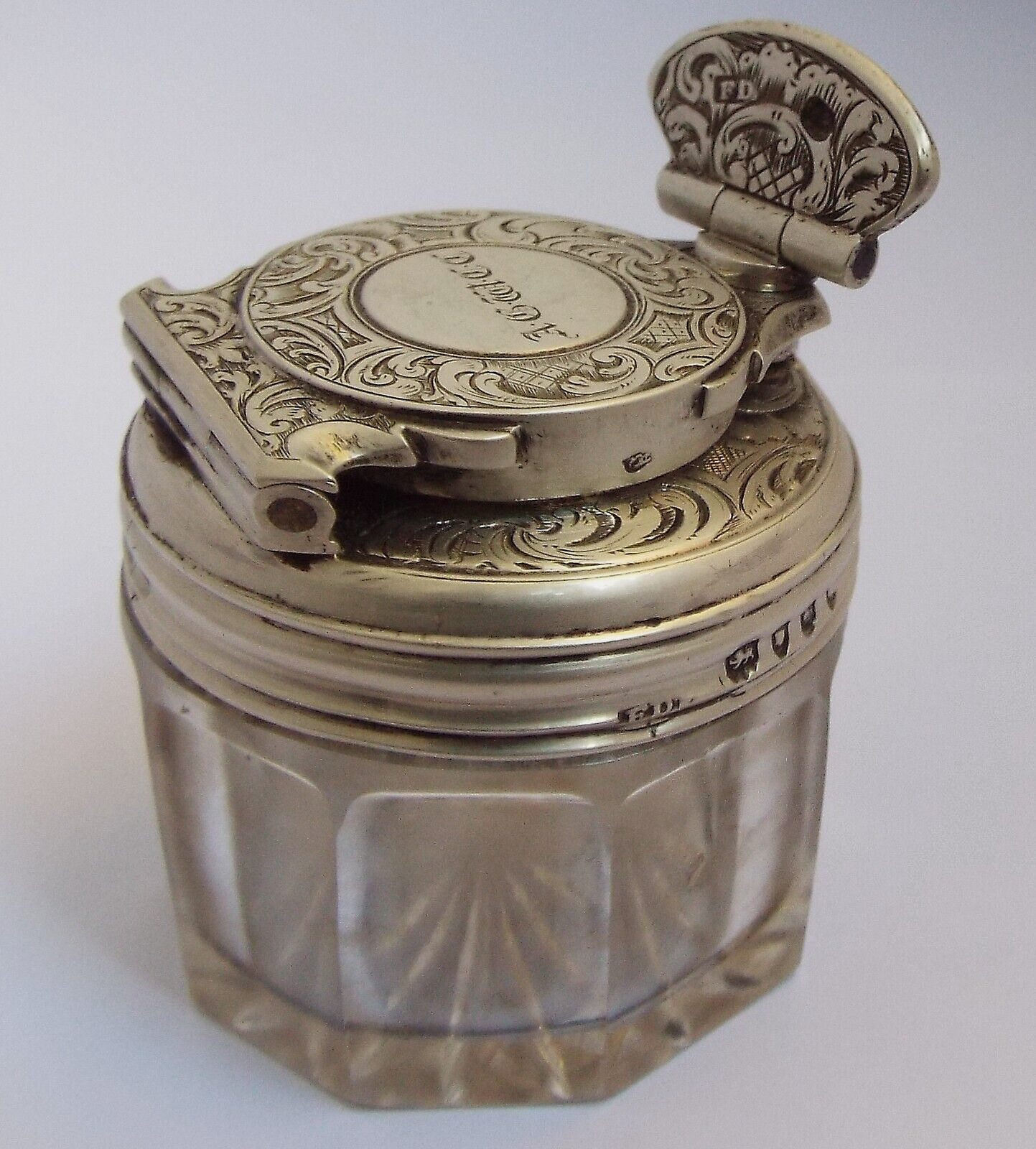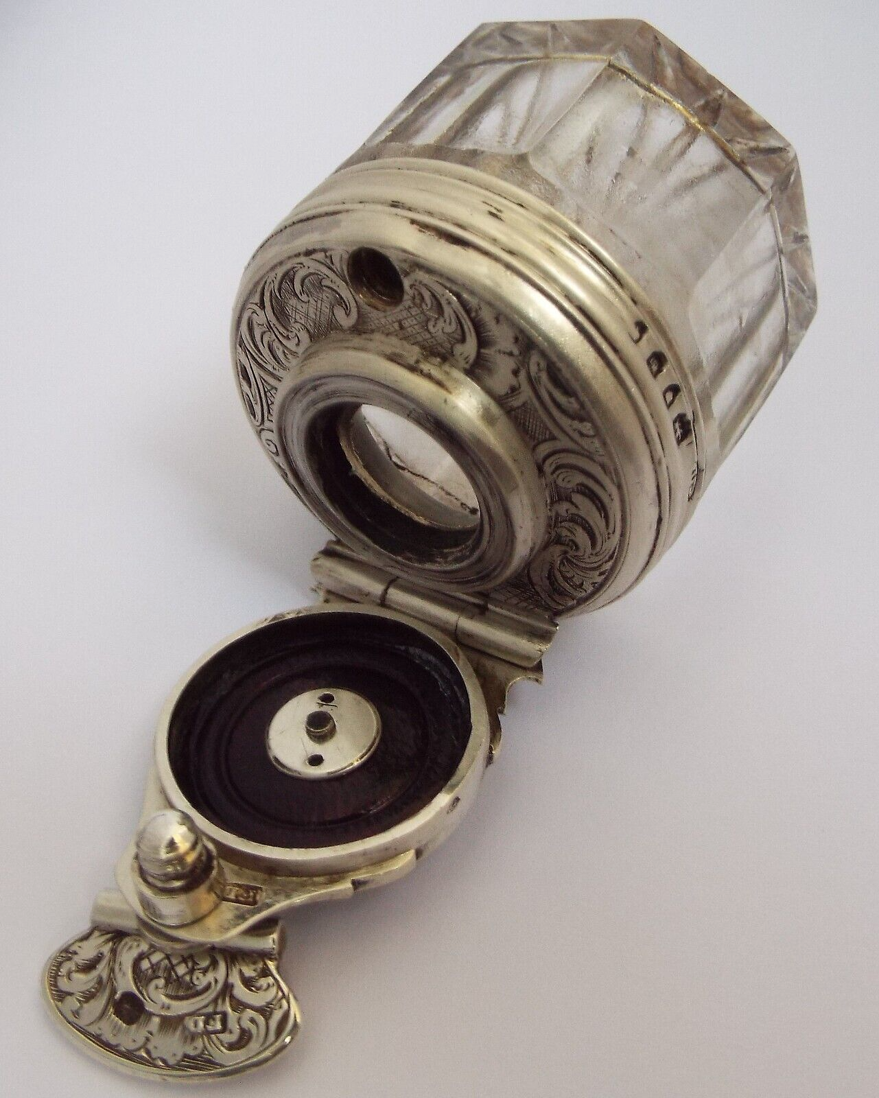 Sterling silver lock-down travel inkwell with faceted glass bottle and a silver mounted top decorated with period engraving. It has a fully working silver “screw-down” key with the original interior leather seal. There is a period Gothic monogram in the cartouche.