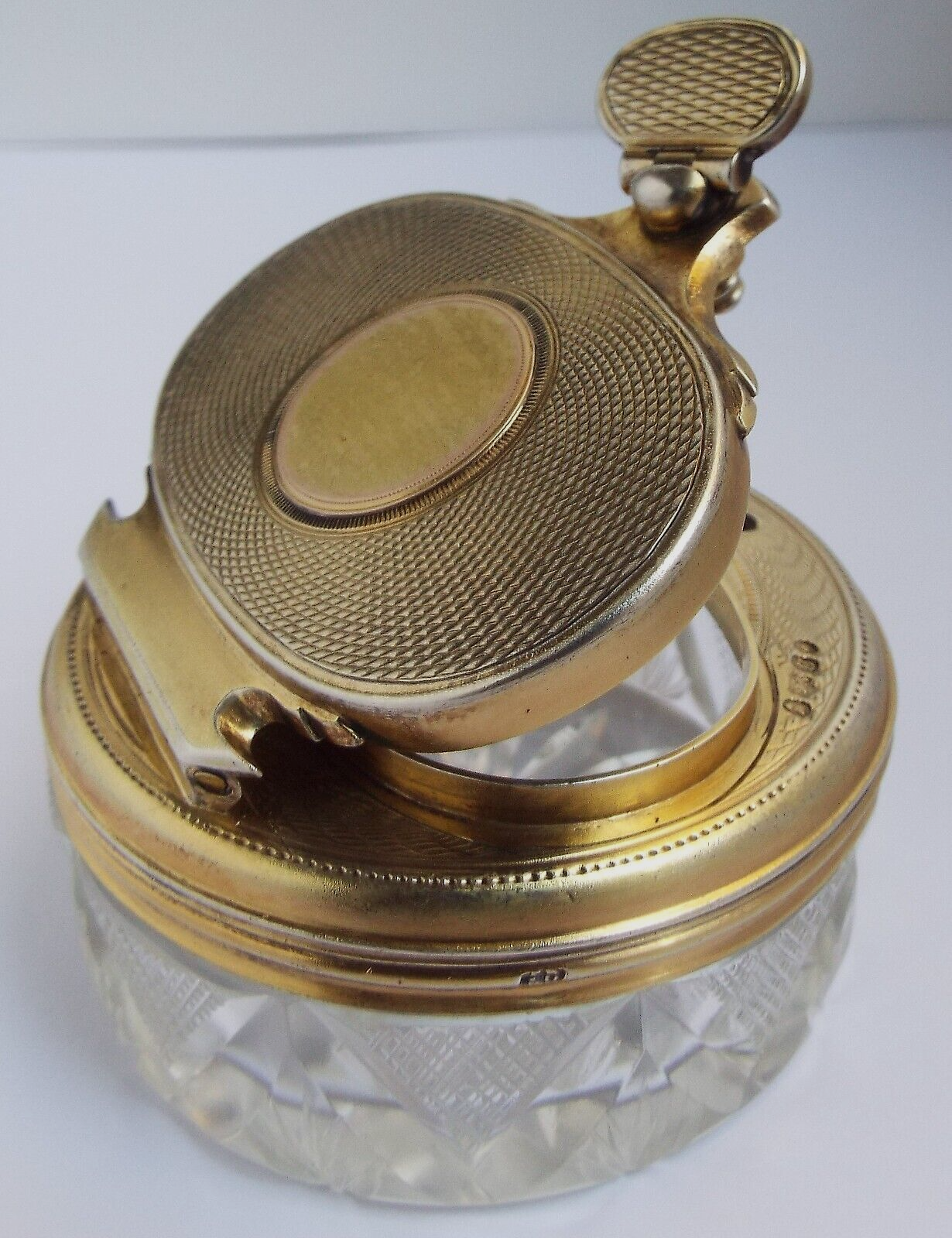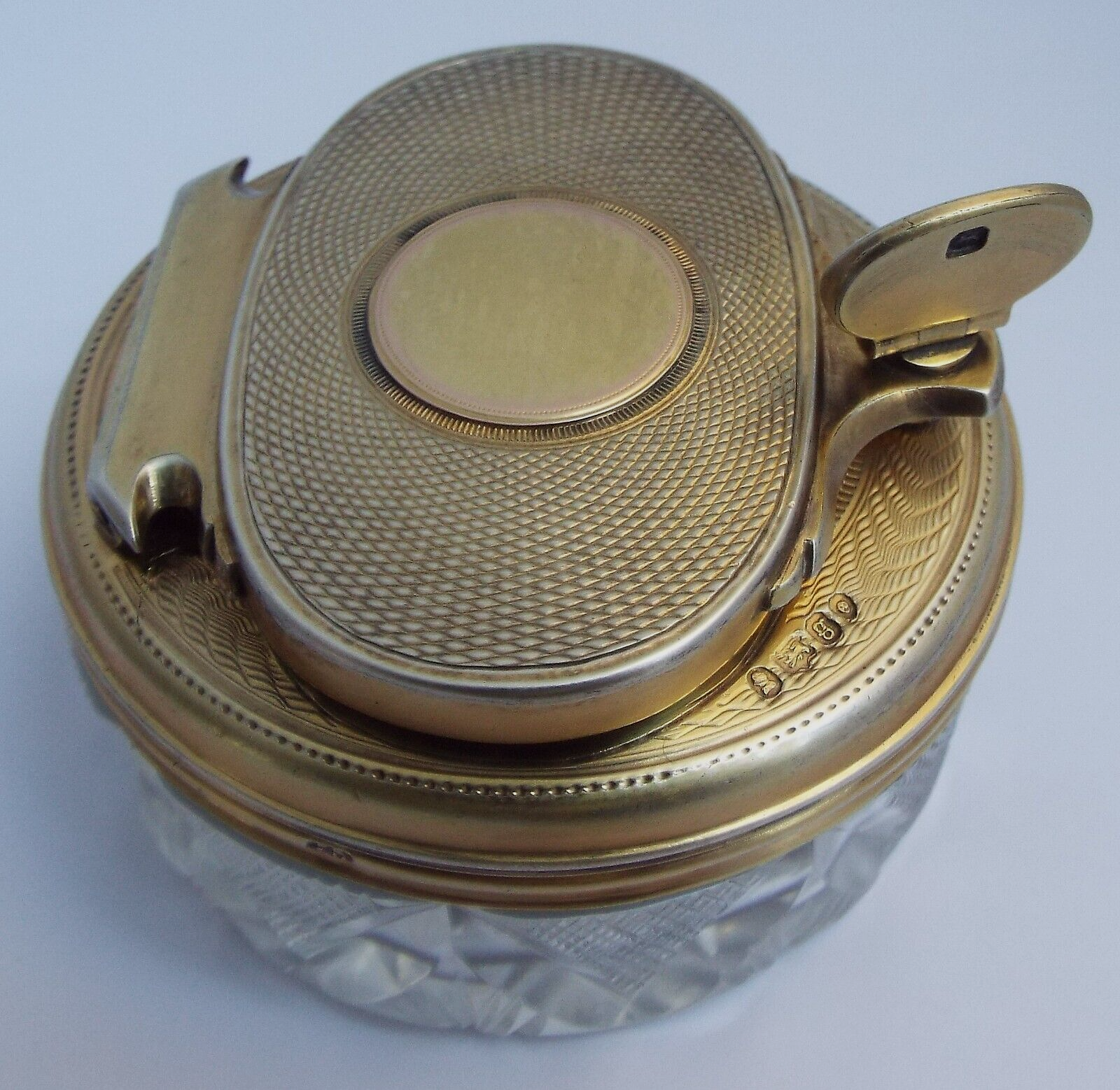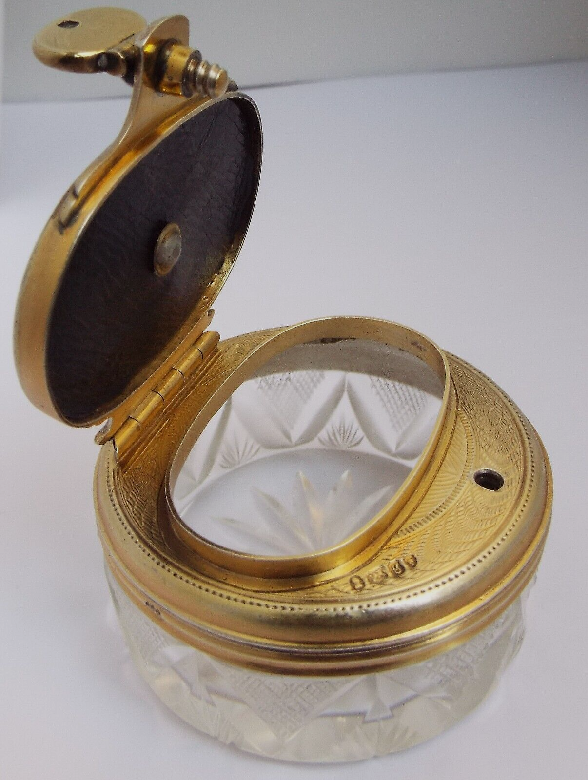 Sterling silver gilt lock-down traveling faceted glass inkwell with a decorated silver mounted top and hinged lid. It has a silver threaded screw key with interior leather seal.