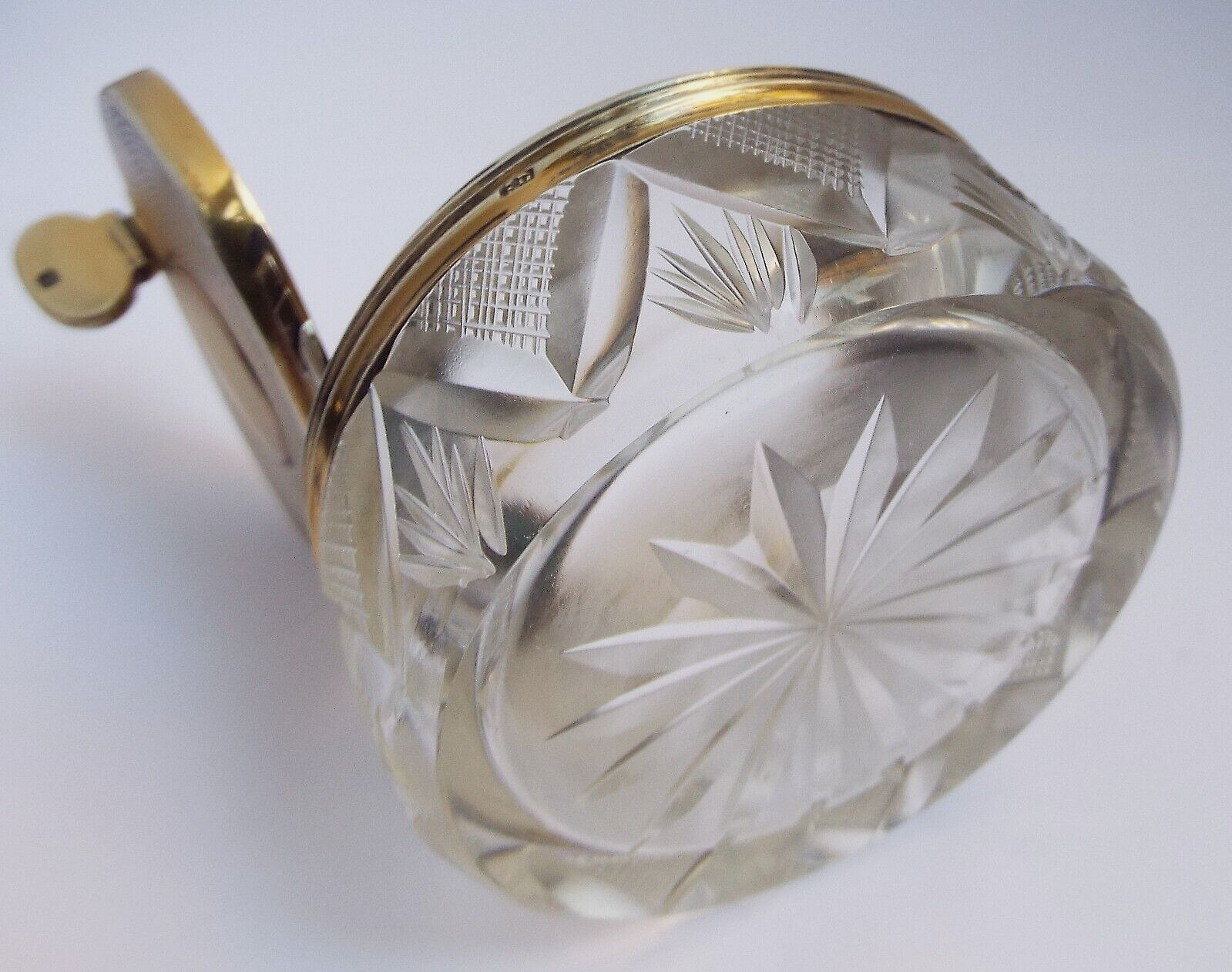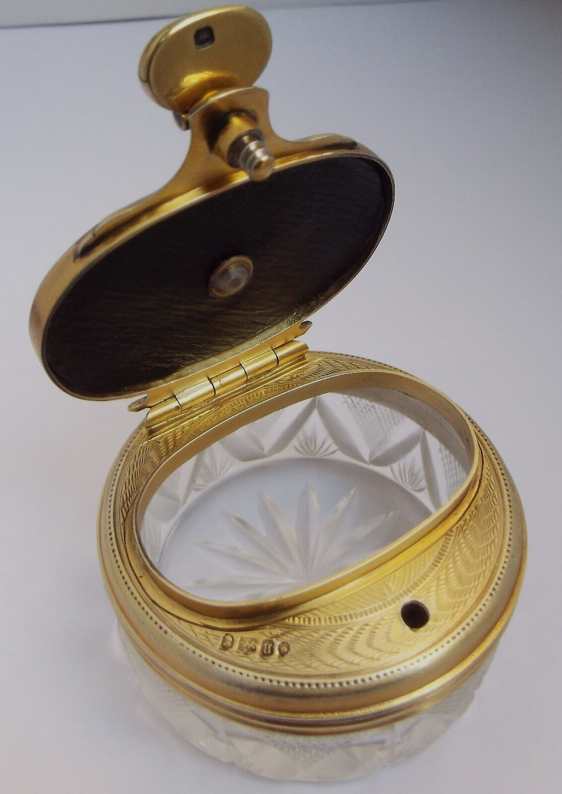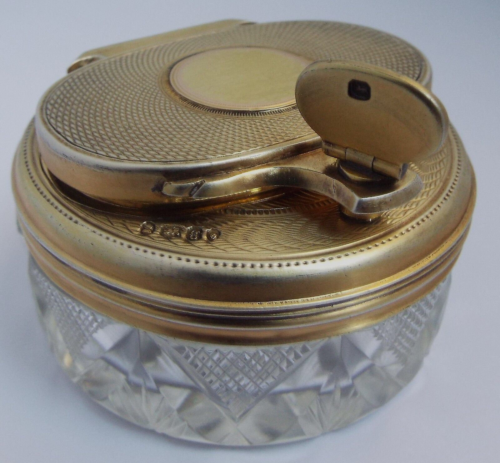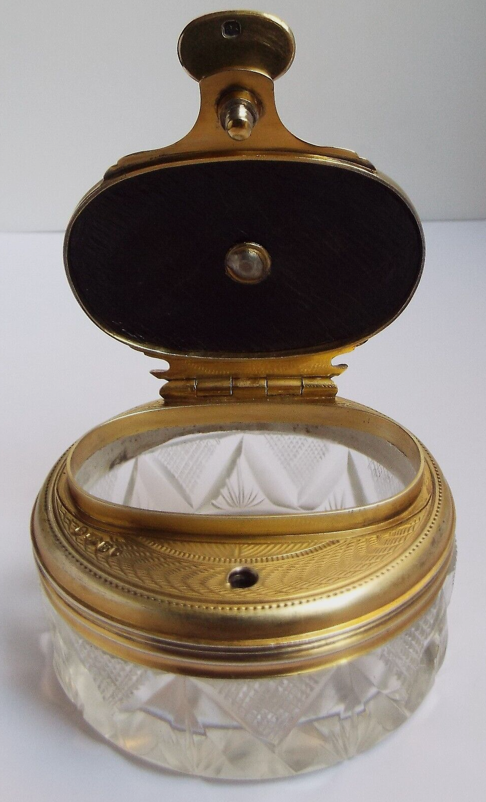 Sterling silver gilt lock-down traveling faceted glass inkwell with a decorated silver mounted top and hinged lid. It has a silver threaded screw key with interior leather seal.