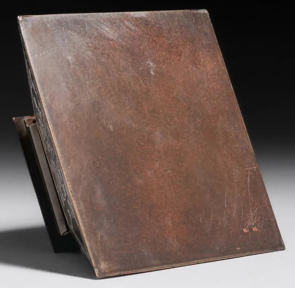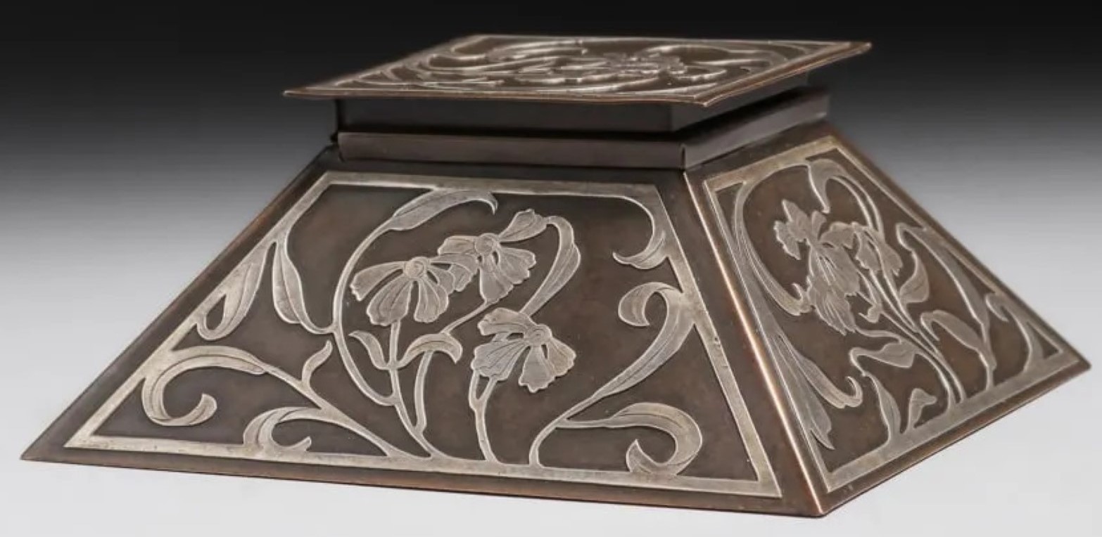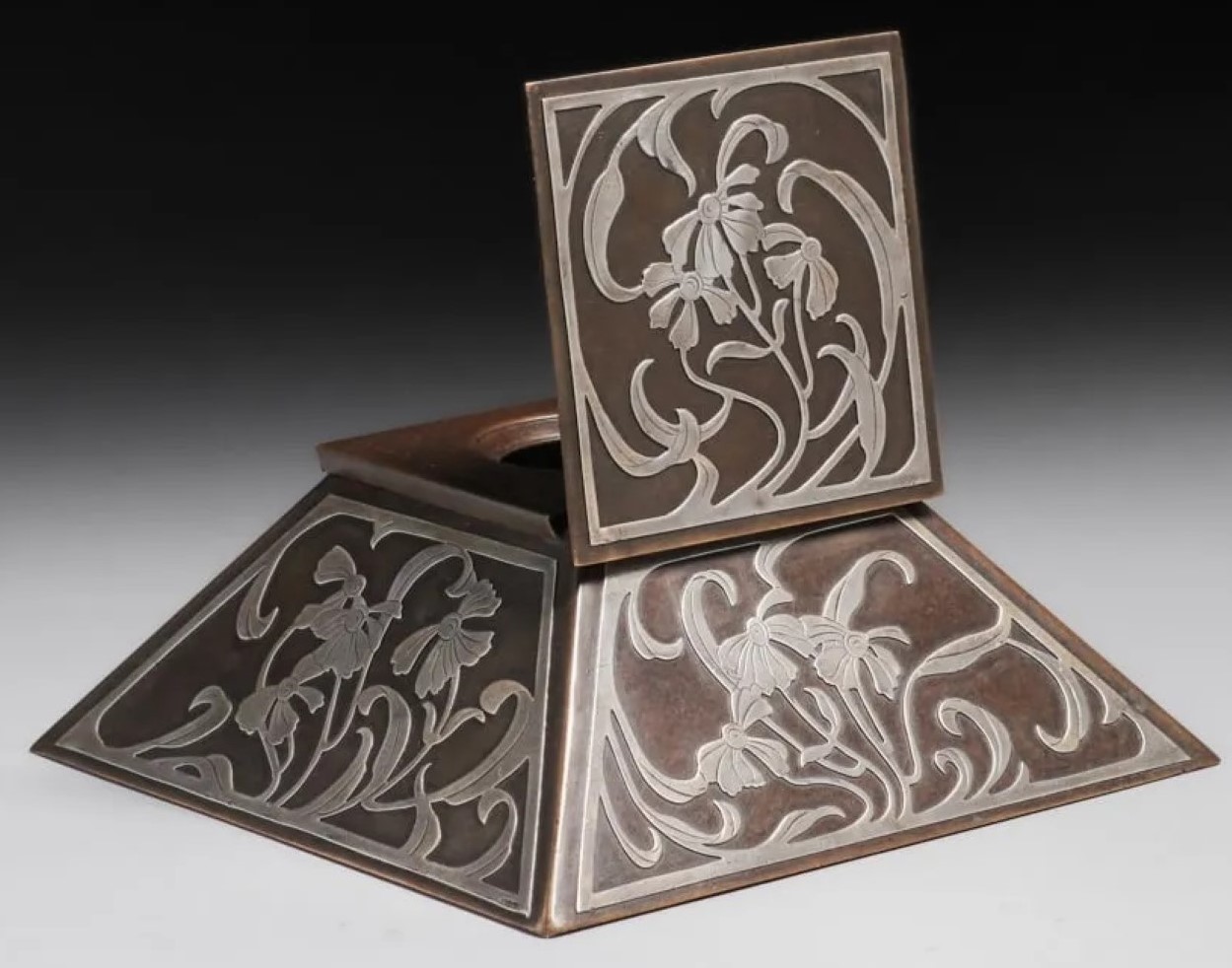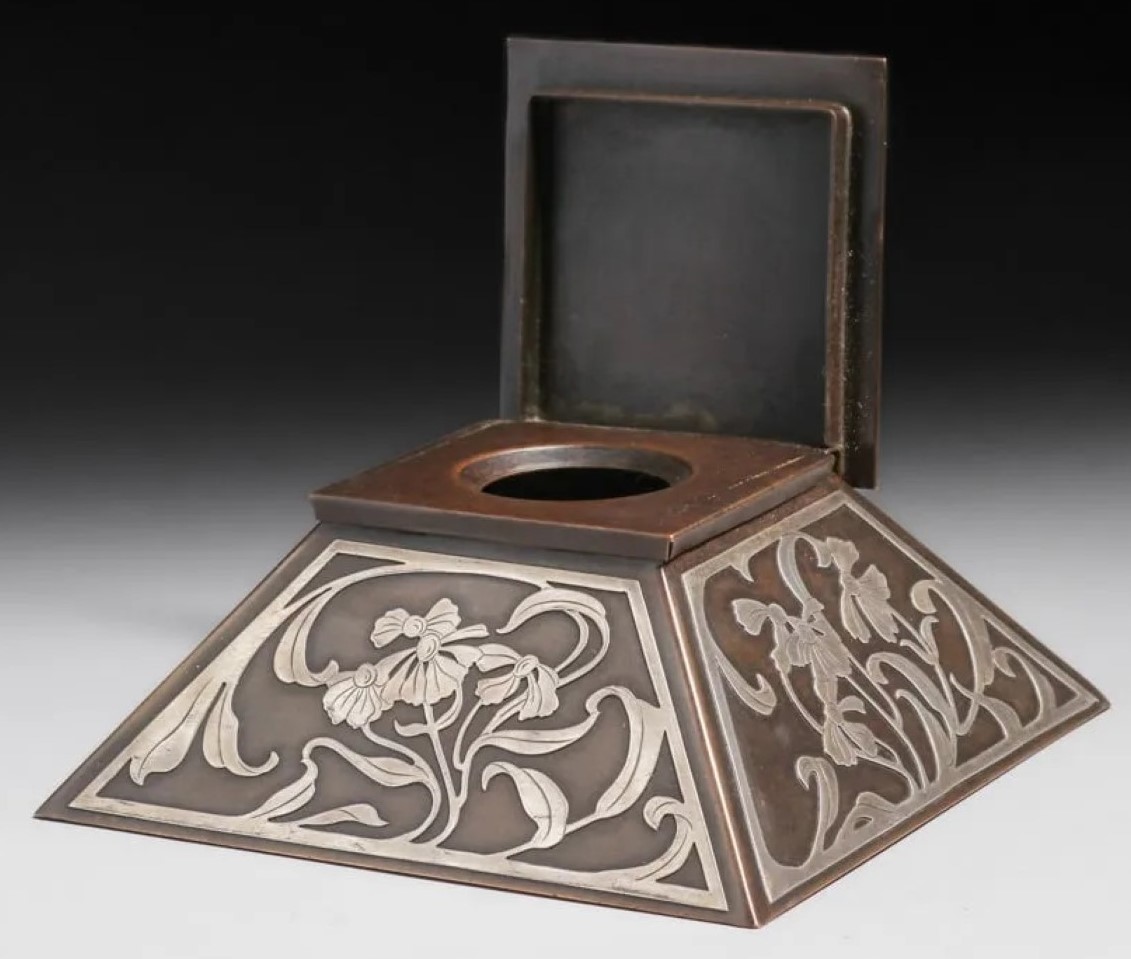 Pictured are two similar inkwells featuring sterling silver on bronze with a floral / foliate Art Nouveau design. One is only marked “Sterling” within the overlay on the lid. The other is marked on the underside “Art Crafts Shop” which later became Heintz. These are early examples of Heintz use of sterling overlay.