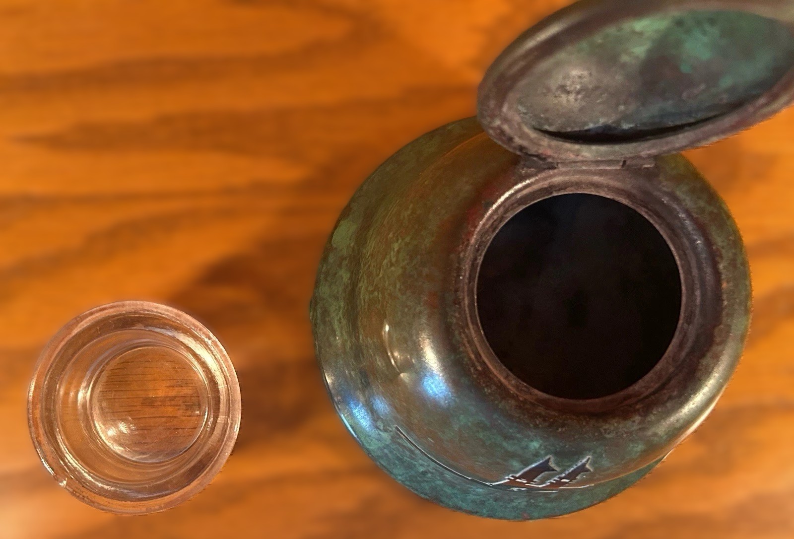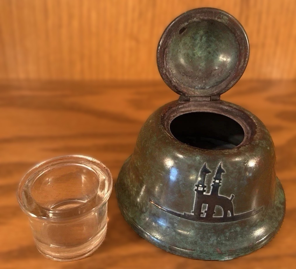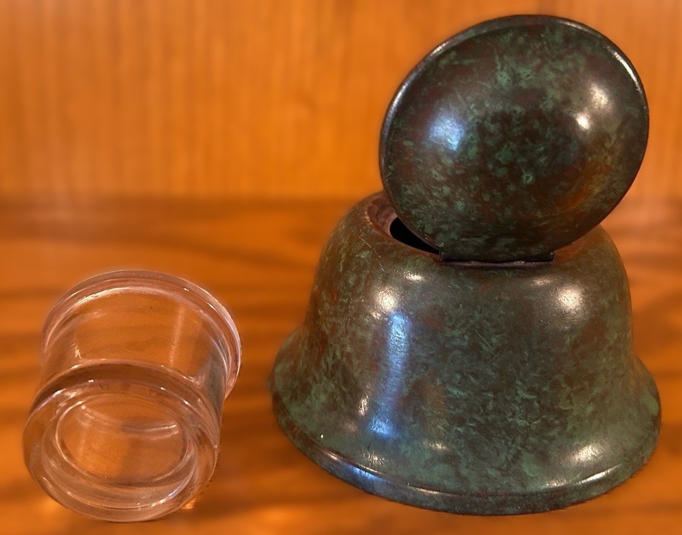 - Lid & Interior: The top features a circular, low-domed hinged lid. When opened, it reveals the inkwell with its original clear glass liner.