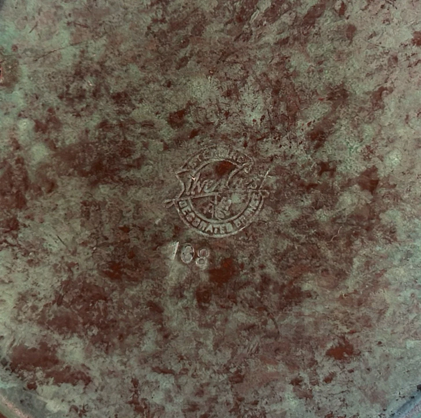 The Silver Crest trademark belonged to the Smith Metal Arts Company (SMAC), founded in 1919 by Frederick Smith. Smith was previously the head salesman for the famous Heintz Art Metal Shop. After Otto Heintz died in 1918, Smith started his own firm, bringing many of the craftsmen and patterns with him. Because this piece bears the Silver Crest mark rather than the Heintz diamond mark, it cannot pre-date 1919.