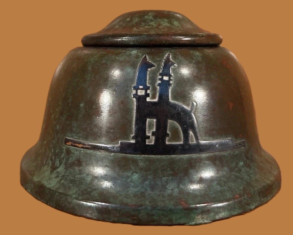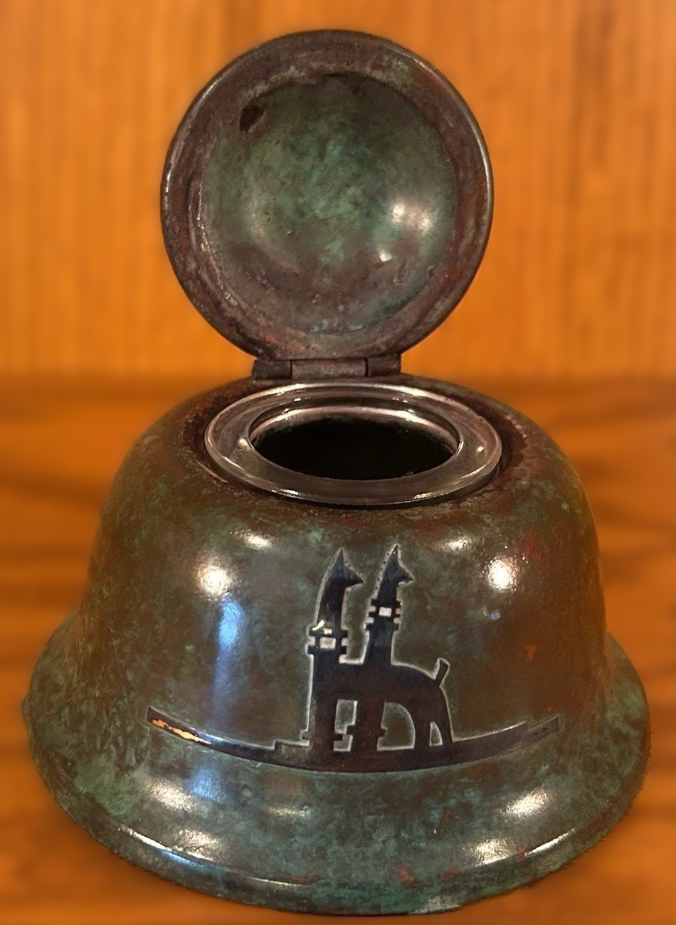 This is an example of Arts and Crafts era metalwork, specifically the “Sterling on Bronze” technique that became a signature of high-end desk accessories in the early 20th century.