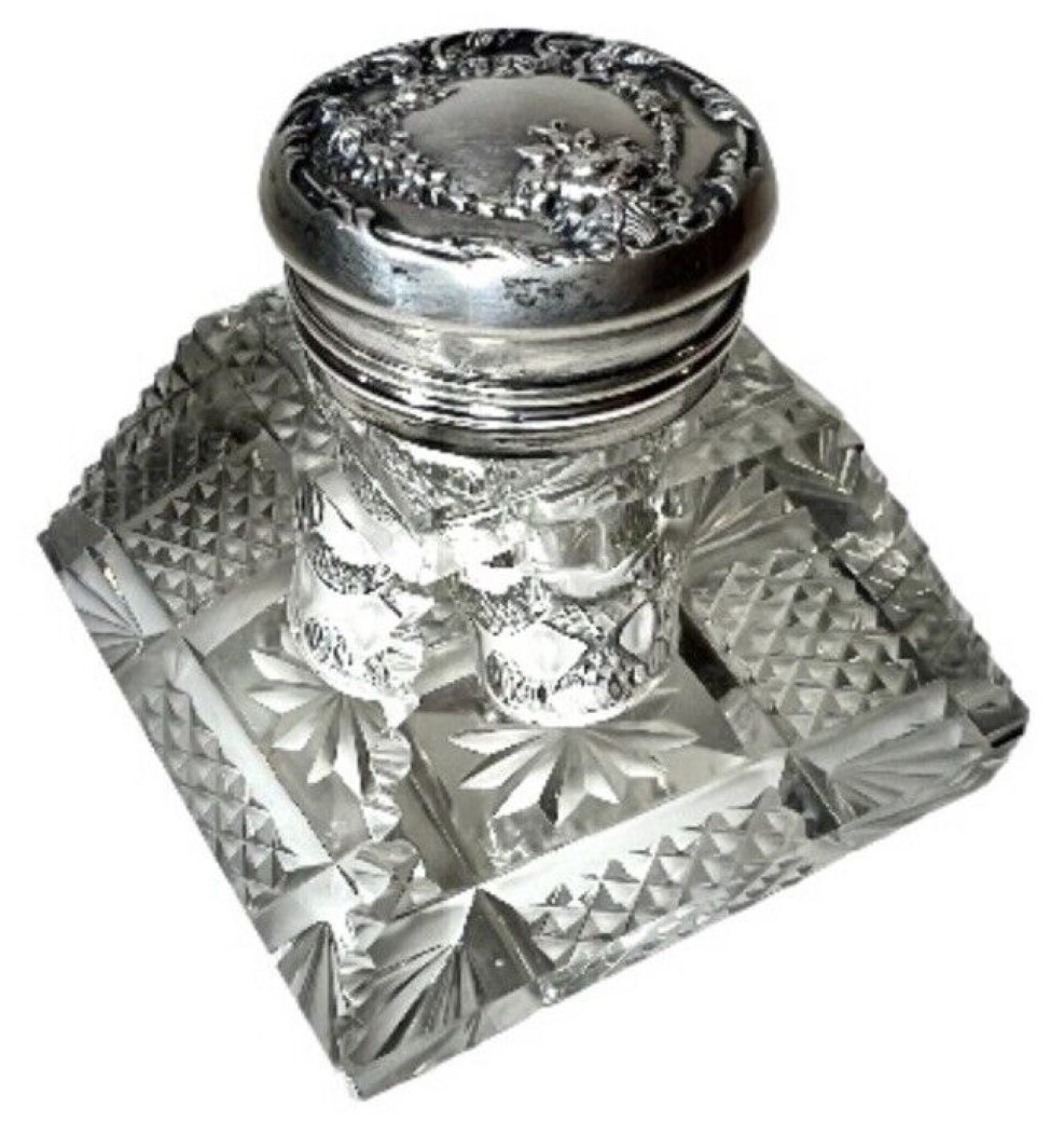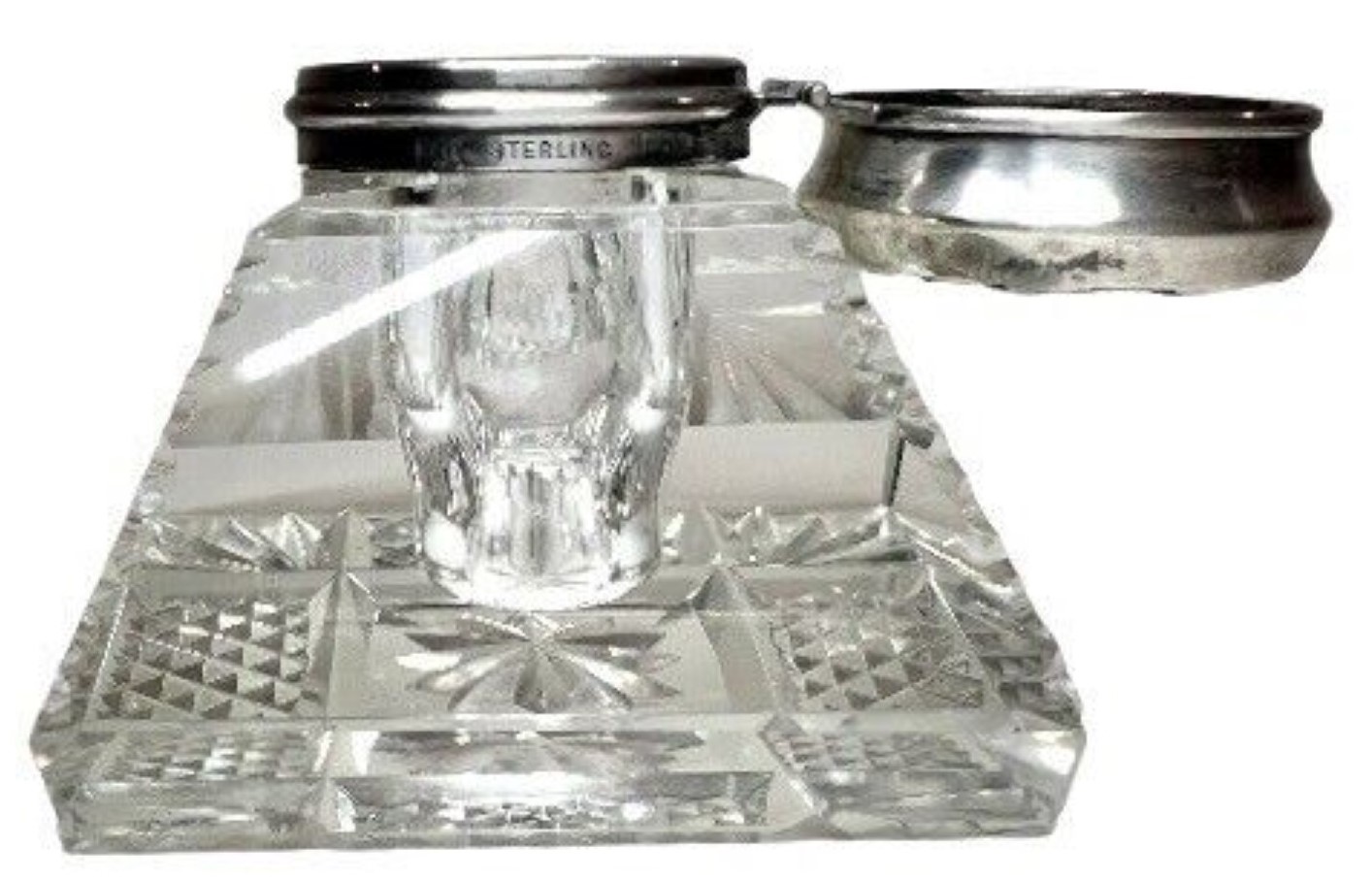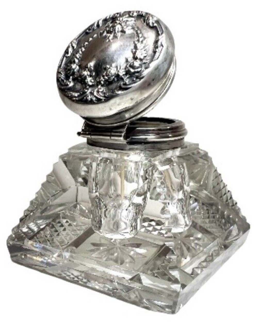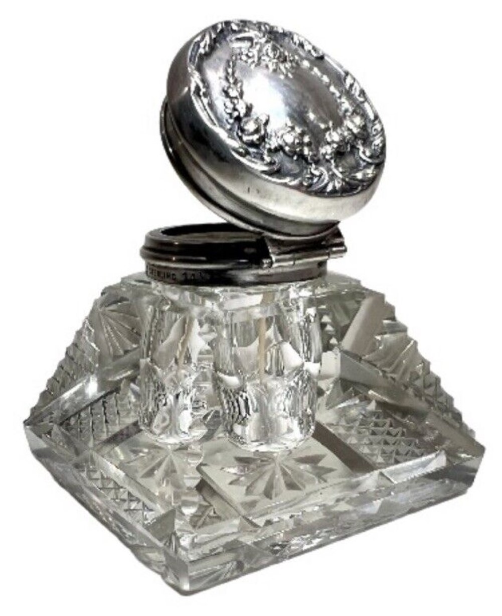 Pyramid shape with sawtooth edges and cut corners at the base, and a cut starburst and grid pattern on the bottom. The hand-chased repousse hinged silver lid with floral motif has no monogram. This inkwell was made by Theodore Foster & Bros from Providence, Rhode Island. It is hallmarked “F&B inside a flag + Sterling + 1410” (model number).