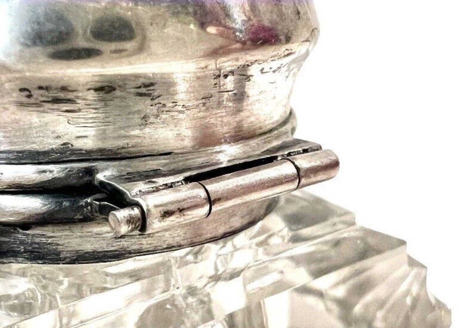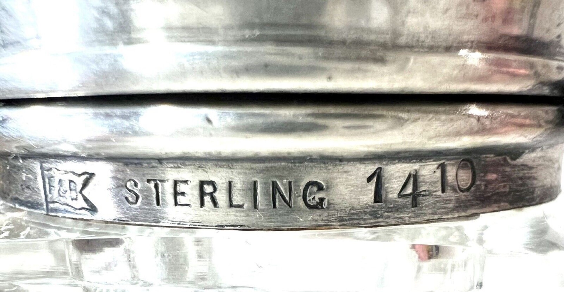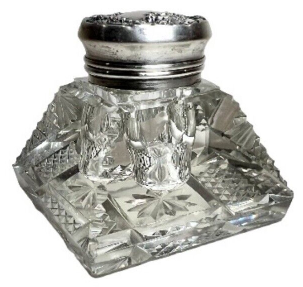 Pyramid shape with sawtooth edges and cut corners at the base, and a cut starburst and grid pattern on the bottom. The hand-chased repousse hinged silver lid with floral motif has no monogram. This inkwell was made by Theodore Foster & Bros from Providence, Rhode Island. It is hallmarked “F&B inside a flag + Sterling + 1410” (model number).
