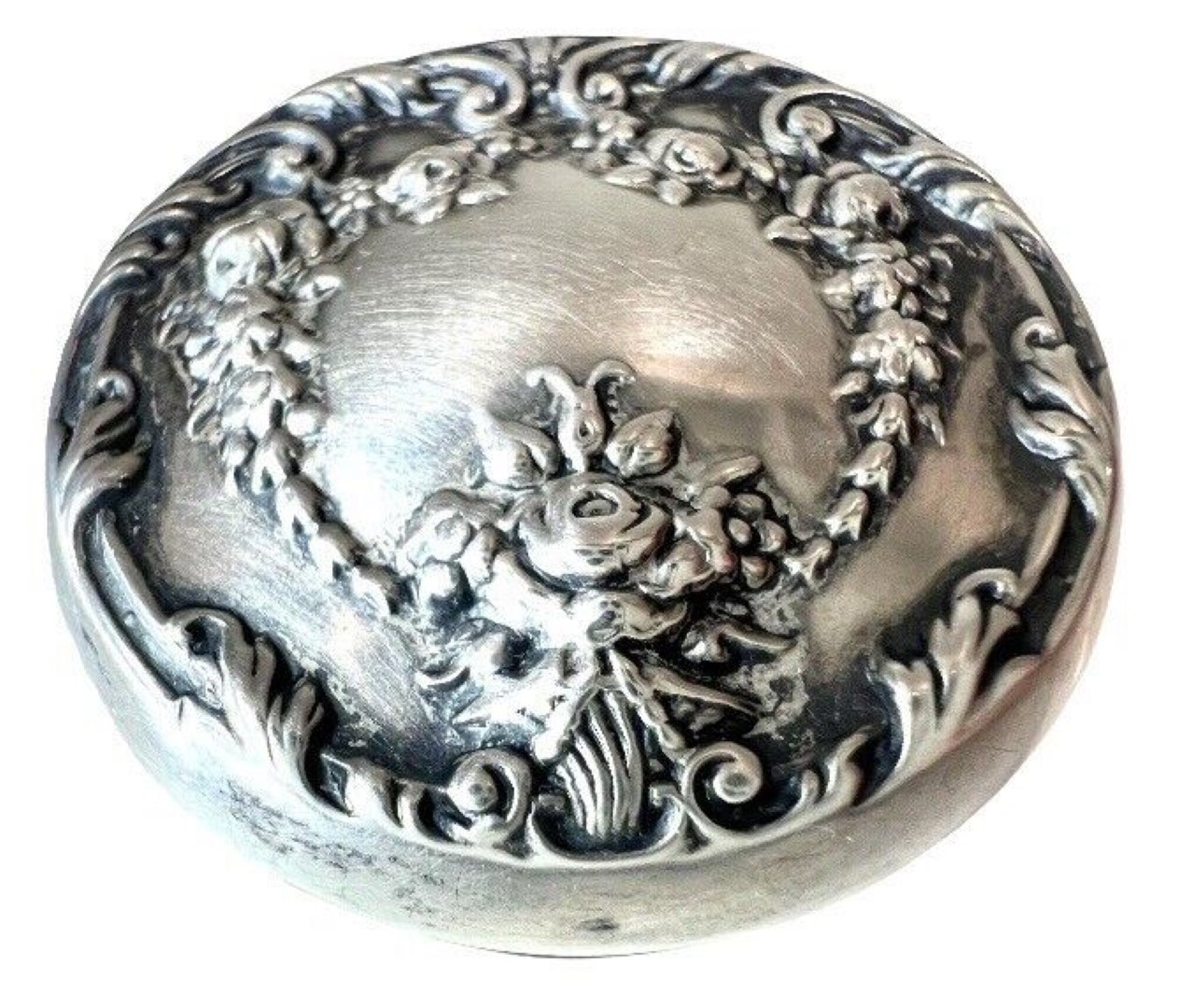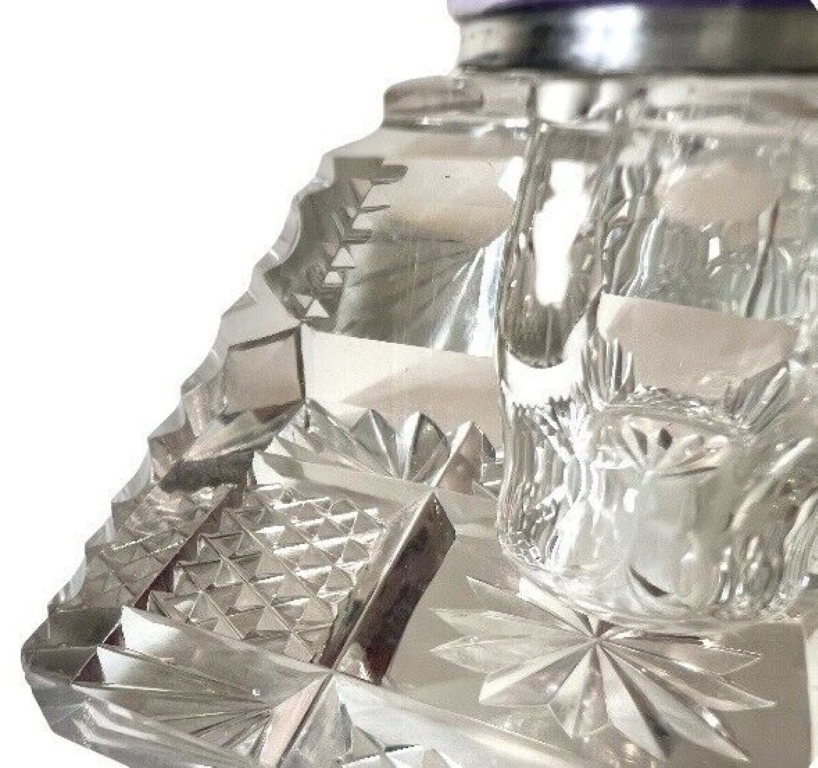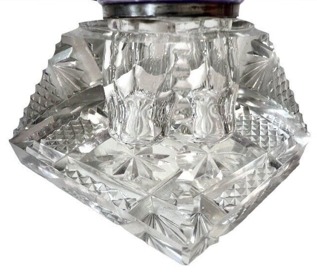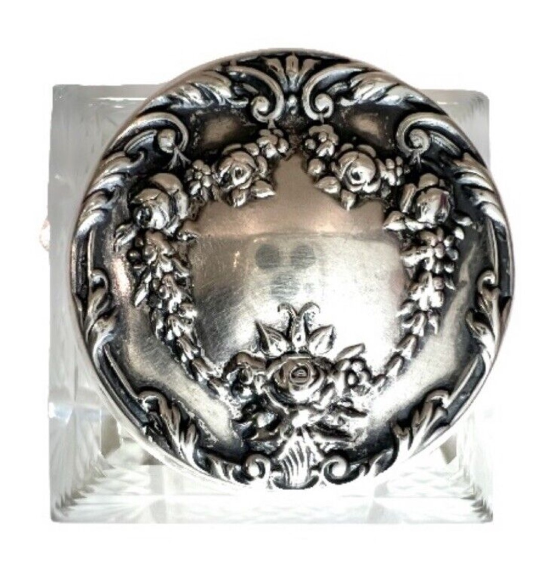 Pyramid shape with sawtooth edges and cut corners at the base, and a cut starburst and grid pattern on the bottom. The hand-chased repousse hinged silver lid with floral motif has no monogram. This inkwell was made by Theodore Foster & Bros from Providence, Rhode Island. It is hallmarked “F&B inside a flag + Sterling + 1410” (model number).