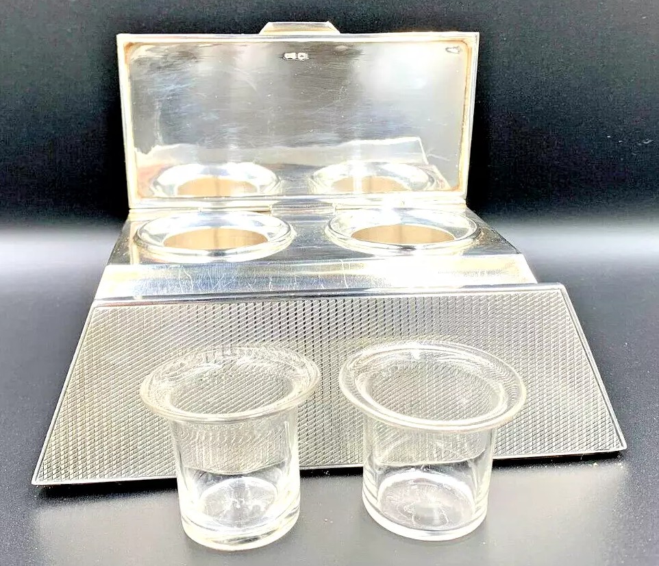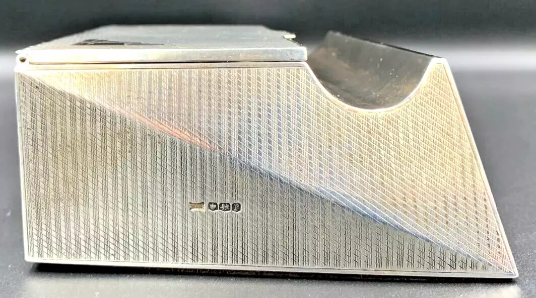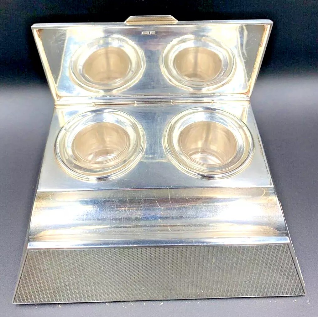 This sterling silver Art Deco inkstand has the clean lines, geometric patterns, and streamlined design characteristic of the period.