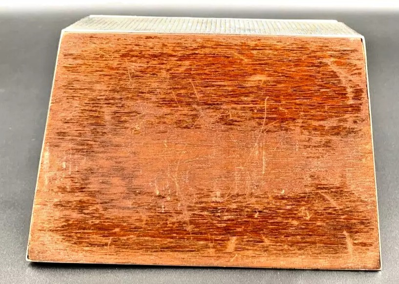 - Smooth Surfaces: The front and back of the inkstand have smooth, polished surfaces, creating a contrast with the engine-turned decoration. The piece has a wood bottom.