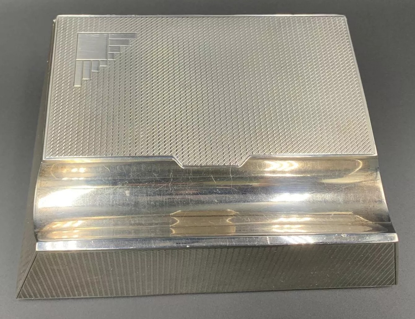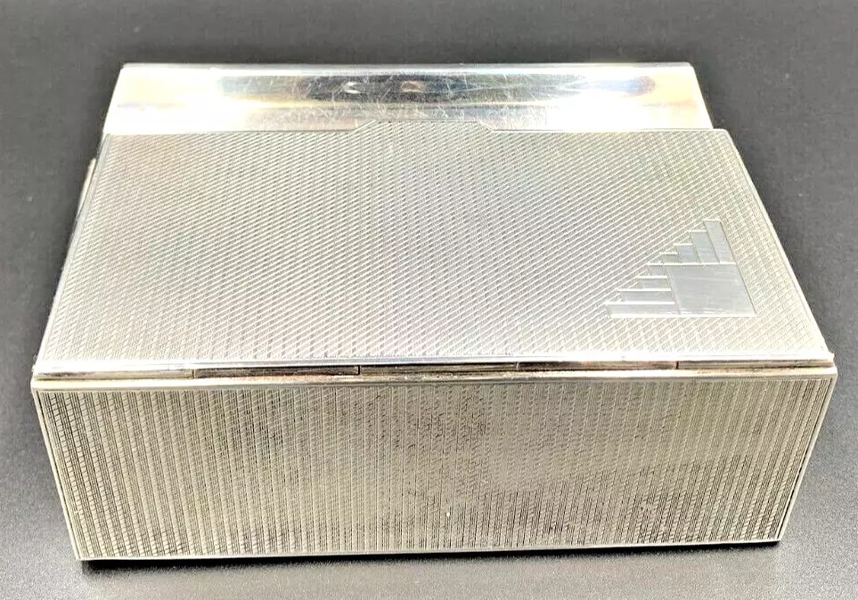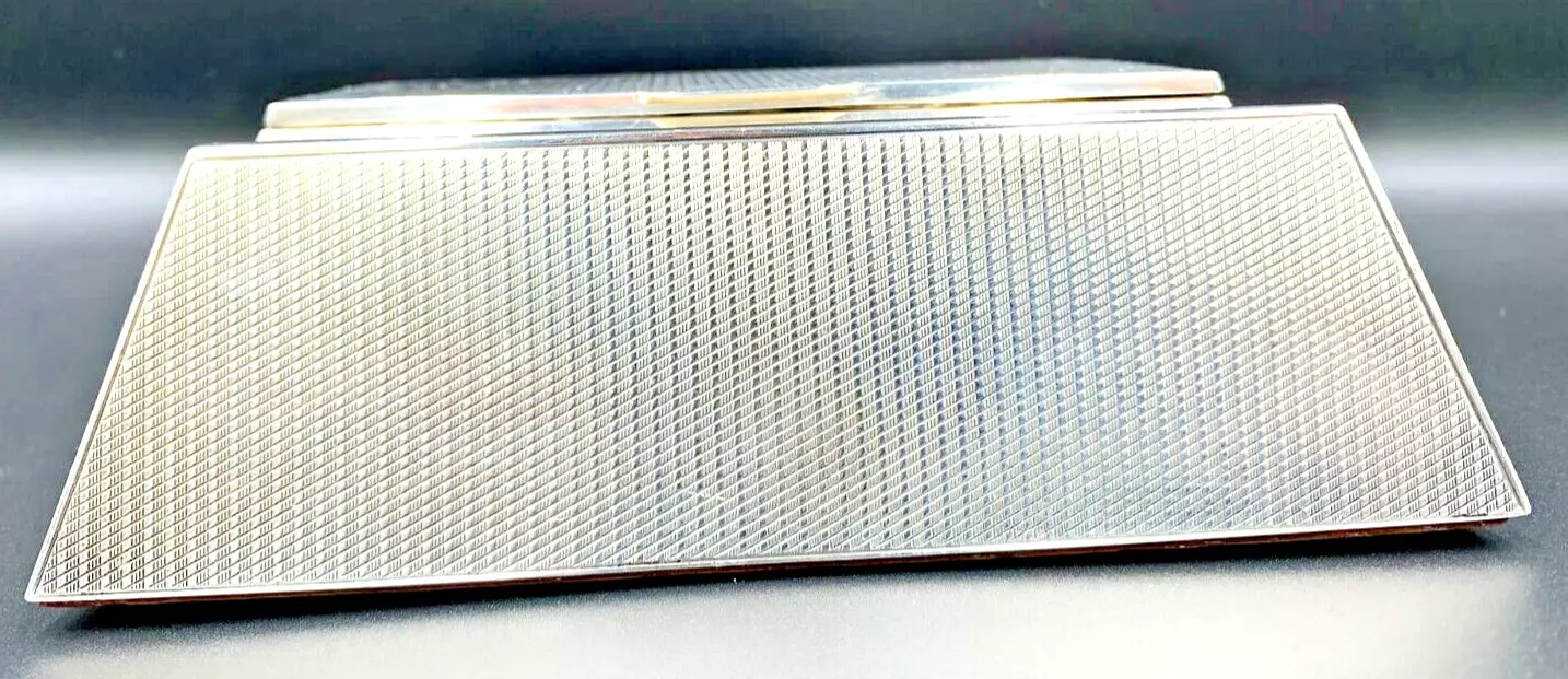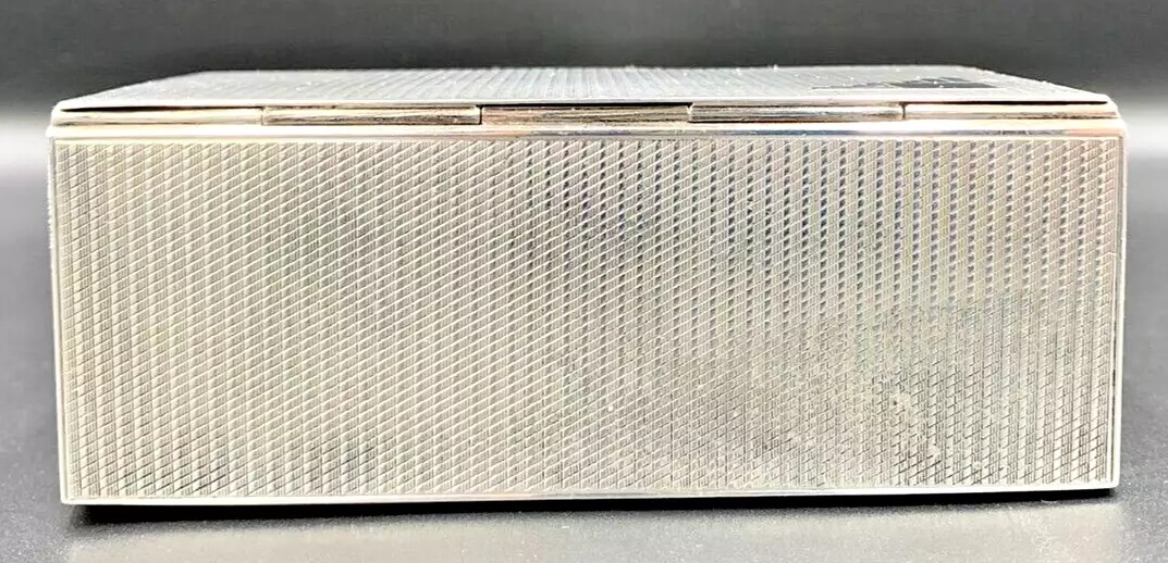 - Engine Turning: The top surface of the hinged lid and the sides of the base are decorated with engine turning. This technique creates intricate geometric patterns by cutting precise lines into the metal surface.