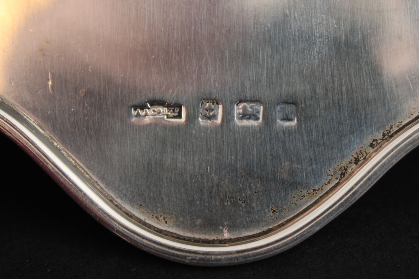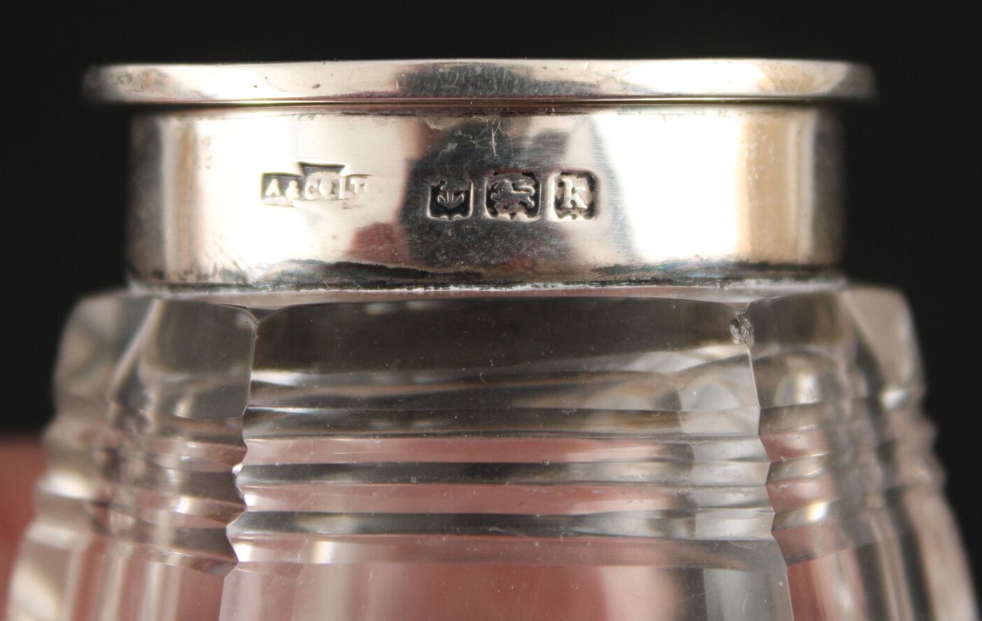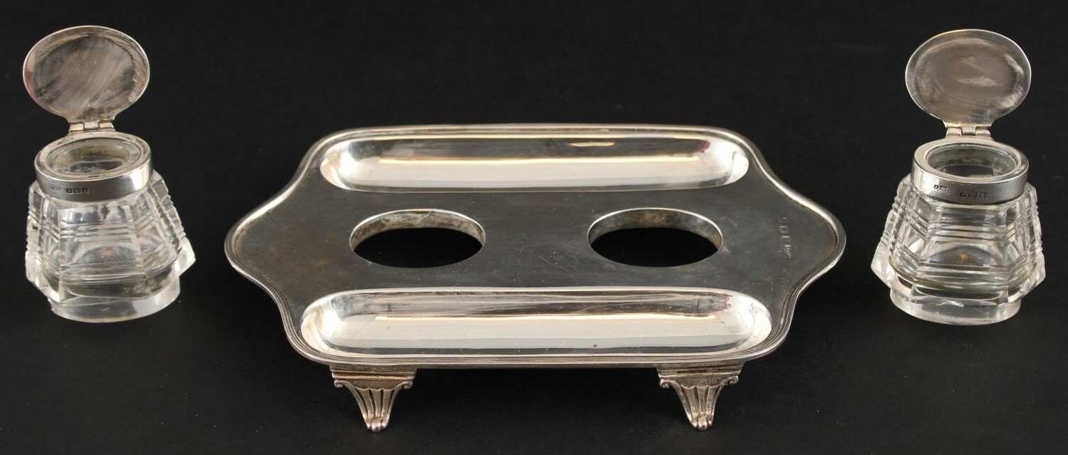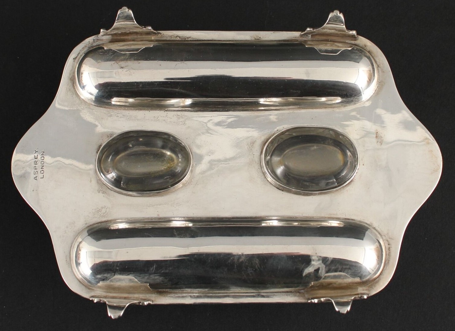 Two cut glass inkwells with hinged silver lids sit on a sterling silver footed tray with two pen channels. All pieces are hallmarked for the maker, Asprey, Birmingham, England in 1909.