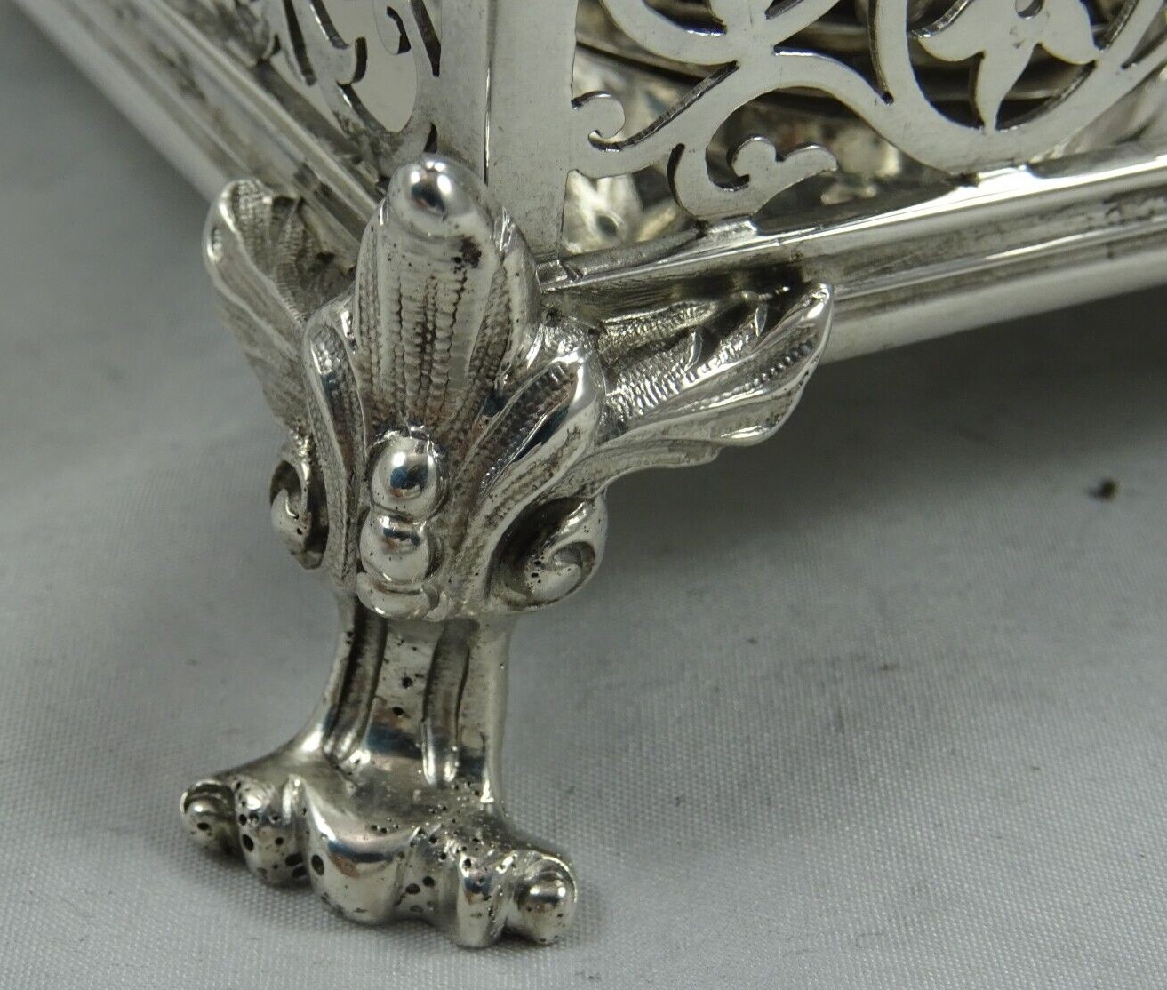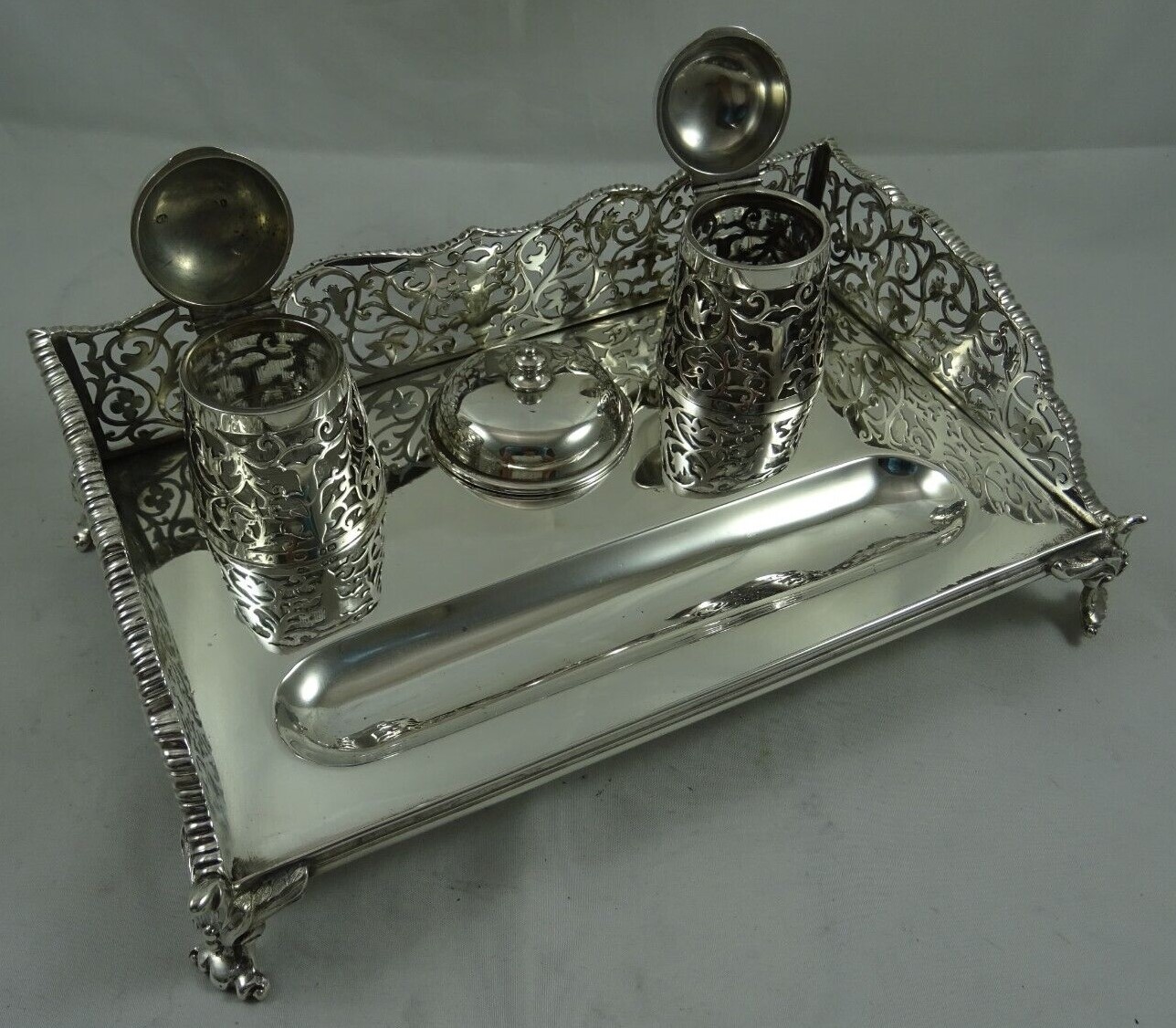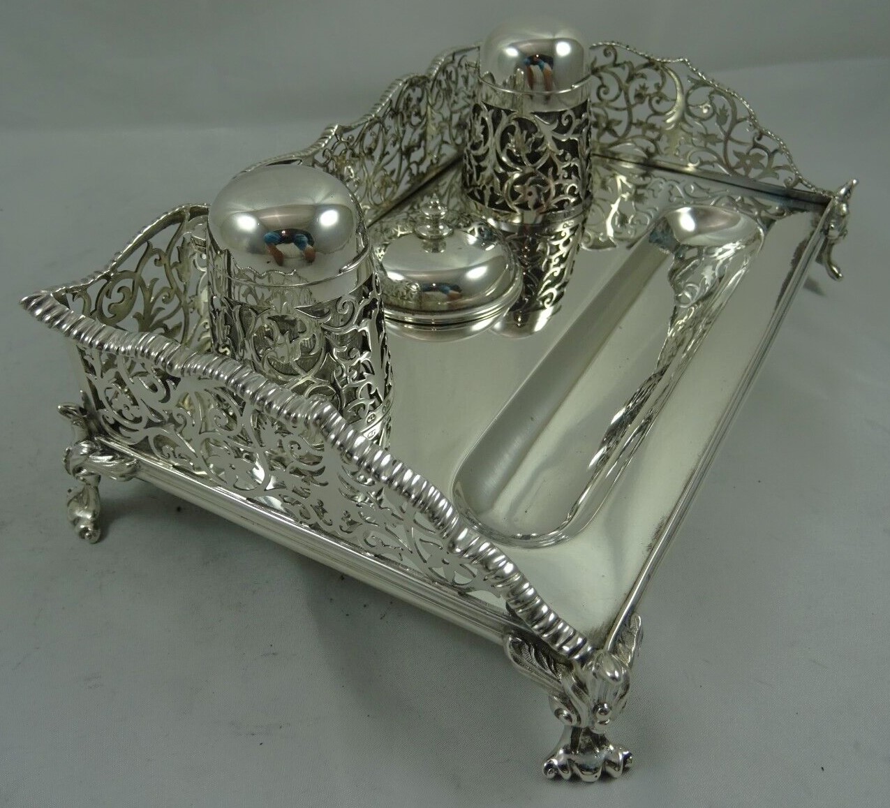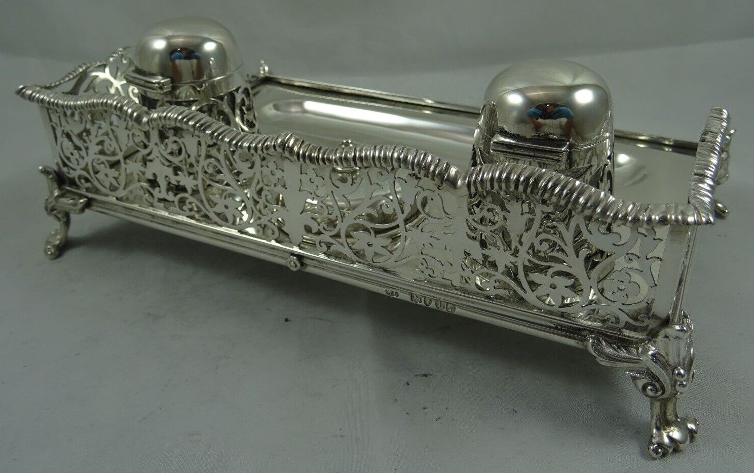 A Victorian sterling silver inkstand of rectangular form with pierced gallery, a gadroon rim, and acanthus scrolling feet. It holds a pair of inkwells with domed lids and glass inserts. A lidded storage area is in the middle.