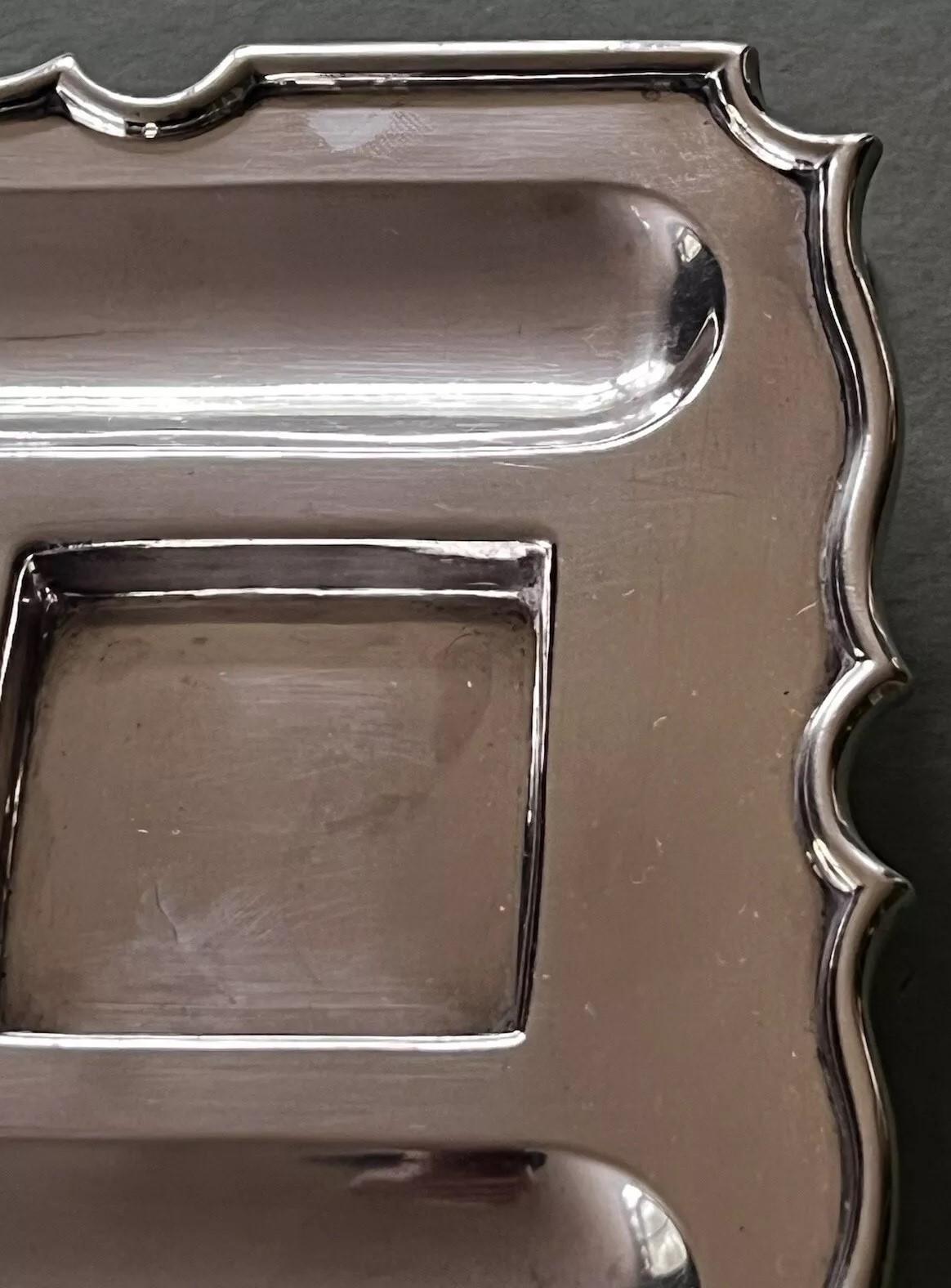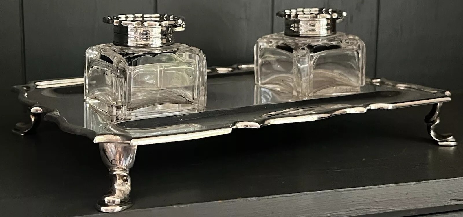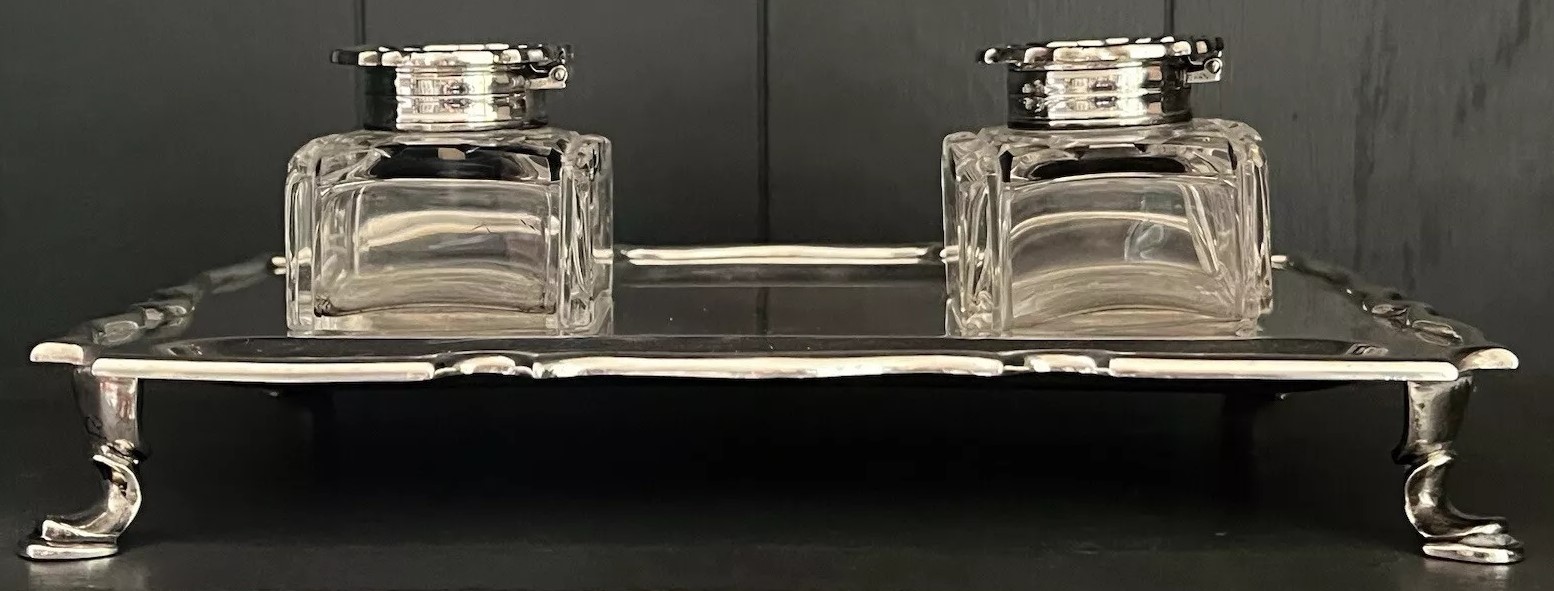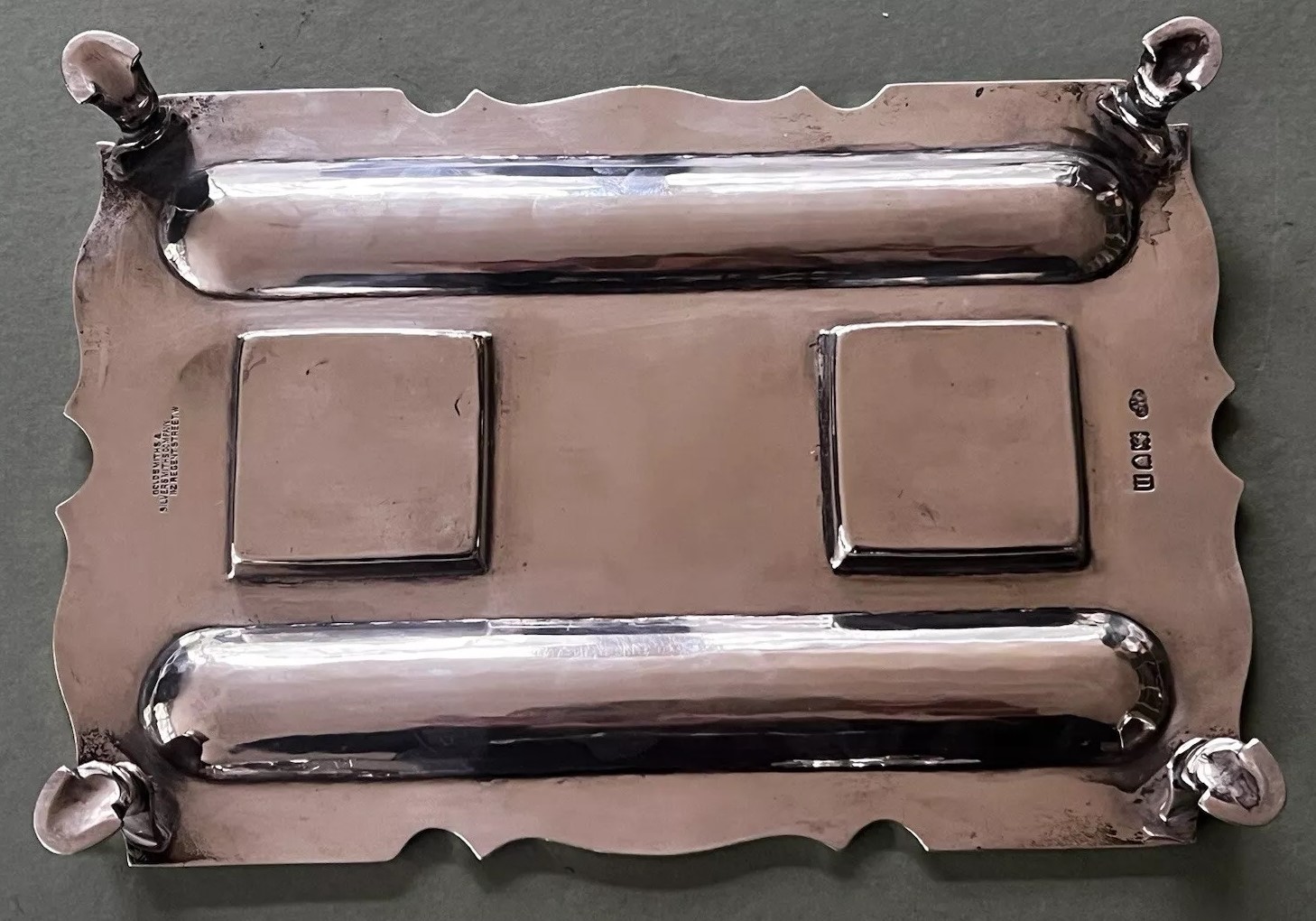A sterling silver inkstand by Goldsmiths & Silversmiths Company of Regent Street, London. It features a tray on four splayed feet with scalloped edges and two rounded recesses to hold pens. Crisp and clear hallmarks date the piece to London, 1908. Two square spaces hold faceted inkwells, both fully hallmarked. The lids have plain centers and scalloped edges, matching the tray.