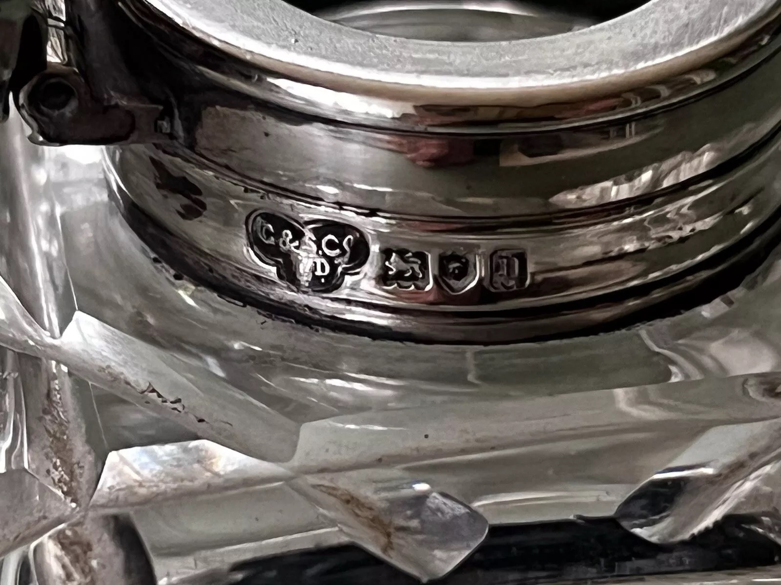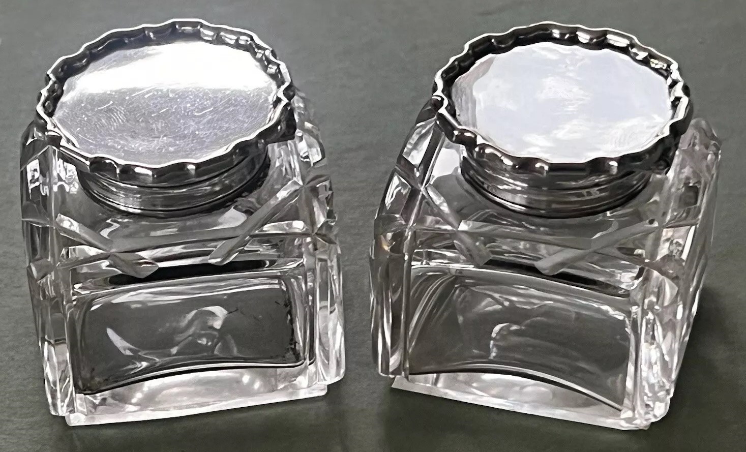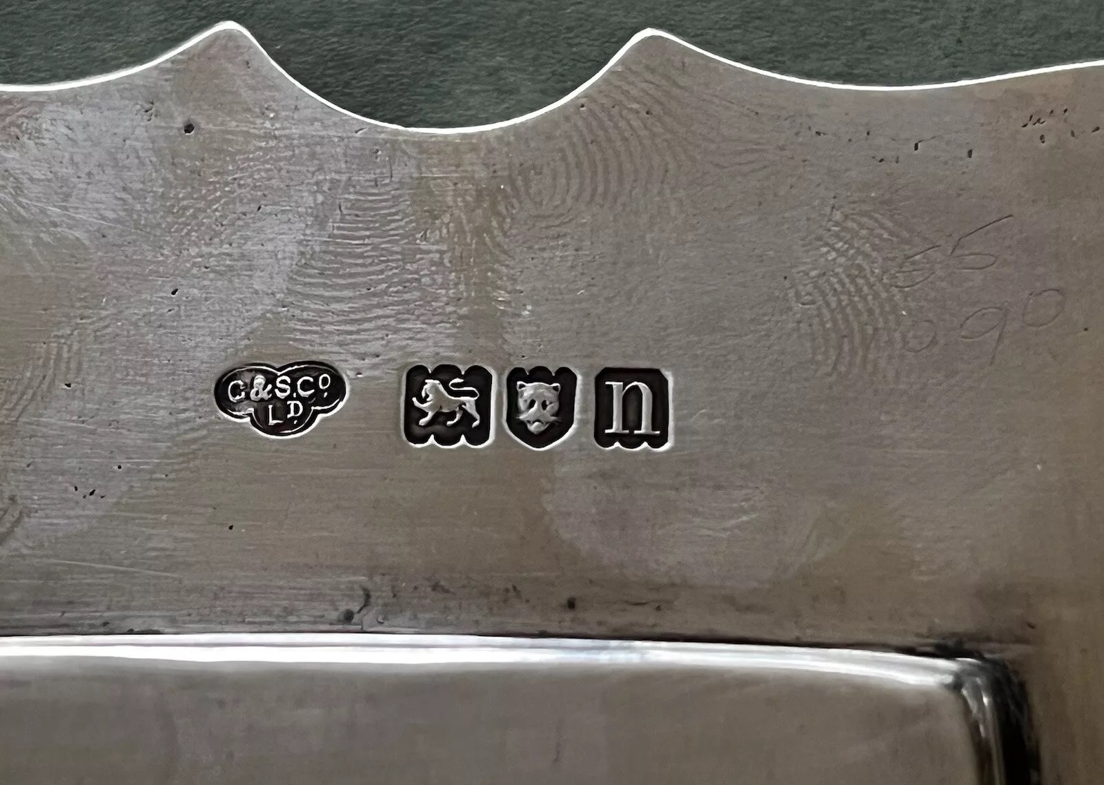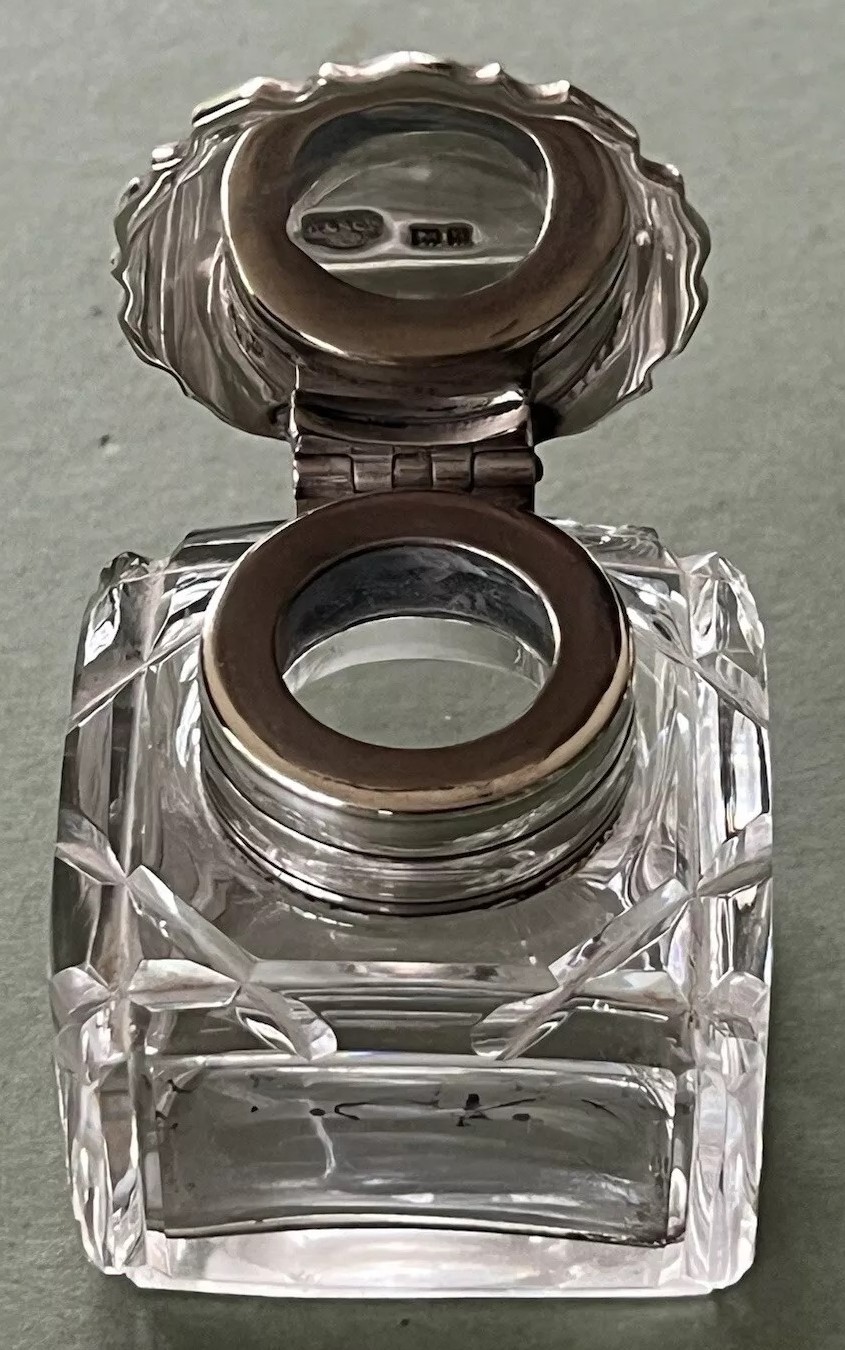 A sterling silver inkstand by Goldsmiths & Silversmiths Company of Regent Street, London. It features a tray on four splayed feet with scalloped edges and two rounded recesses to hold pens. Crisp and clear hallmarks date the piece to London, 1908. Two square spaces hold faceted inkwells, both fully hallmarked. The lids have plain centers and scalloped edges, matching the tray.