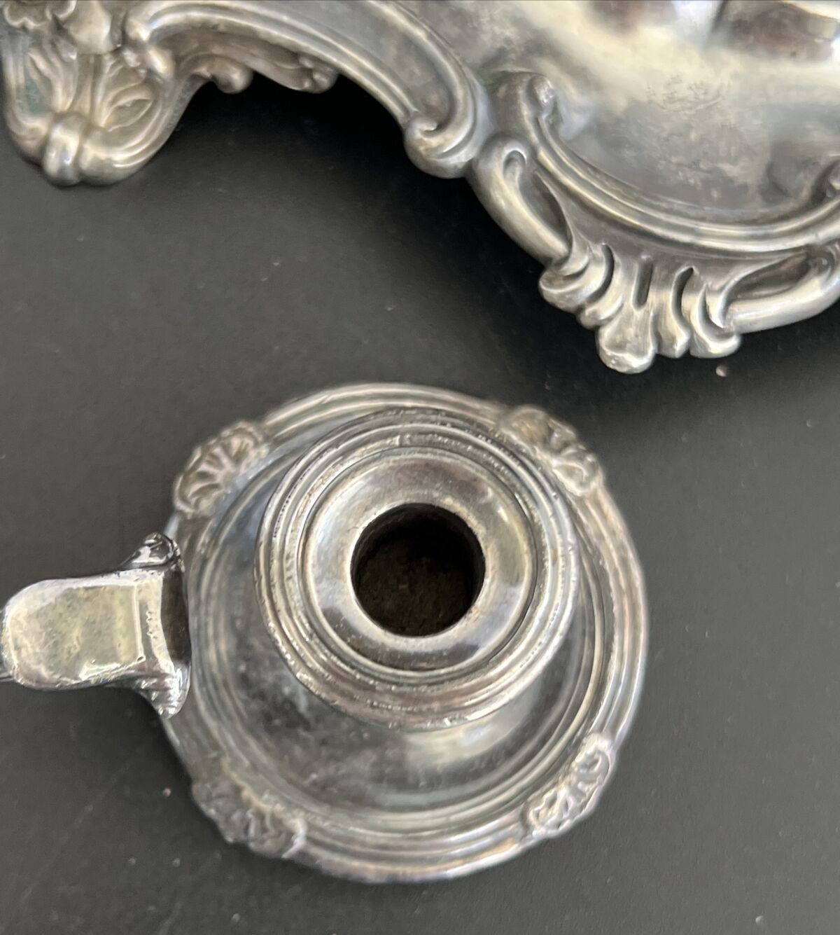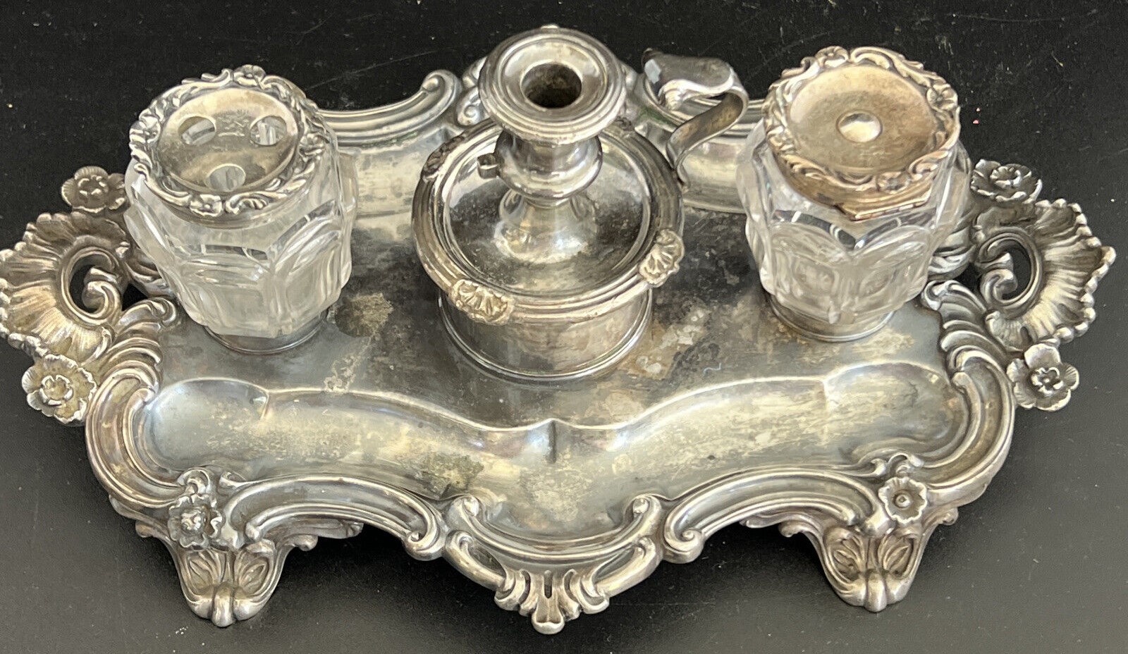 Sterling silver Georgian Standish with candle holder. The tray and the bottles are hallmarked. No hallmark on the chamber stick. A candle snuffer would have hung off the candlestick.