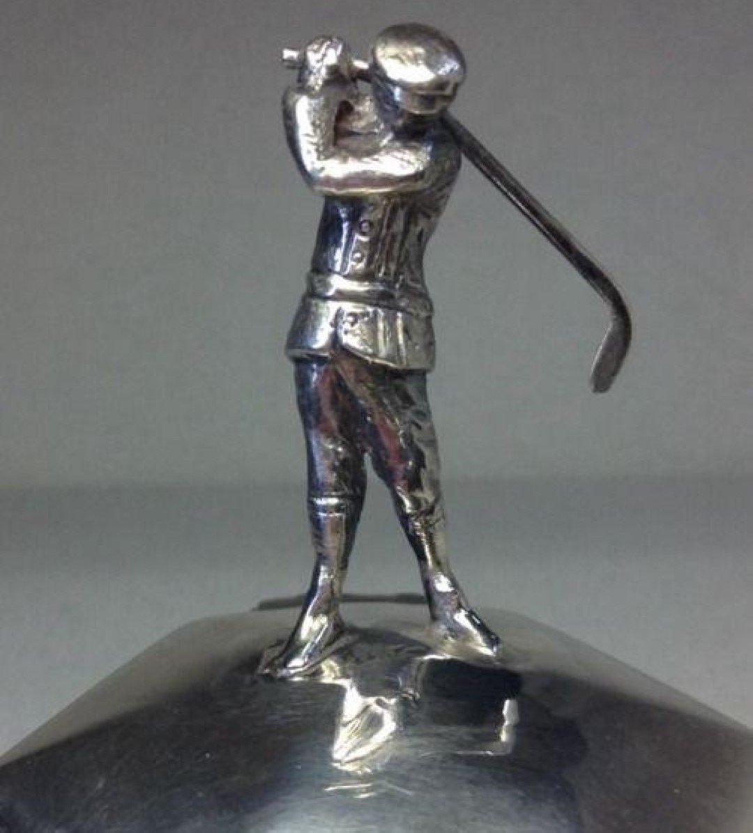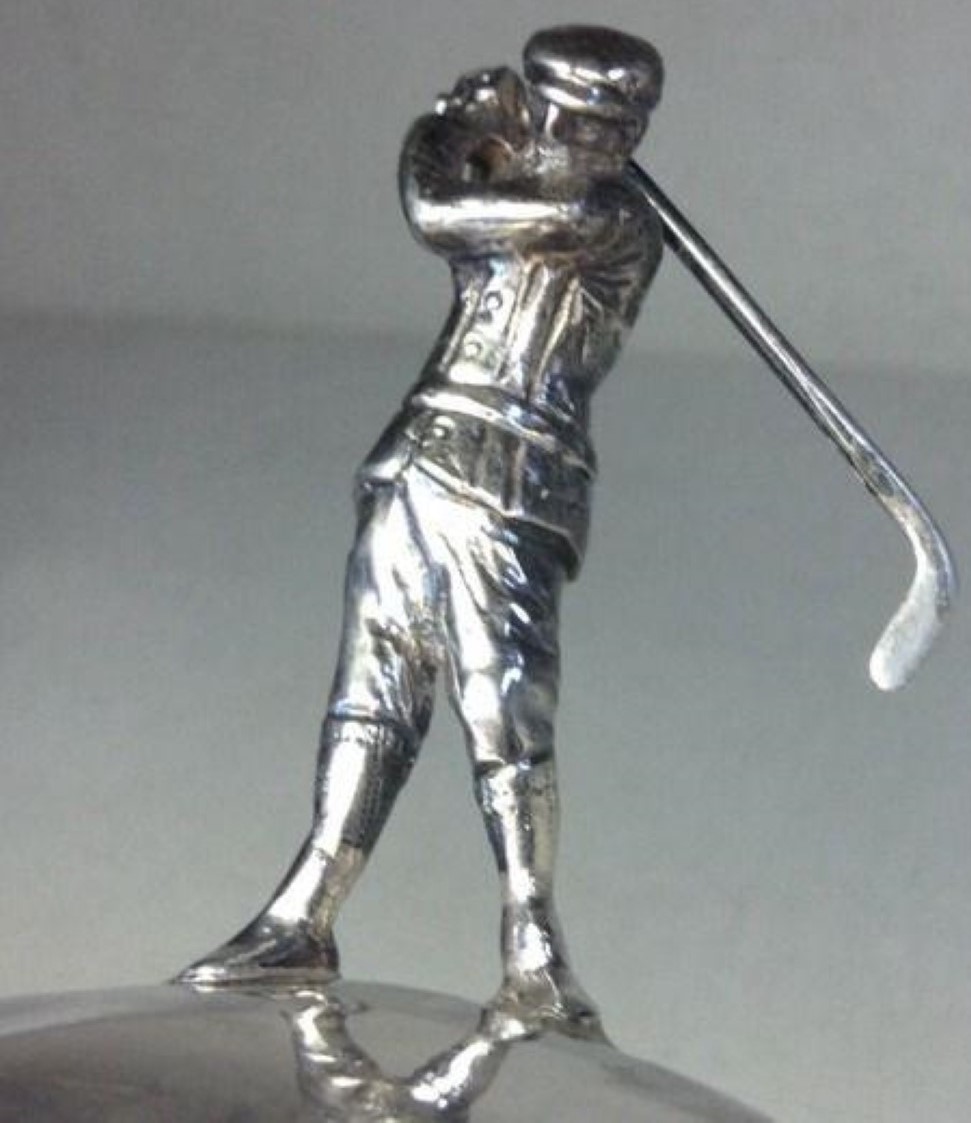 The figure of a golfer in Victorian garb is in the middle of a swing atop a raised hexagonal base including a solid silver bottom. The piece is hallmarked on the lid and on the inkwell, but they are hard to read. There’s the lion mark and a head hallmark for Chester.