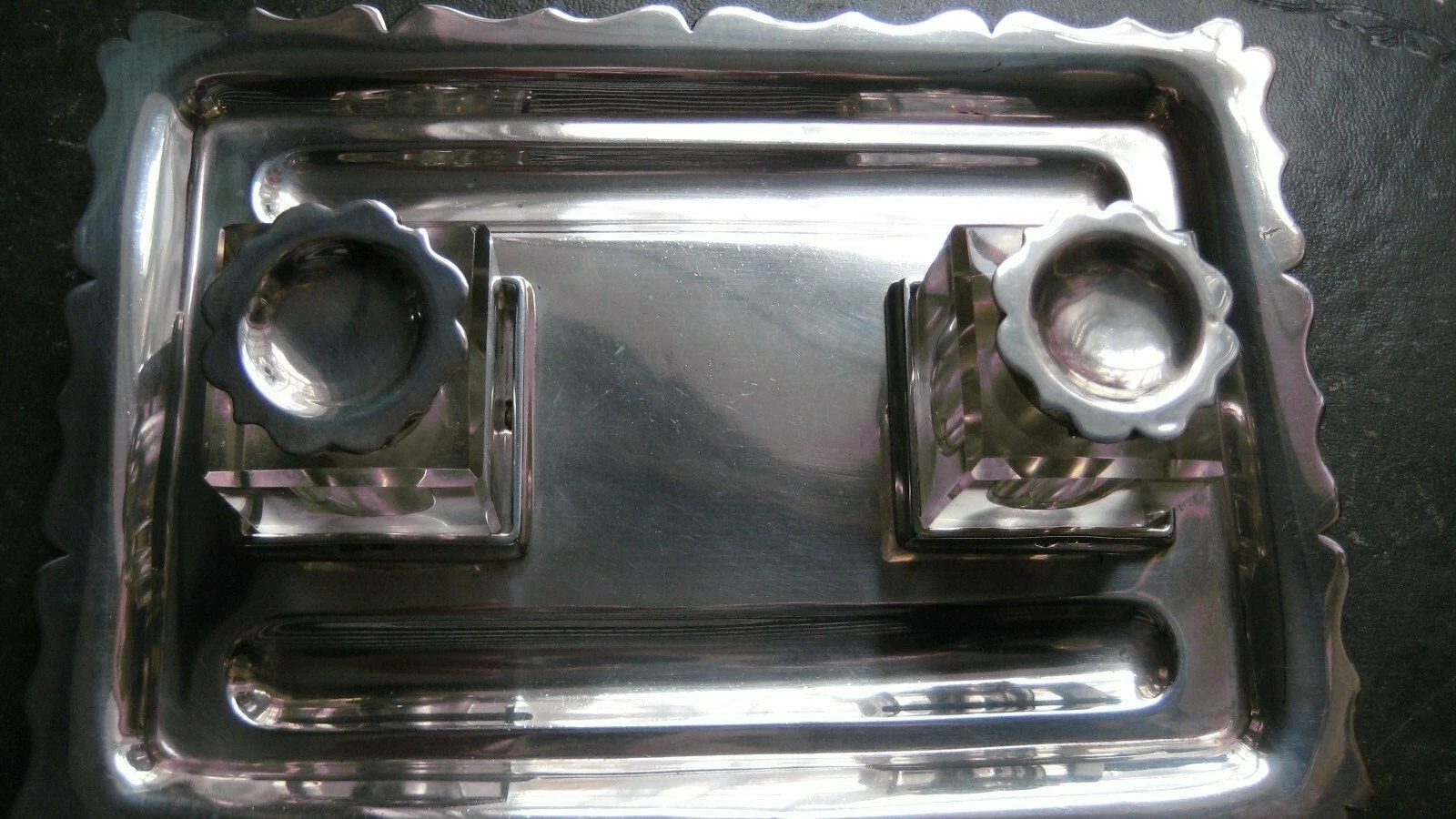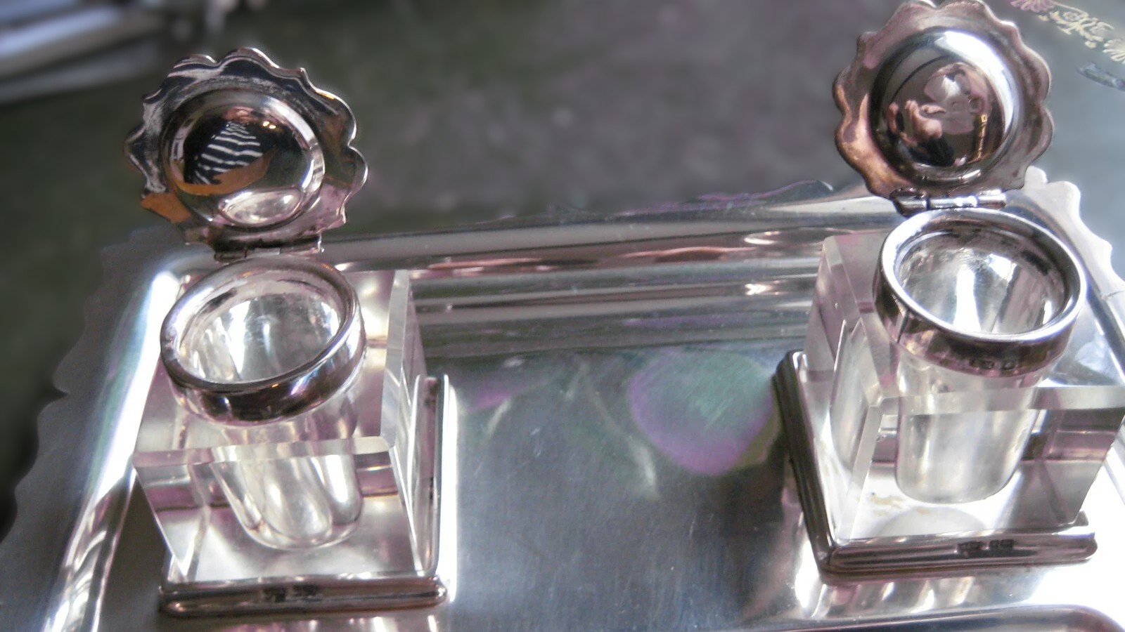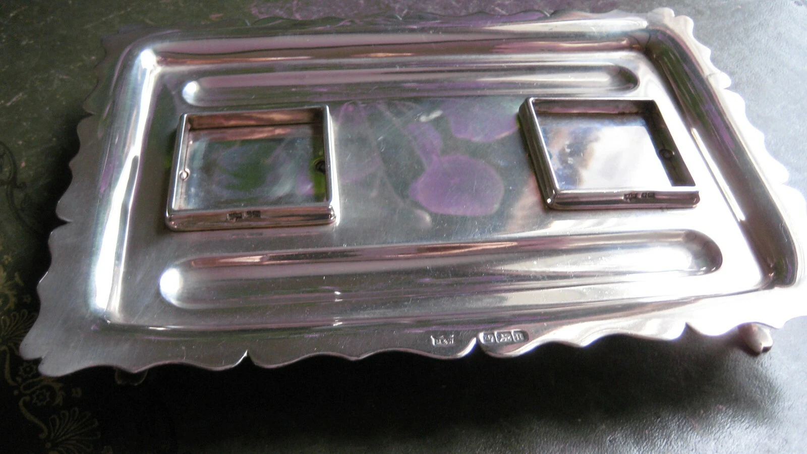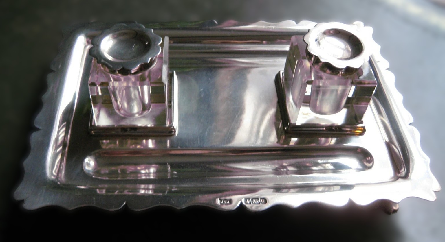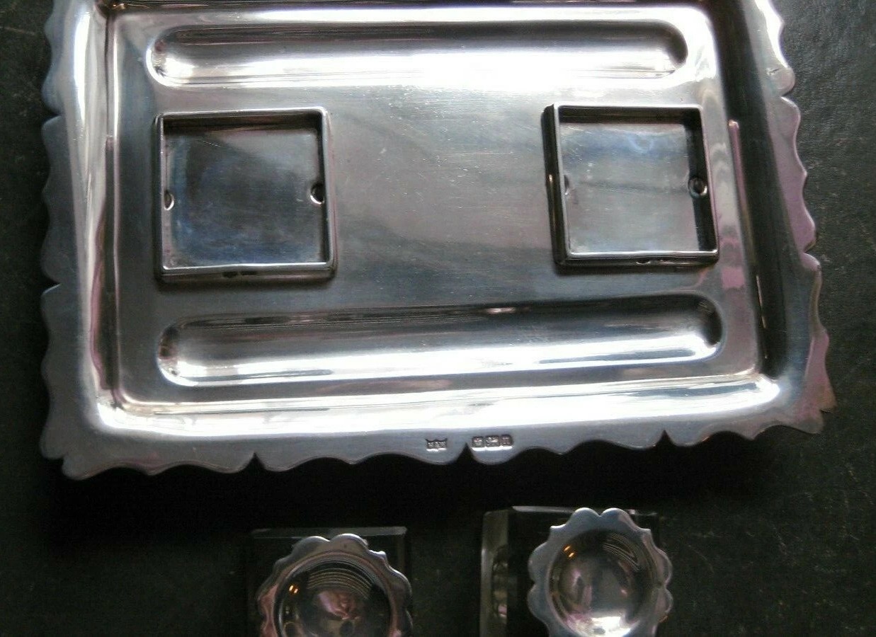 The piece is fully and clearly hallmarked on the side of the tray and on the collars of the inkwells: