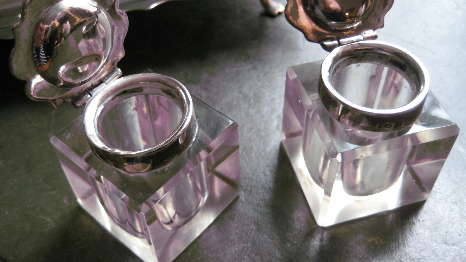 - Material: The set includes two heavy, clear cut-glass inkwells. The thickness of the glass suggests high-quality lead crystal, which would have been standard for a luxury Mappin & Webb set.