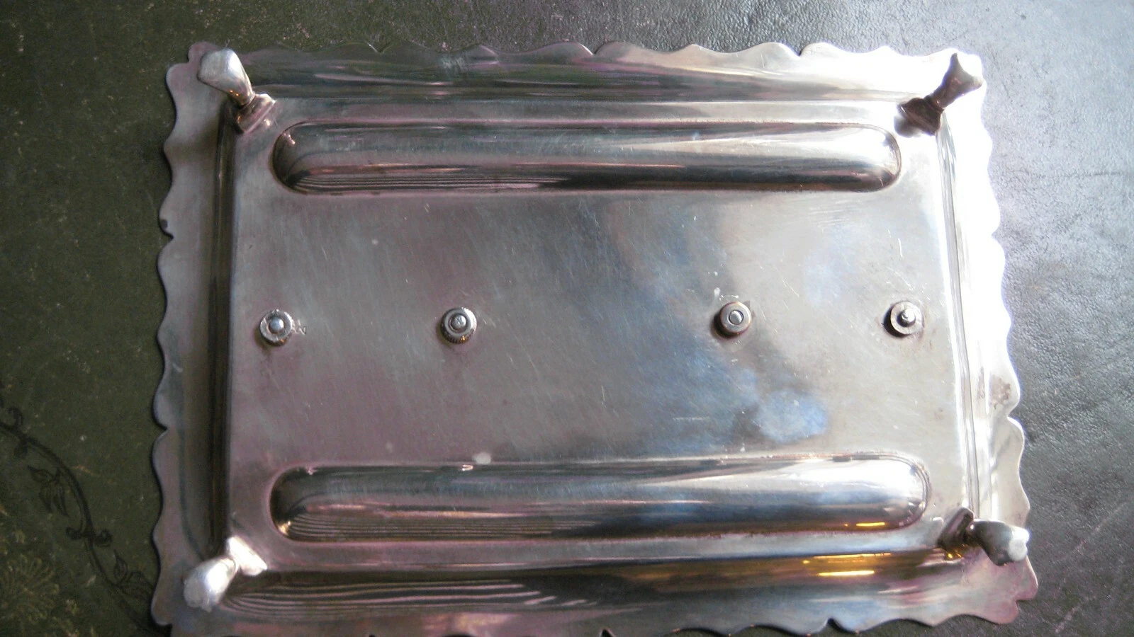 - Form and Border: The rectangular tray features a classic scalloped or “piecrust” border, a decorative edge that adds a sense of movement to the heavy silver.