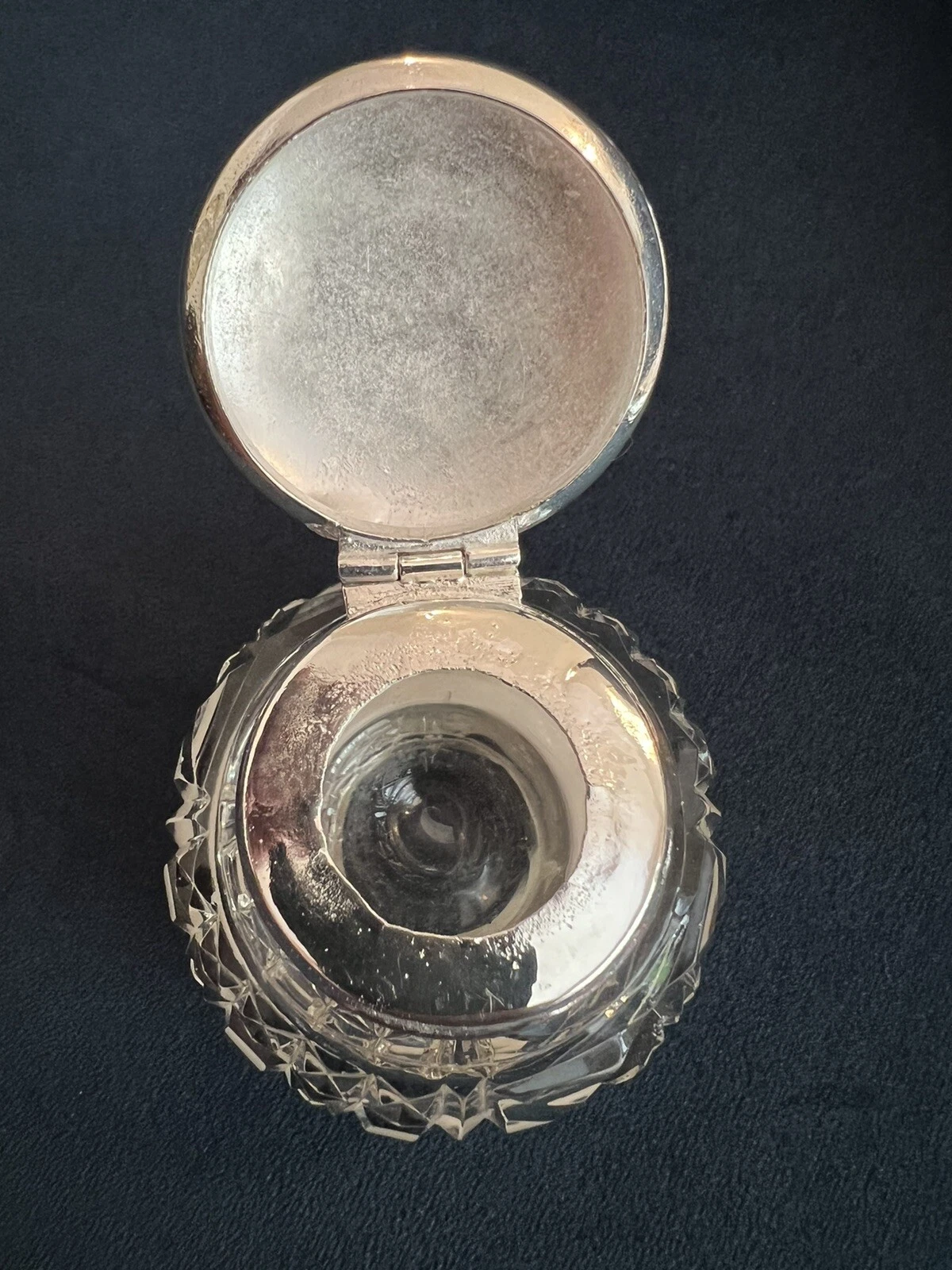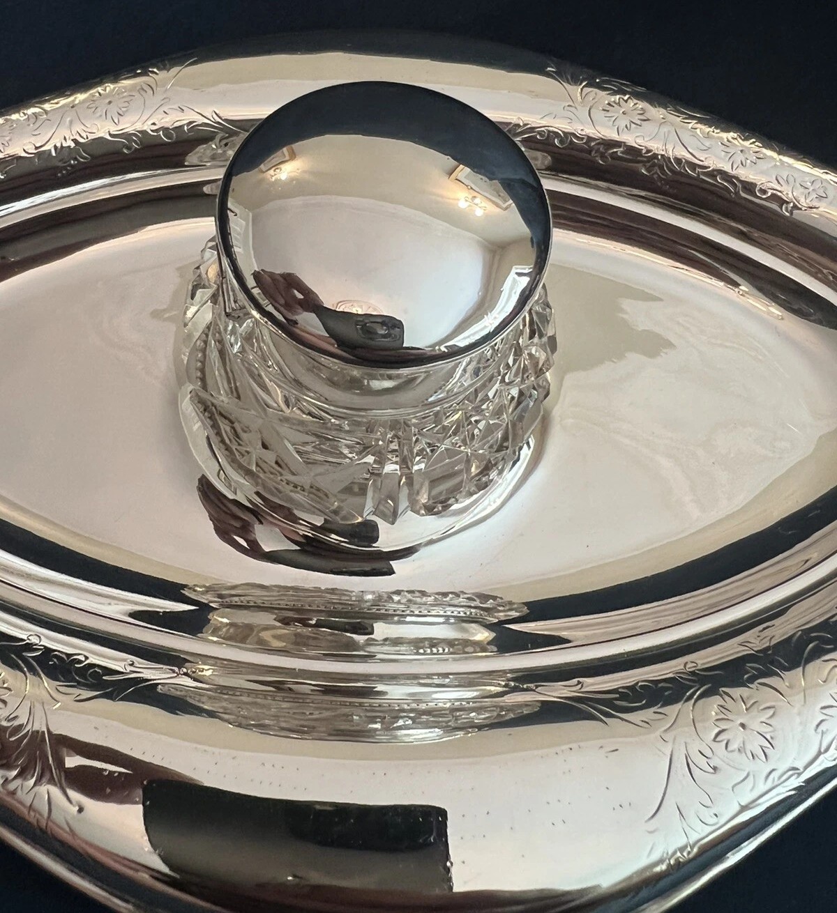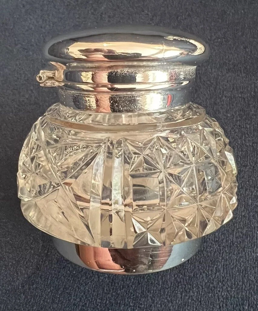 • Mounts: The bottle is topped with a sterling silver collar and a hinged, domed lid. The lid is polished and plain, providing a sleek contrast to the engraving on the tray.