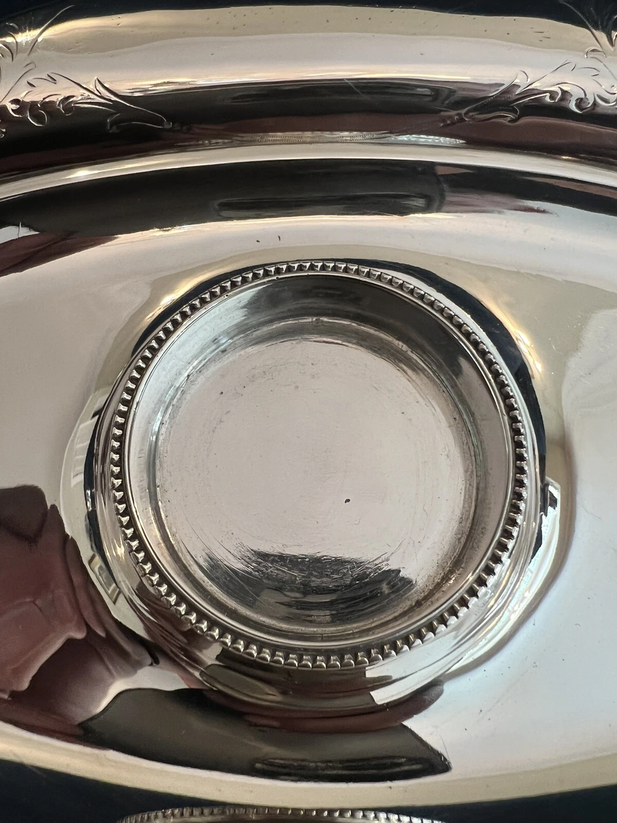 • Central Well: In the center is a raised, silver receiving ring with a beaded border designed to hold the glass inkwell securely in place.