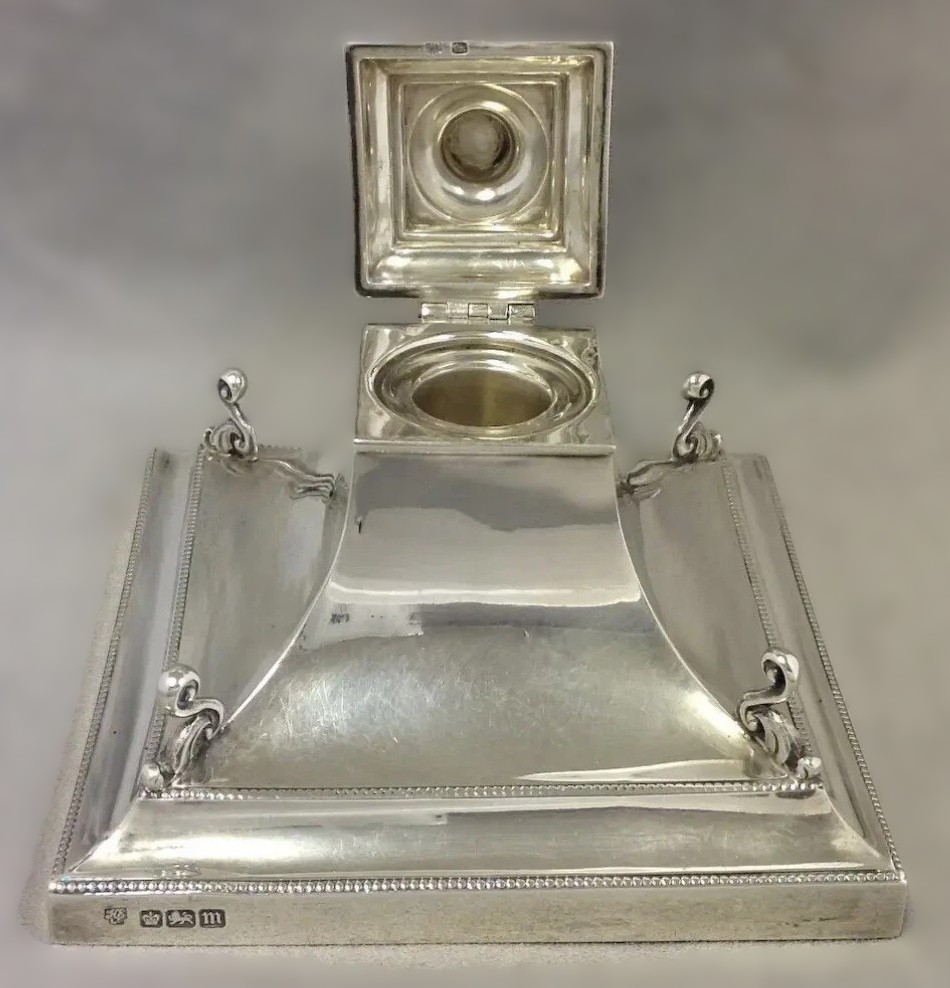 This hallmarked sterling silver inkstand was produced by one of Sheffield’s most respected silversmithing firms.