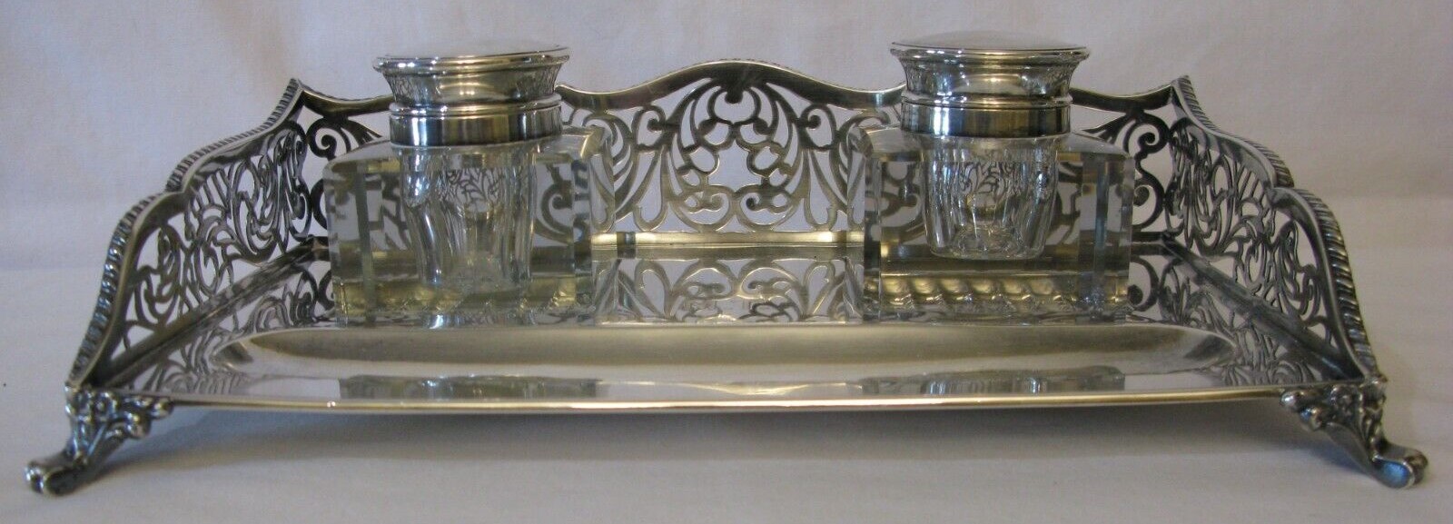 Gorham, Inc. cast this sterling silver inkstand with trifid feet and a gadrooned bank above the pierced, openwork sides and back.