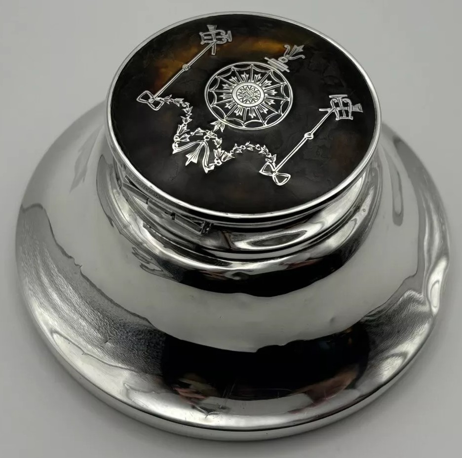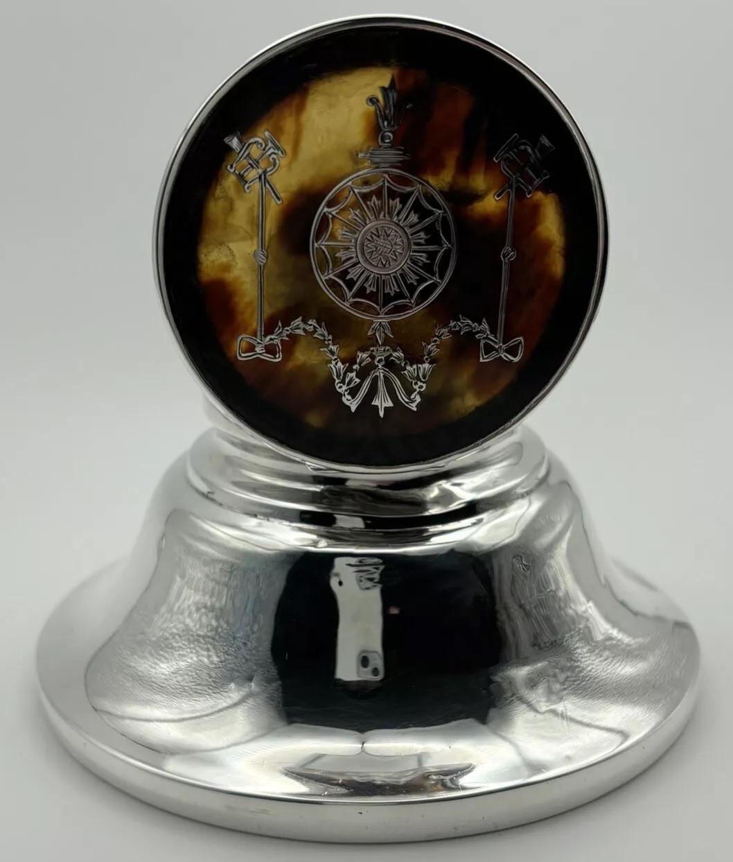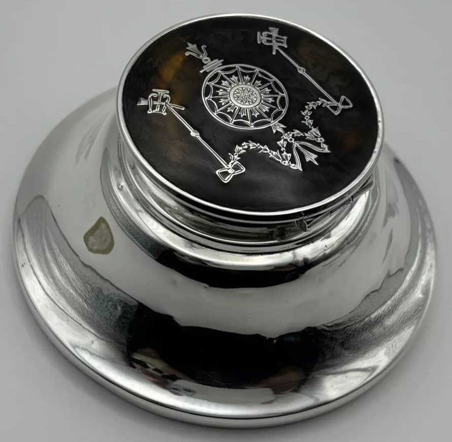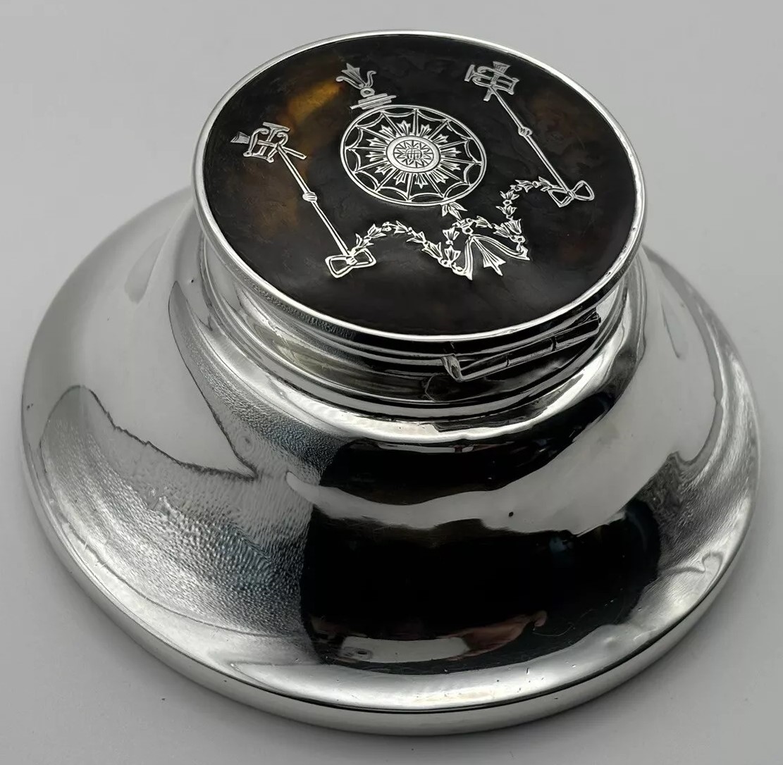 This English sterling silver capstan inkwell, hallmarked by William Comyns & Sons, London, 1912, features a lid adorned with a pique design. (“Piqué” is a decorative technique where materials like silver are inlaid into a base material, often tortoiseshell to create intricate patterns). The lid’s piqué design includes musical symbols, specifically a lyre and a horn trumpet.