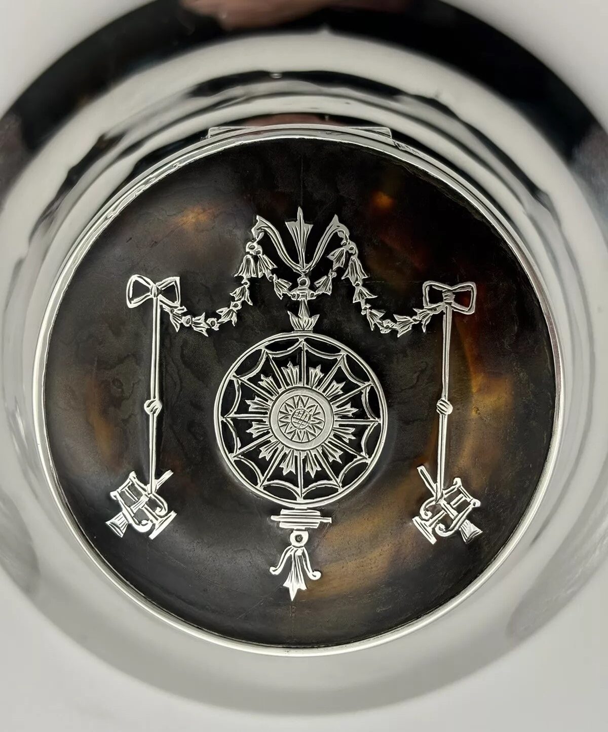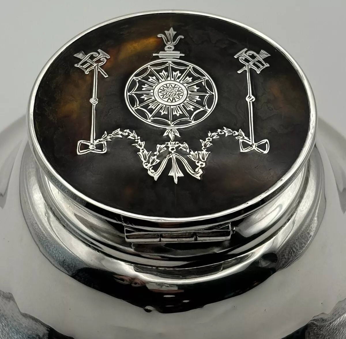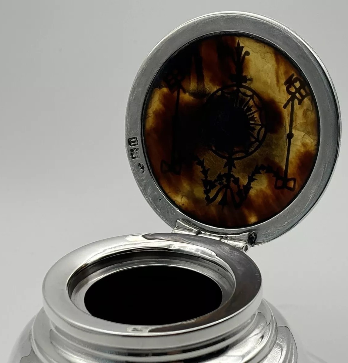 This English sterling silver capstan inkwell, hallmarked by William Comyns & Sons, London, 1912, features a lid adorned with a pique design. (“Piqué” is a decorative technique where materials like silver are inlaid into a base material, often tortoiseshell to create intricate patterns). The lid’s piqué design includes musical symbols, specifically a lyre and a horn trumpet.