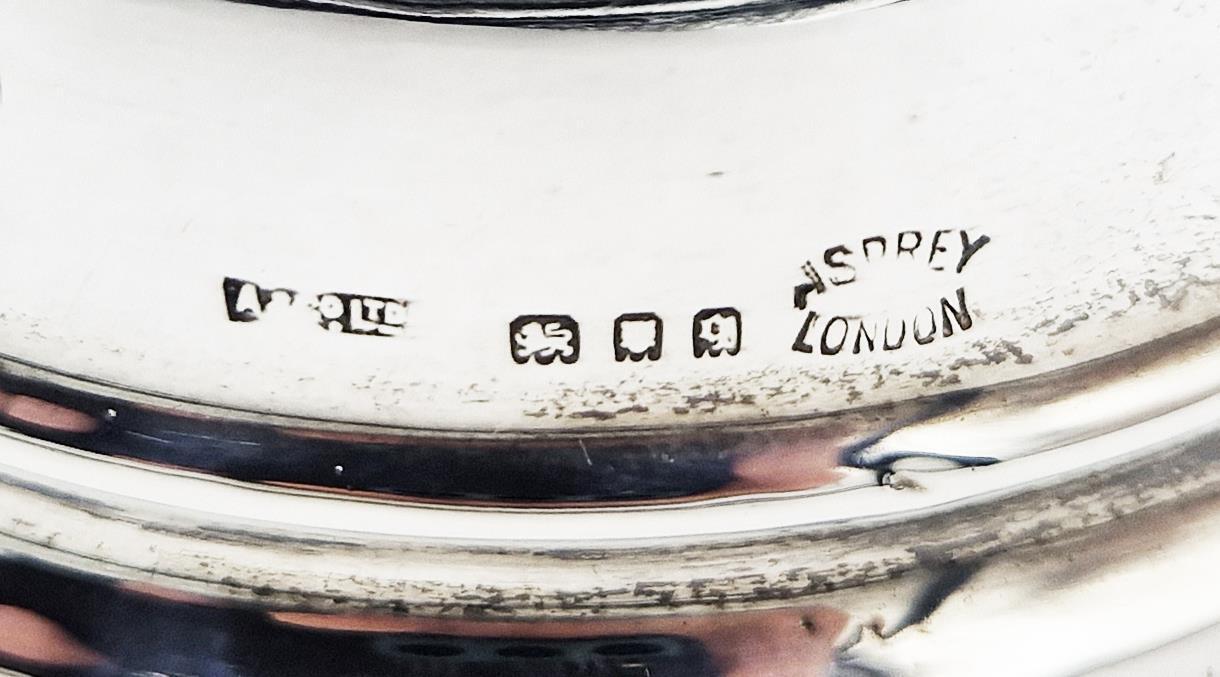 A sterling silver inkwell bears the maker’s mark A & Co. Ltd and full London hallmarks. The piece was retailed by Asprey & Co. London.