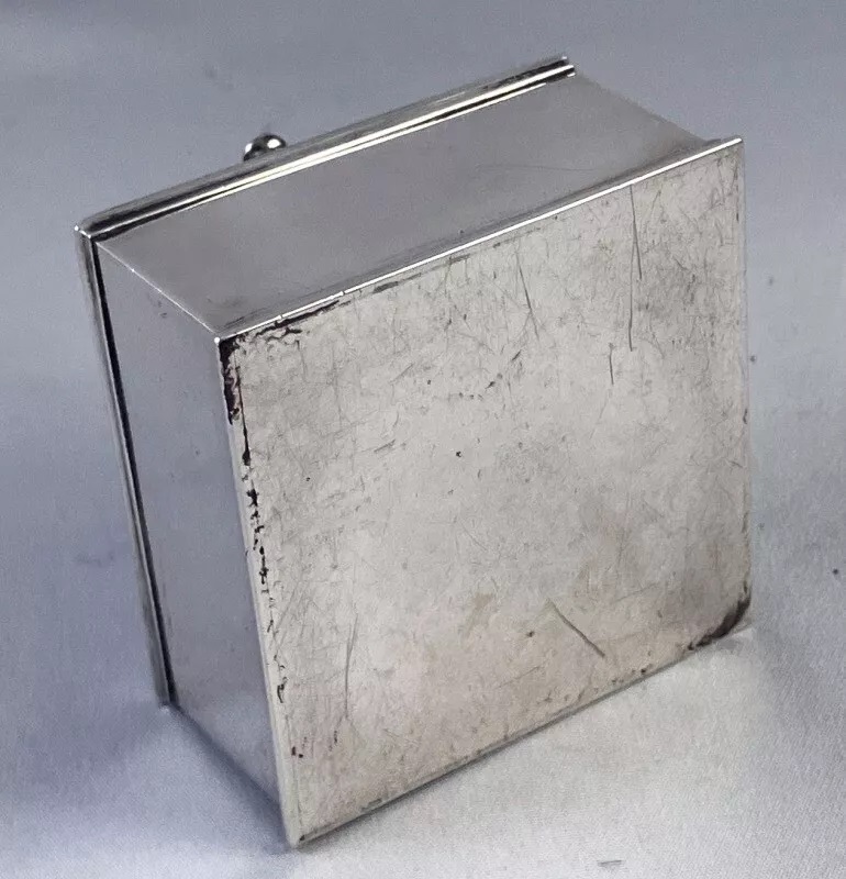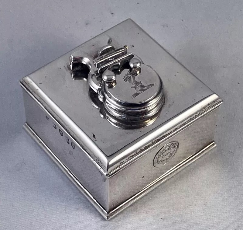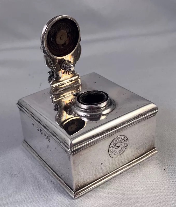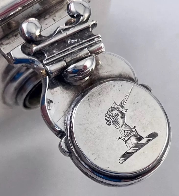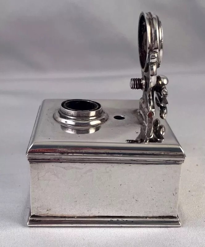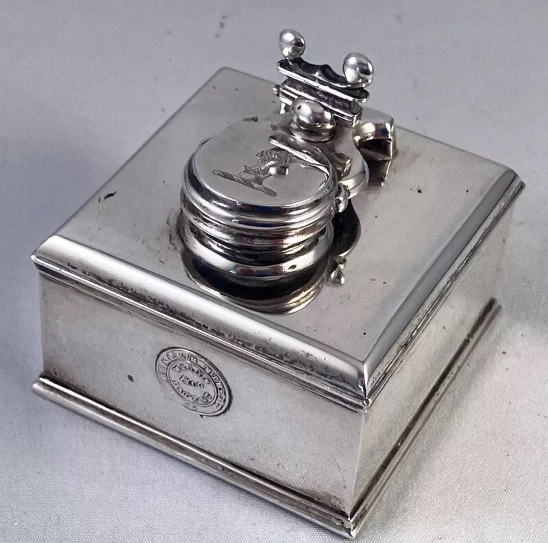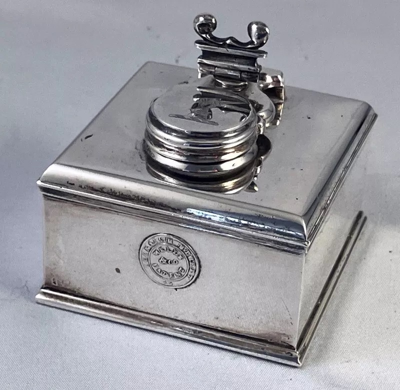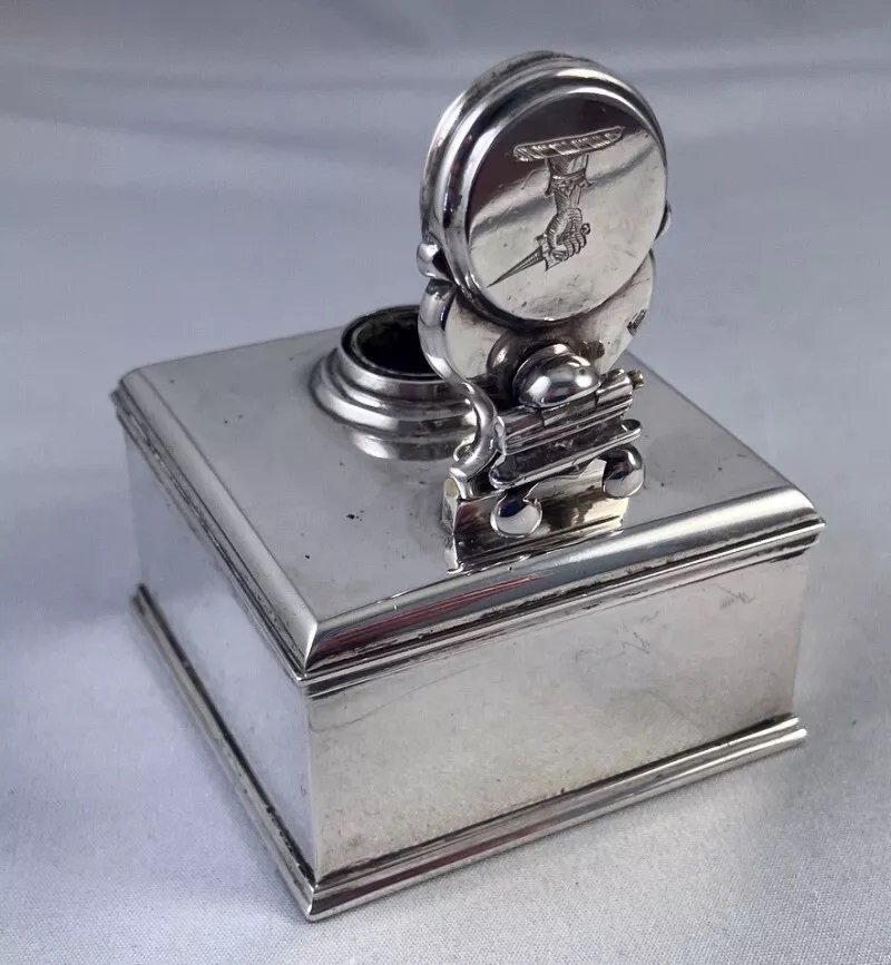 The detailed workmanship on the body of this inkwell features rounded shoulders with mitered corners over narrow molding on the lid and stepped back molding around the base. The lid is engraved with a fist holding an upright dagger. The screw sits behind the lid at the rear instead of at the front, and the folding tab is shaped somewhat like a crown.