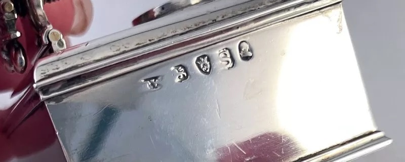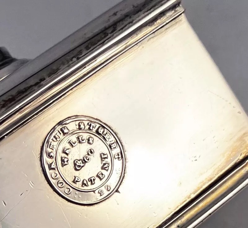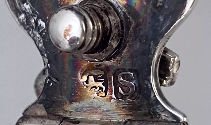 It is hallmarked with “TW” (most likely Thomas Wright, reg’d. 1778, though similar marks are attributed to Thomas Wimbush and Thomas Woodhouse); a lion passant; a crowned leopard head (used until 1822, after which the leopard lost his crown); a smooth upper case “S”, the date mark for 1813, and a right-facing George III (1726-1821). The front of the well has a medallion stamped: