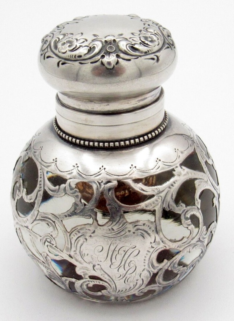 Heavy glass inkwell with a star cut in the base with sterling silver overlay made by the Alvin Company. Signed on the color: sterling. Signed on the bottom with the Alvin Company mark, 925/1000, and numbers.