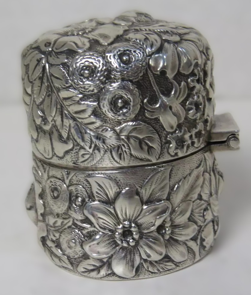 This sterling silver traveling inkwell was made by the American firm Black, Starr & Frost. When closed, the inkwell presents as a compact, cylindrical form. Its entire exterior surface is adorned with detailed repoussé floral patterns. This intricate hand-hammered work creates a rich tapestry of blooming flowers and intertwined leaves.