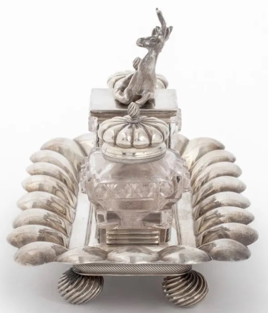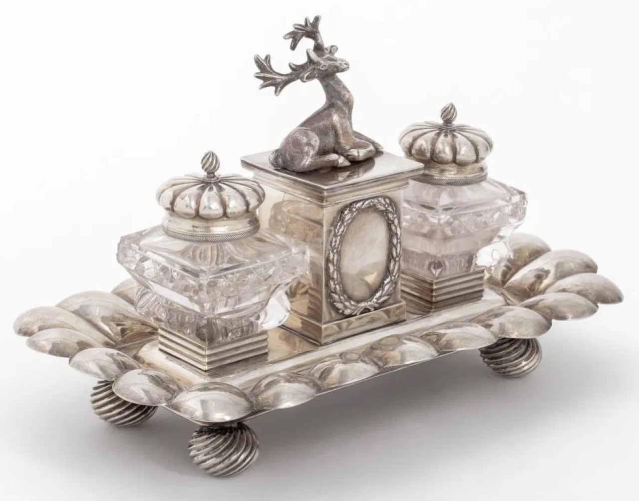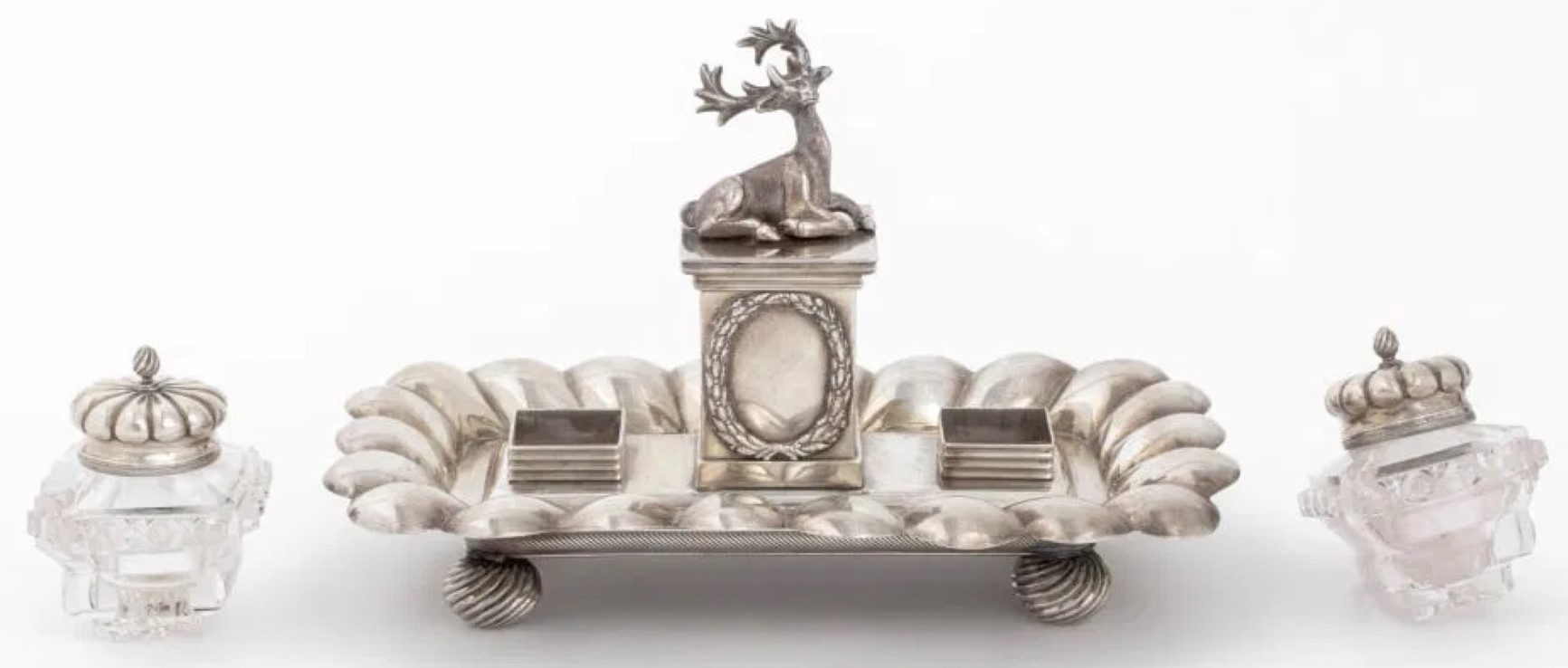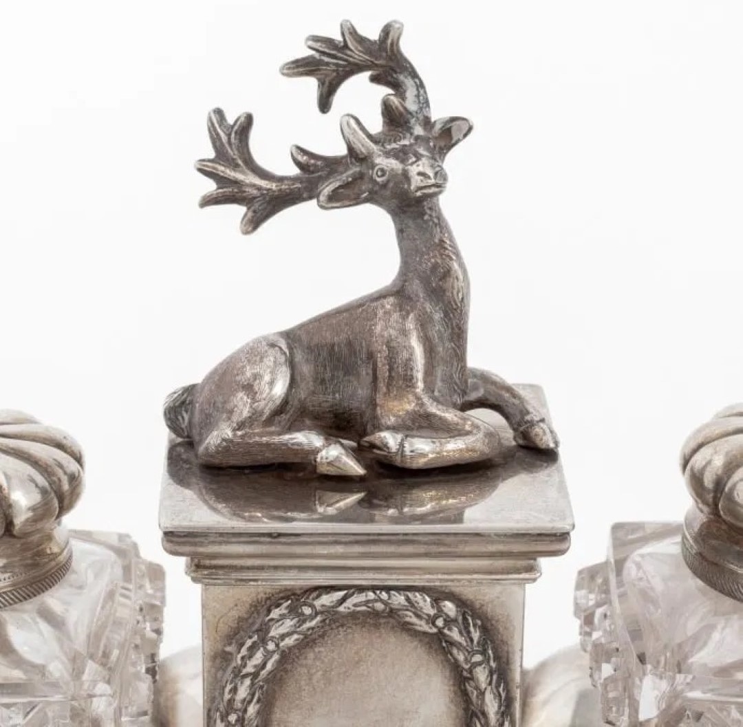 Dutch sterling silver stag finial inkstand, 1839, crystal inkwell and sand shaker, struck with marks for Jacob Daniel Arnoldi and Johannes Willem Wielick, Amsterdam, Netherlands, 1839, and standing lion 1, with H.J. Verschuur mark to underside of base.
