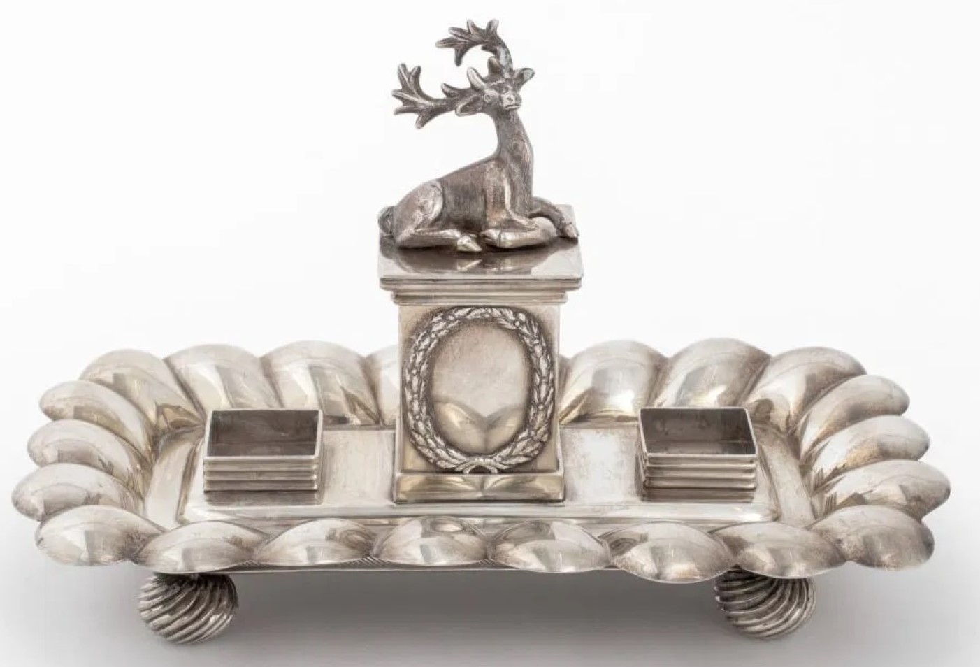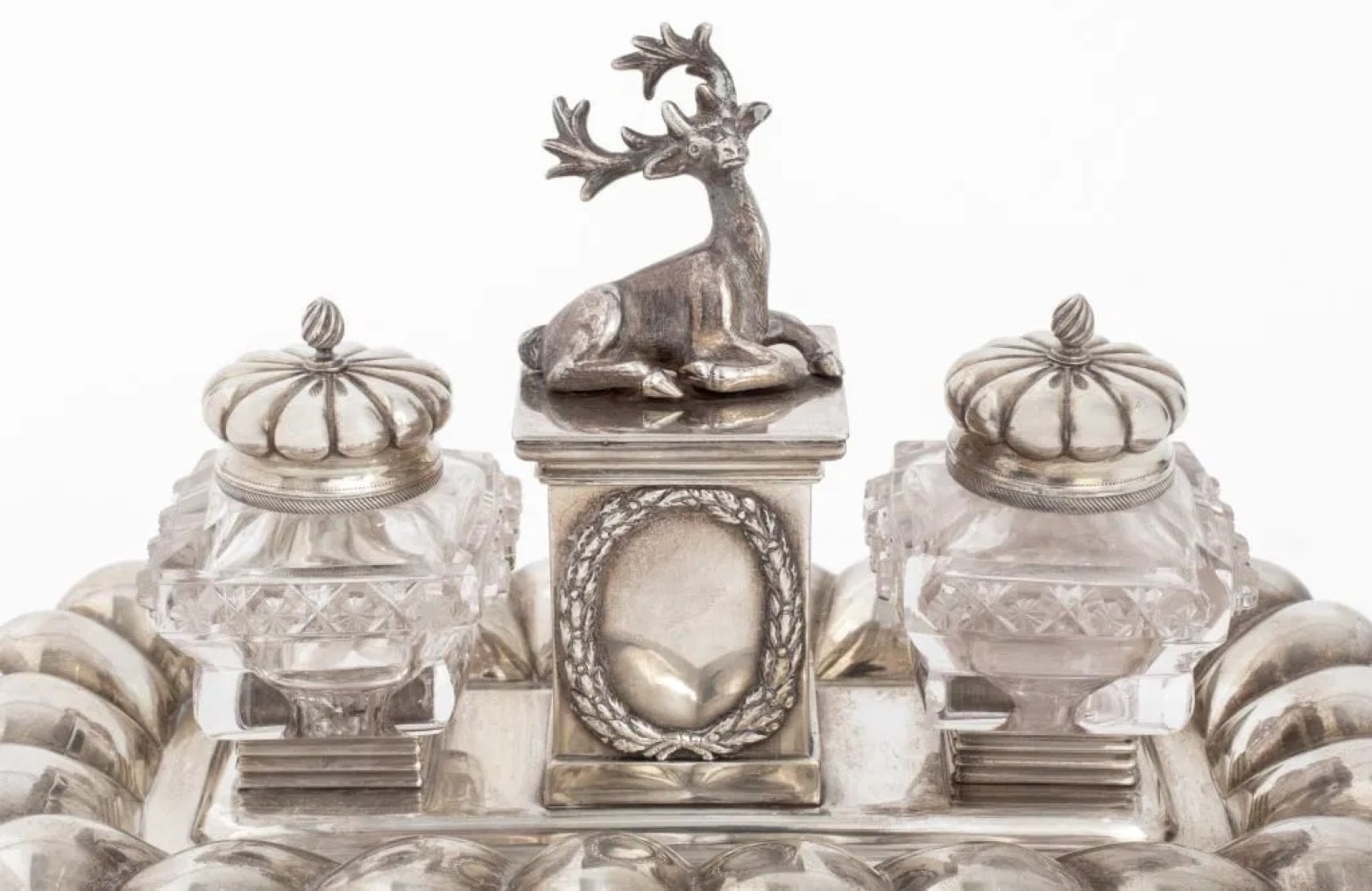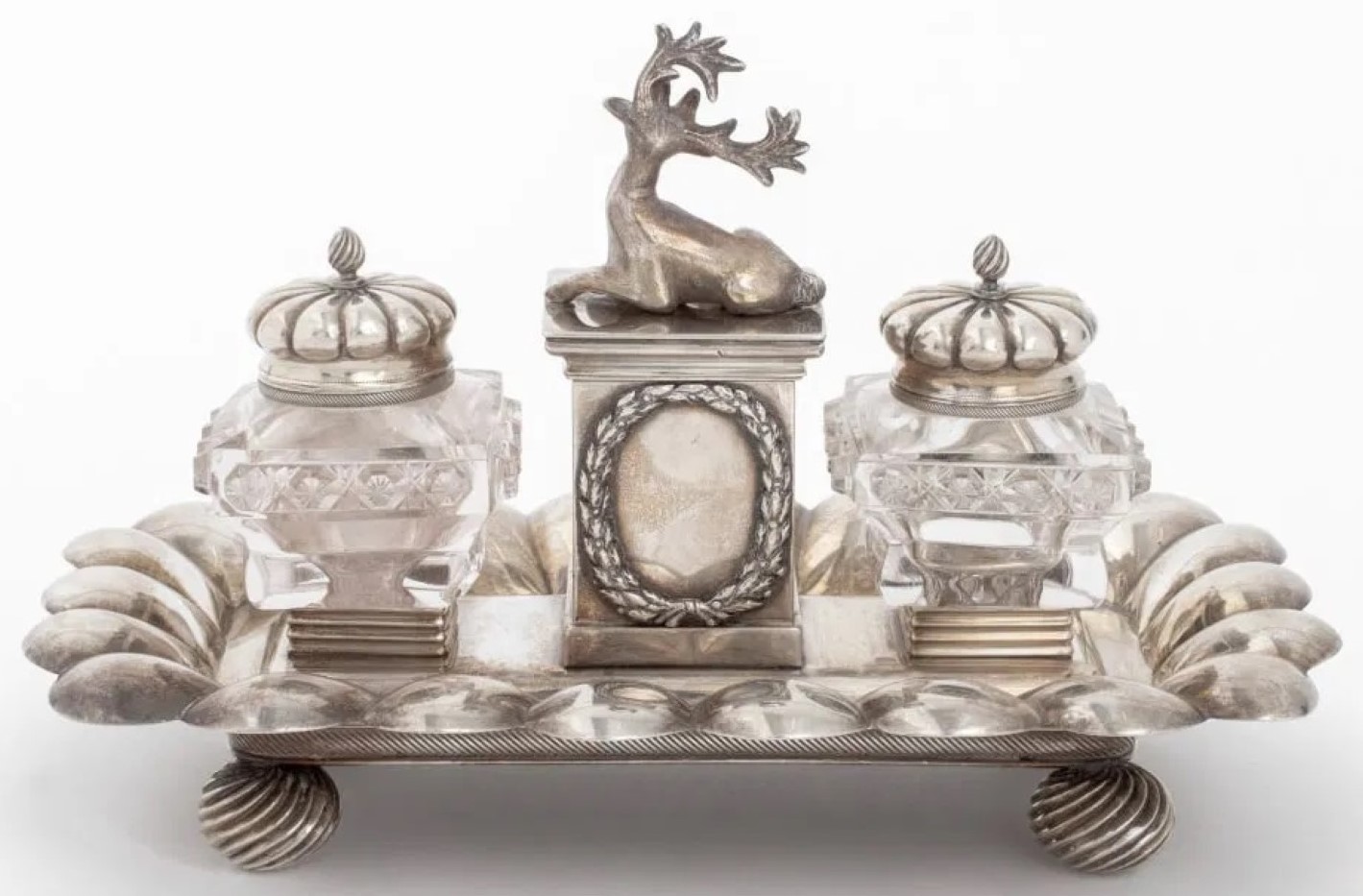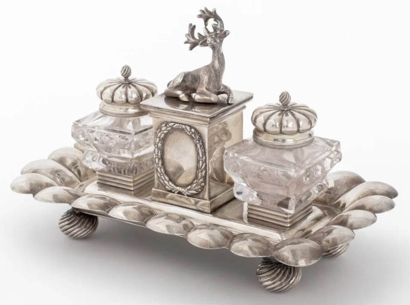 Dutch sterling silver stag finial inkstand, 1839, crystal inkwell and sand shaker, struck with marks for Jacob Daniel Arnoldi and Johannes Willem Wielick, Amsterdam, Netherlands, 1839, and standing lion 1, with H.J. Verschuur mark to underside of base.