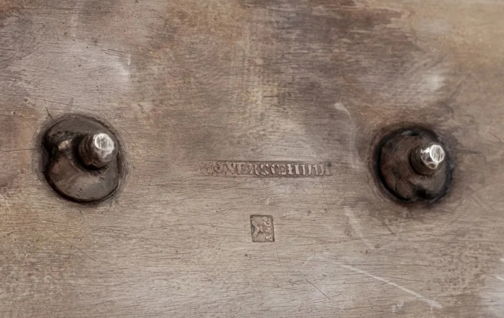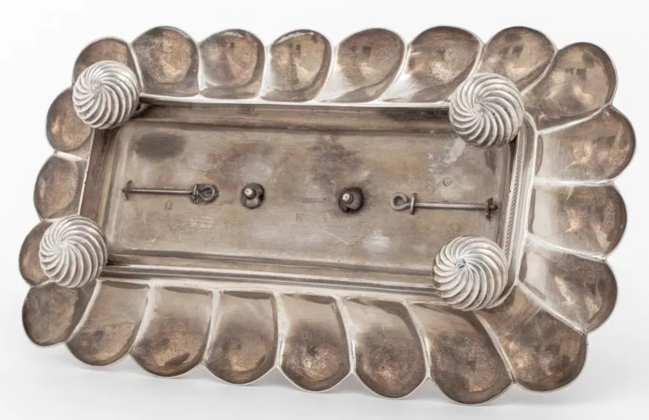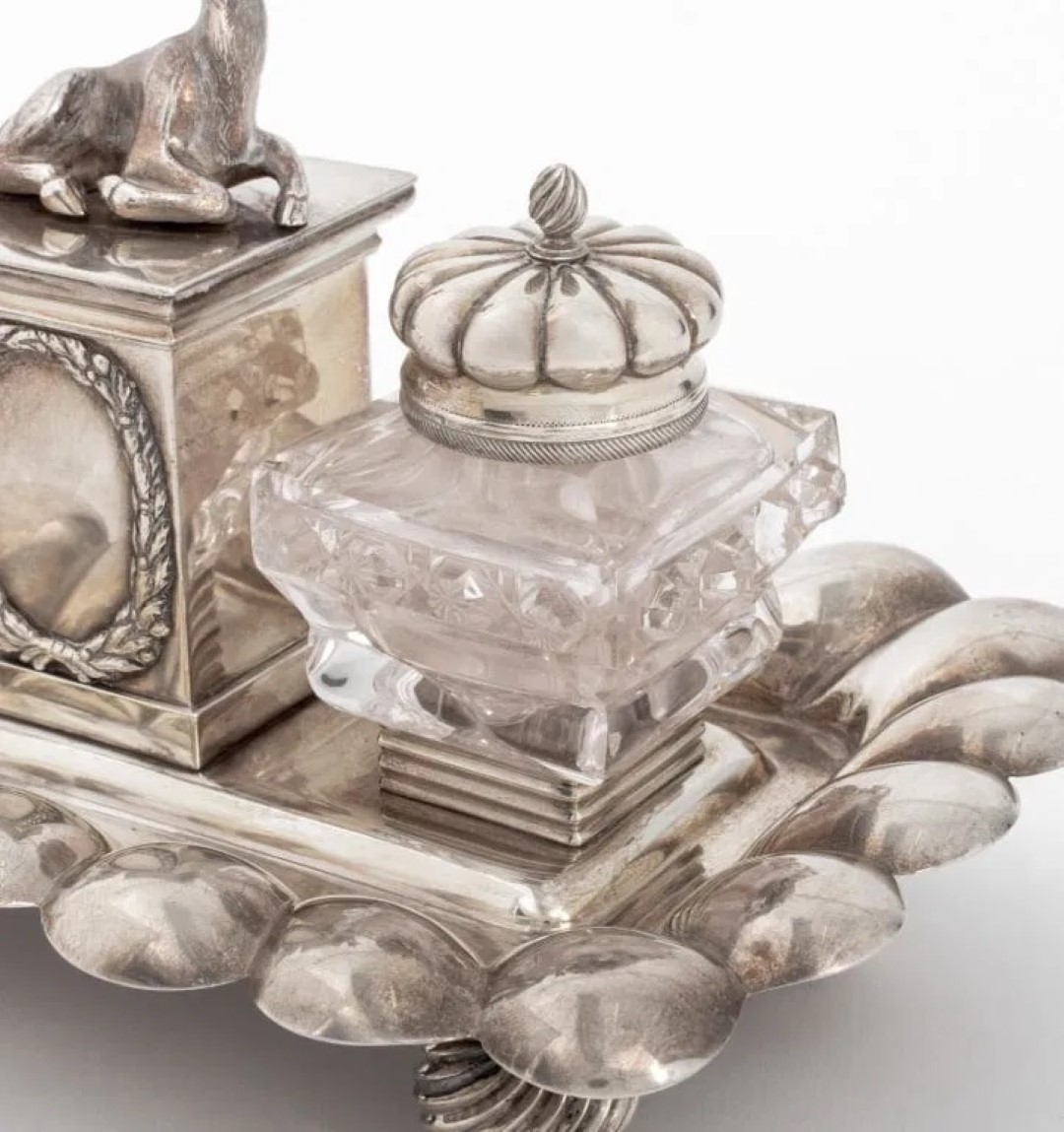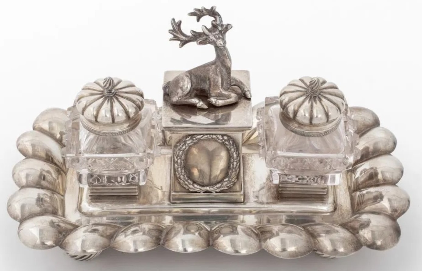 Dutch sterling silver stag finial inkstand, 1839, crystal inkwell and sand shaker, struck with marks for Jacob Daniel Arnoldi and Johannes Willem Wielick, Amsterdam, Netherlands, 1839, and standing lion 1, with H.J. Verschuur mark to underside of base.