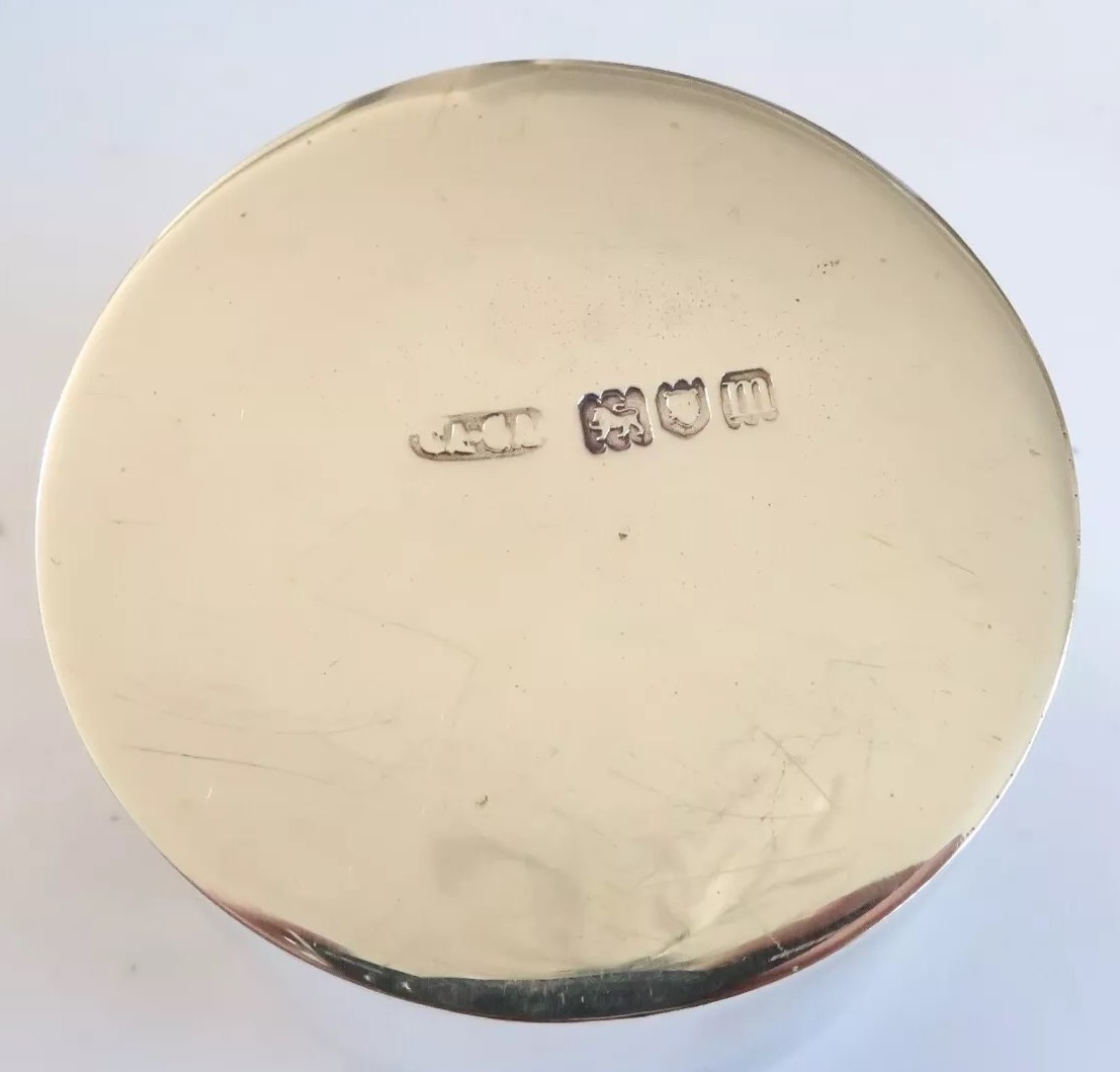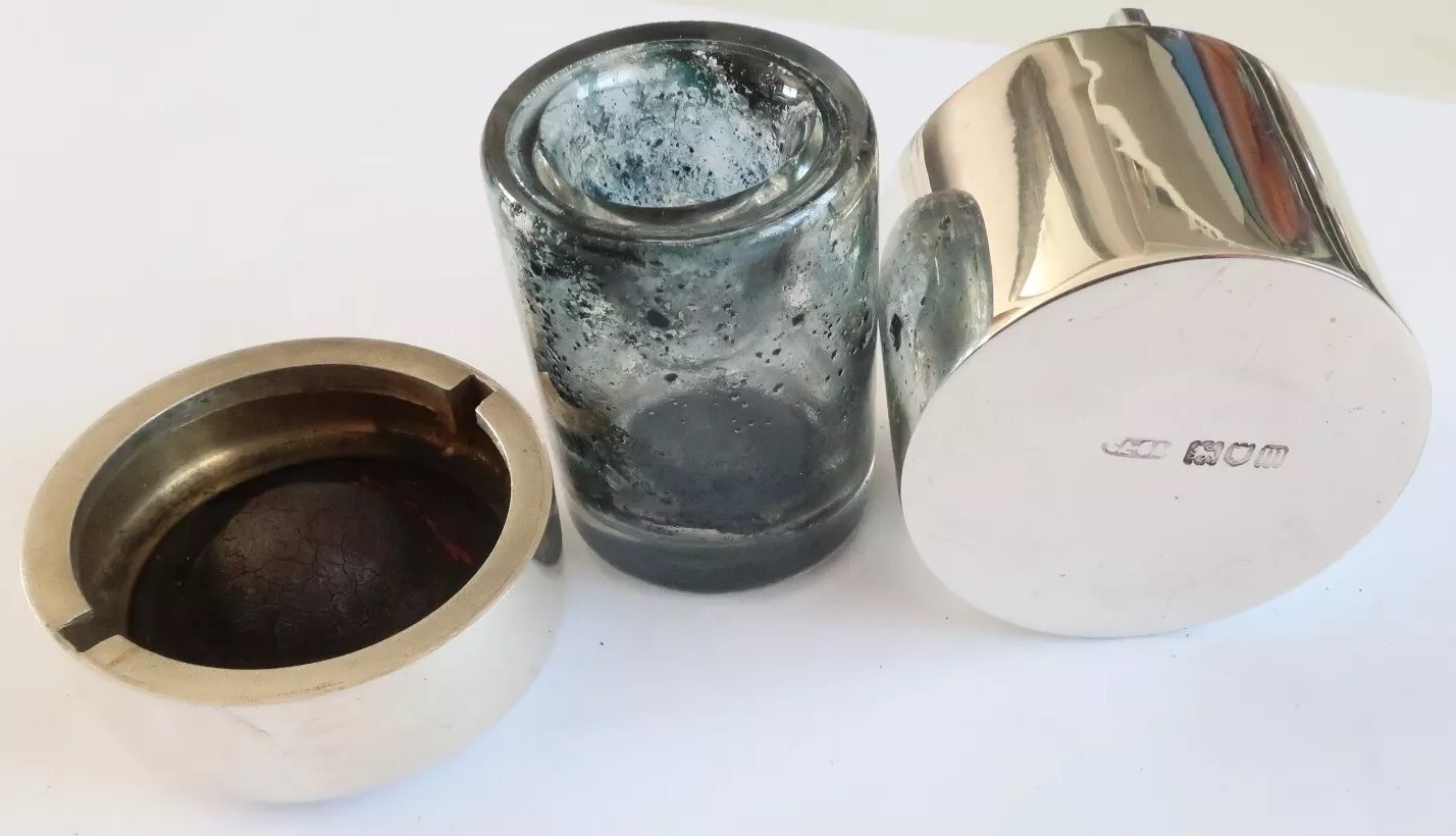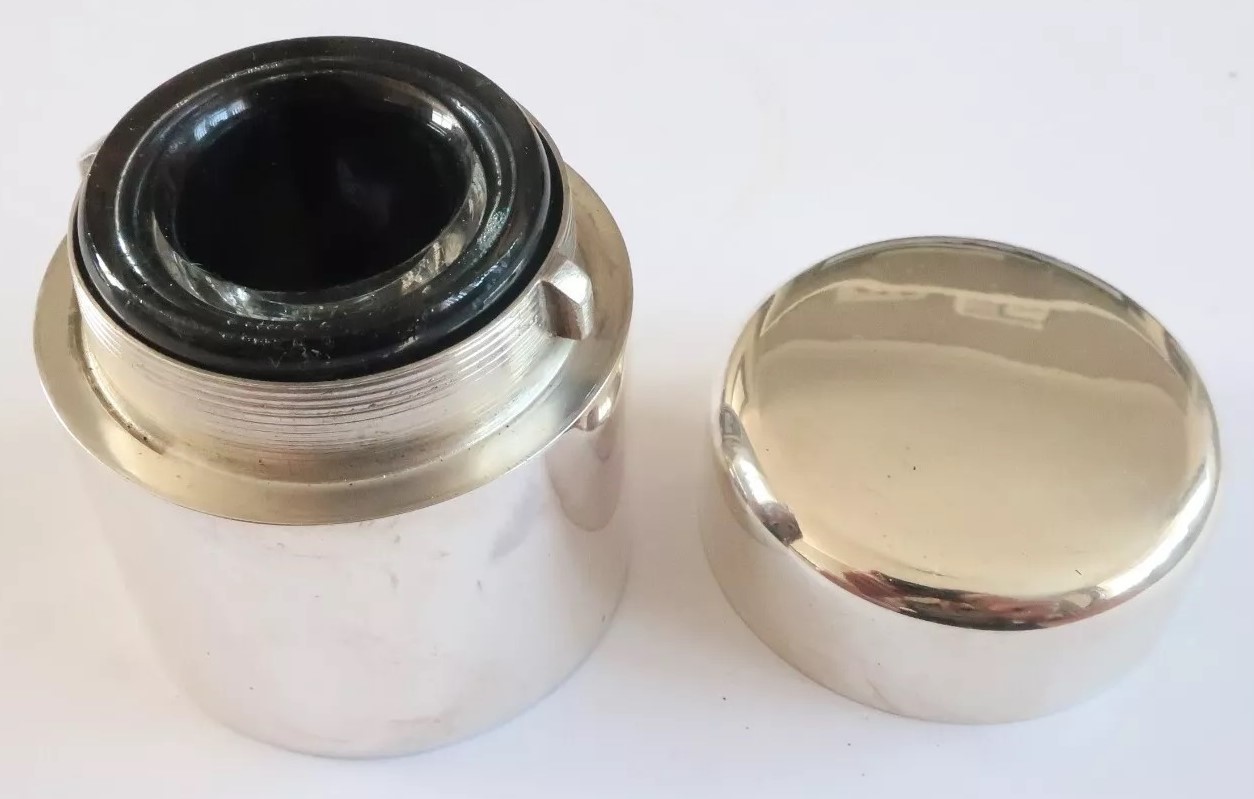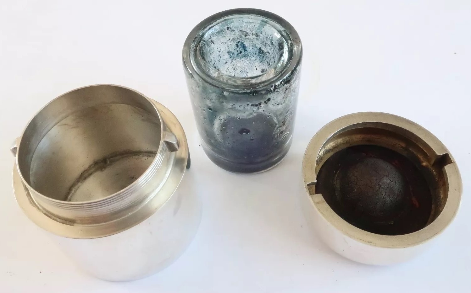 This silver traveler is hallmarked for London, 1907, for Charles & George Asprey (CA.GA.). The glass liner is anti-spill designed. The piece has a tight Bayonet fitting lid with a rubber patch inside.