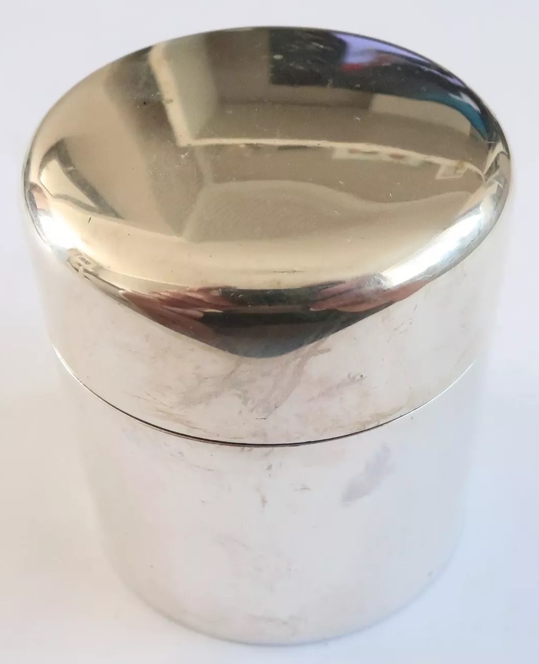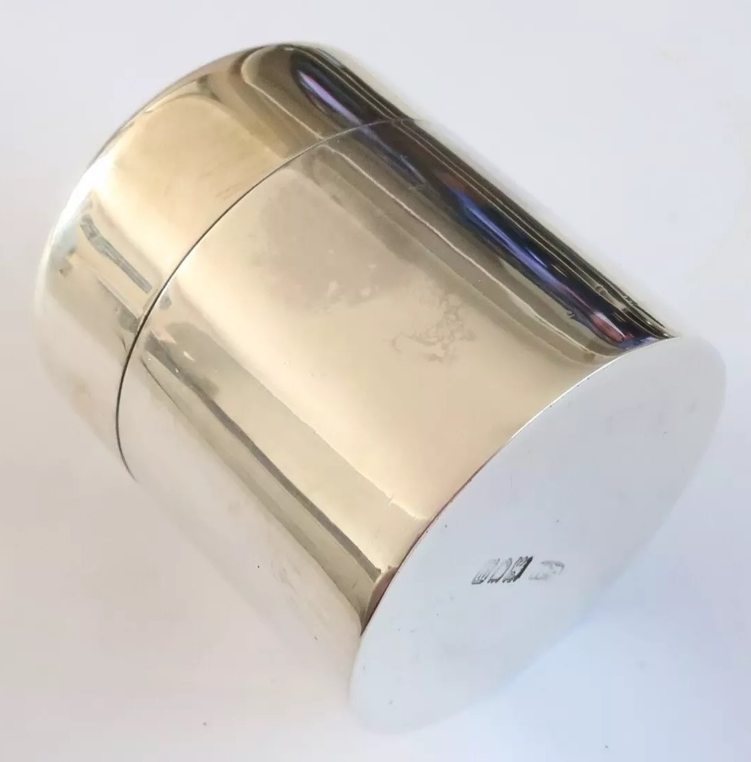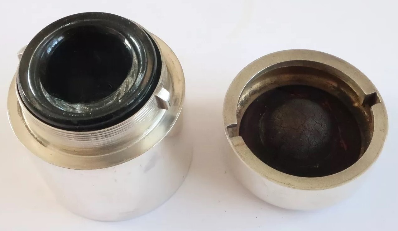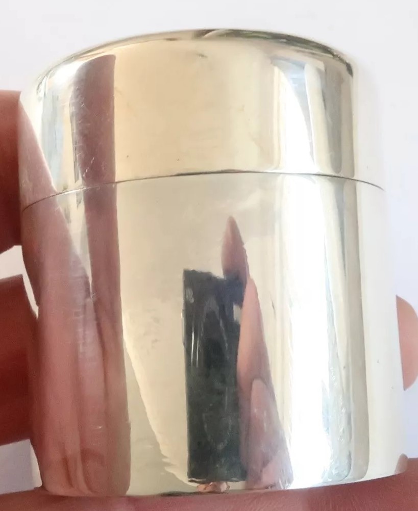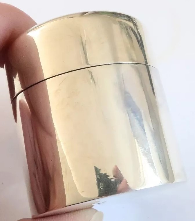 This silver traveler is hallmarked for London, 1907, for Charles & George Asprey (CA.GA.). The glass liner is anti-spill designed. The piece has a tight Bayonet fitting lid with a rubber patch inside.