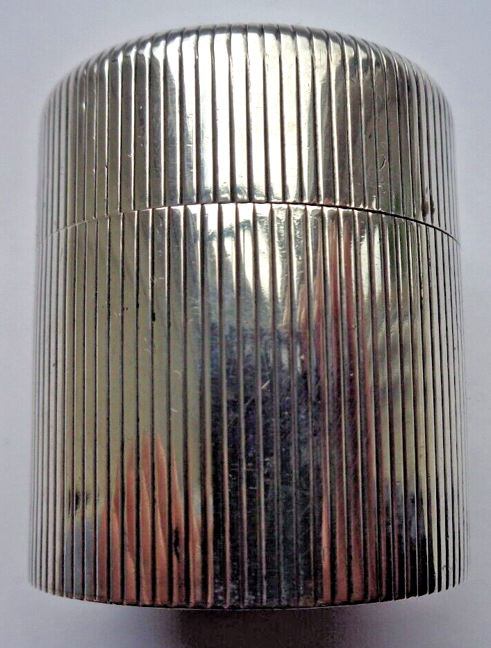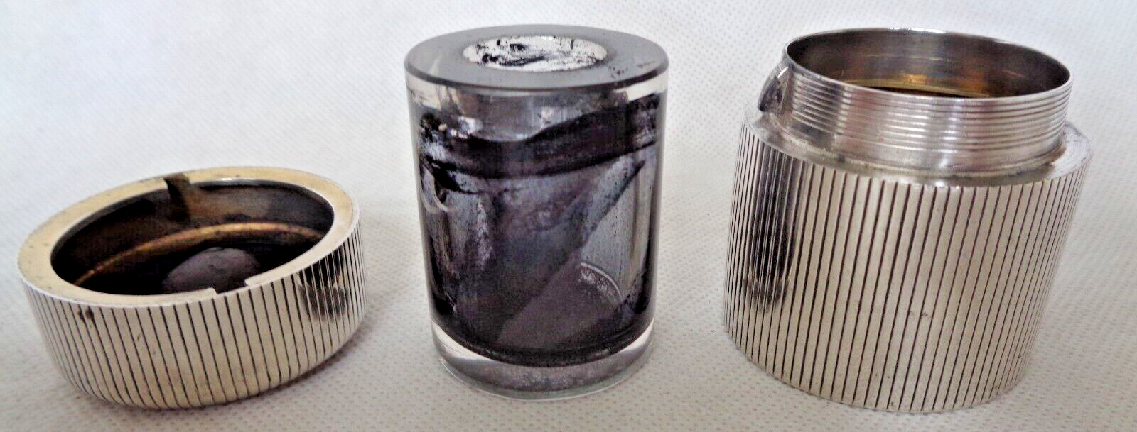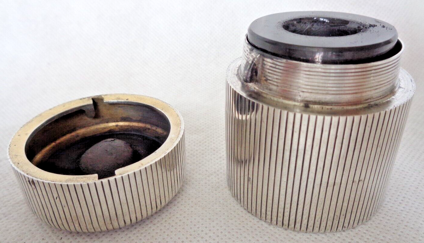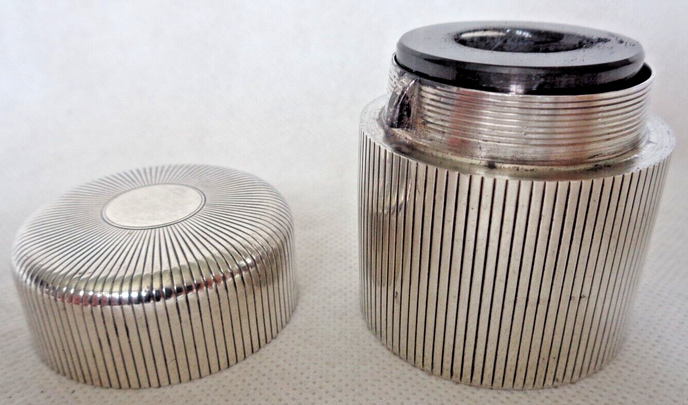 Edwardian solid silver cased traveling inkwell hallmarked London, 1902, by the highest quality maker Sampson Mordan & Co. of Regent Street.