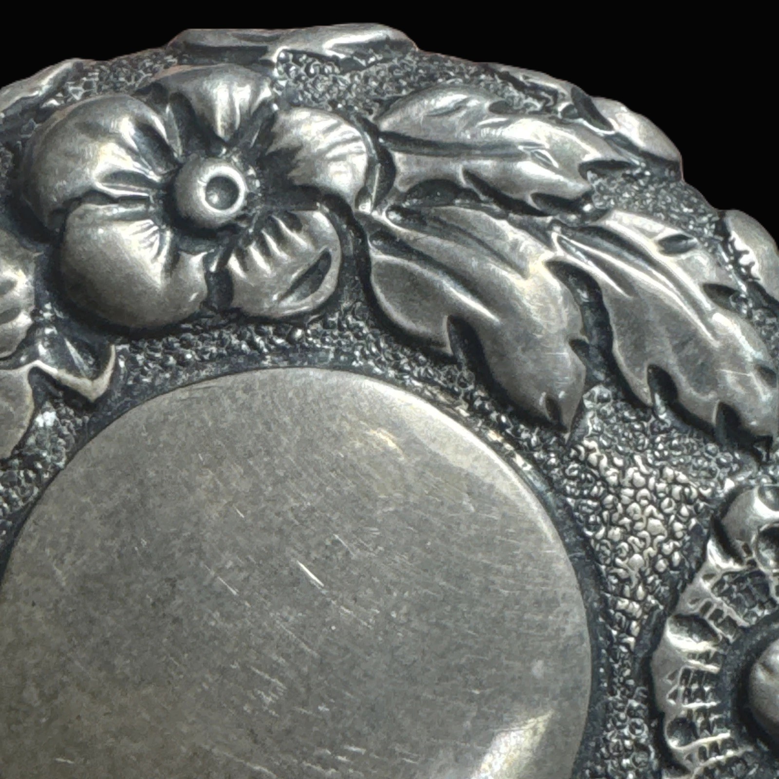 - Lid Detail: The hinged lid continues the floral motif, encircling a central circular vacant cartouche, intended for an owner’s engraved monogram.