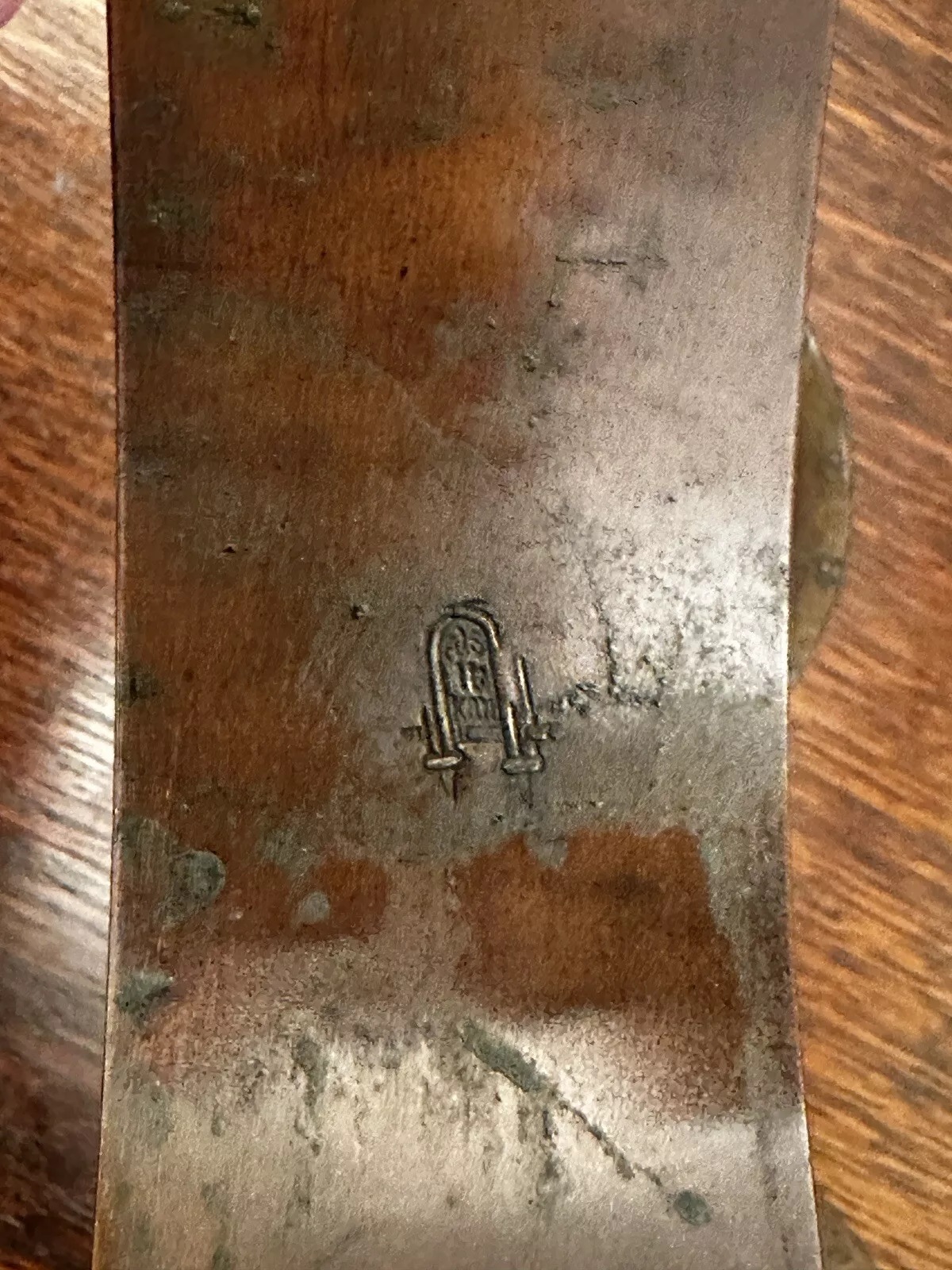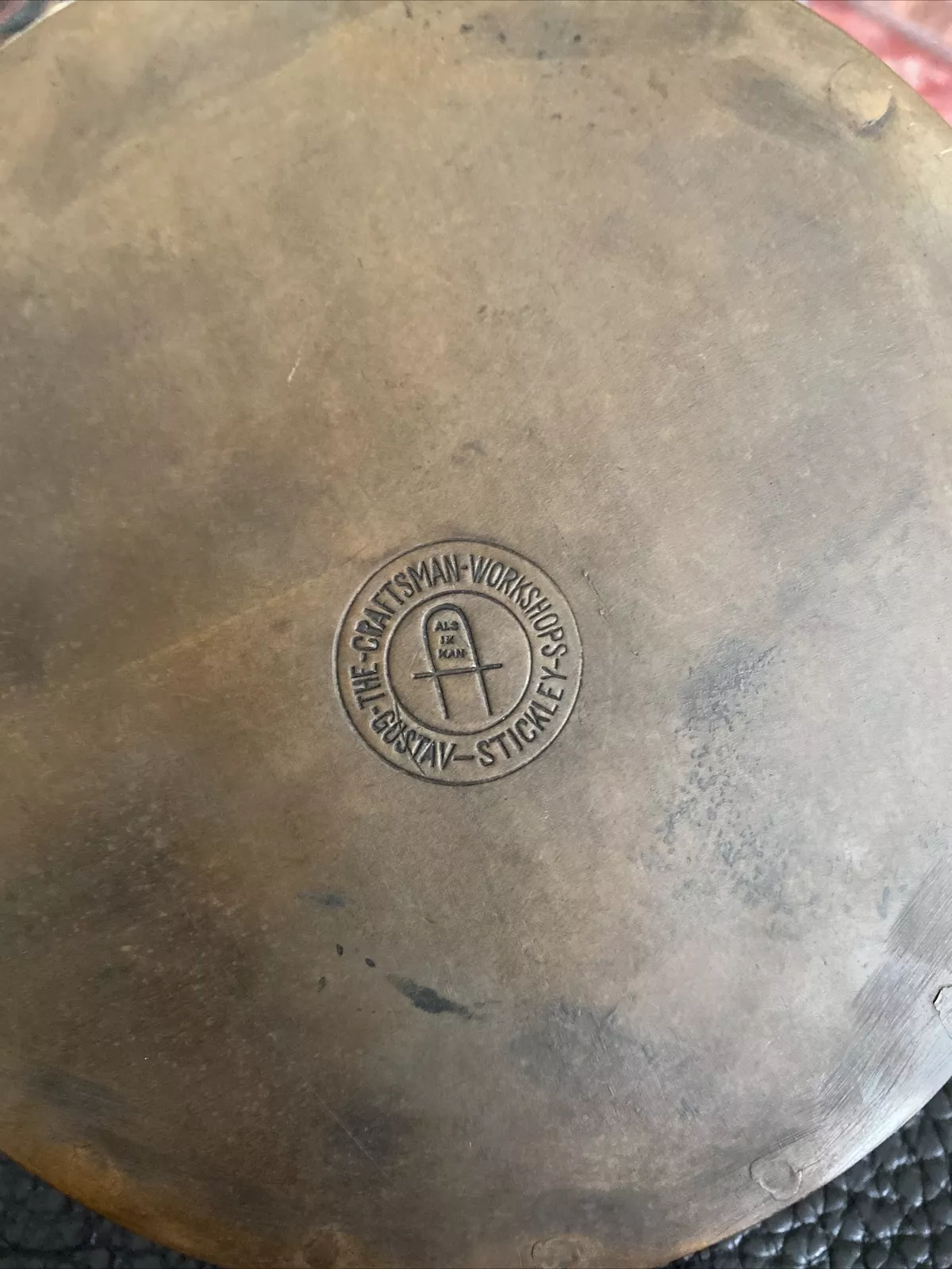 This inkwell and rocker blotter exemplify Stickley craftsmanship, reflecting the Arts and Crafts movement’s emphasis on quality and simplicity. Both fashioned from brass with a hammered finish, they are stamped with the Stickley mark and signed “Als ik Kan,” which means “As I Can” in Dutch, symbolizing the company’s commitment to excellence.