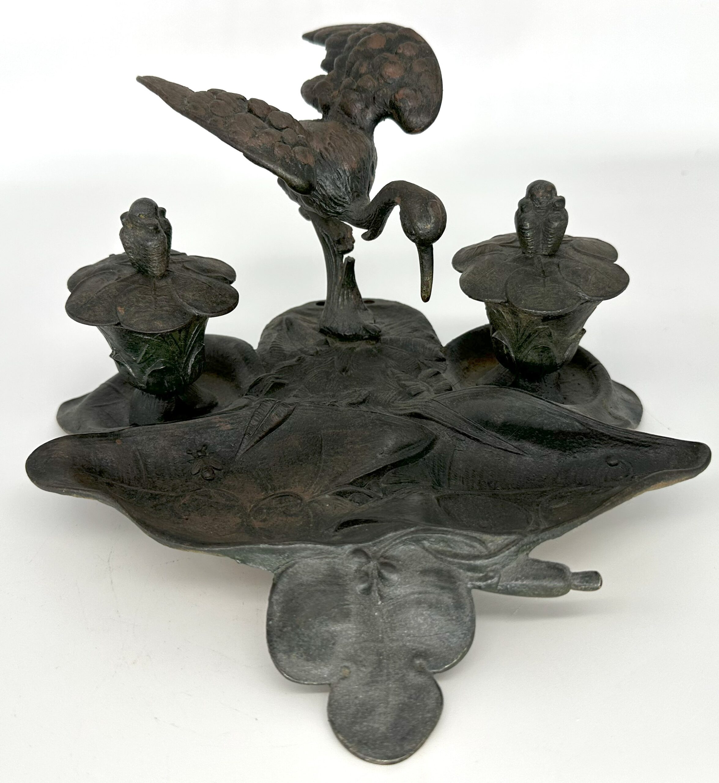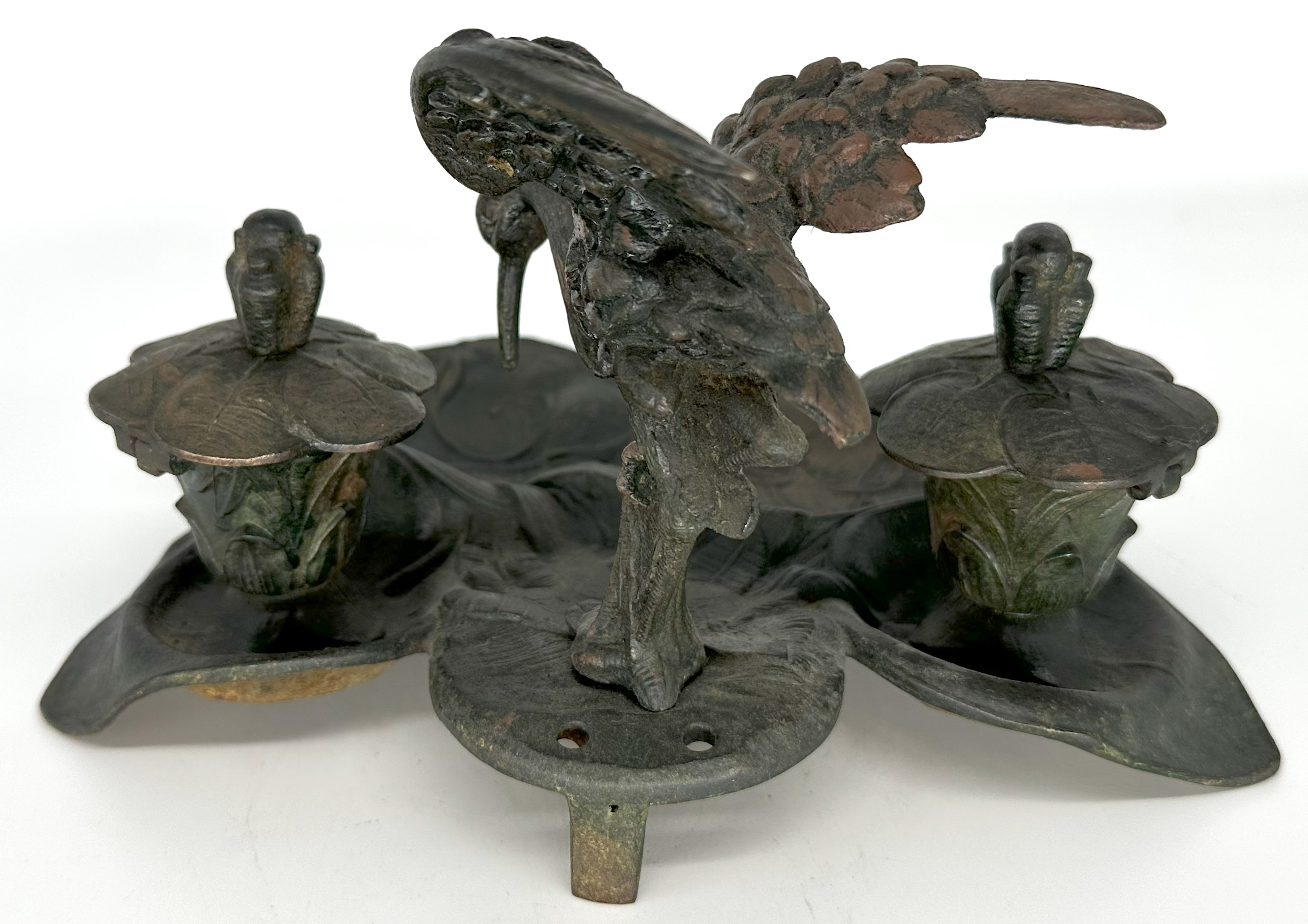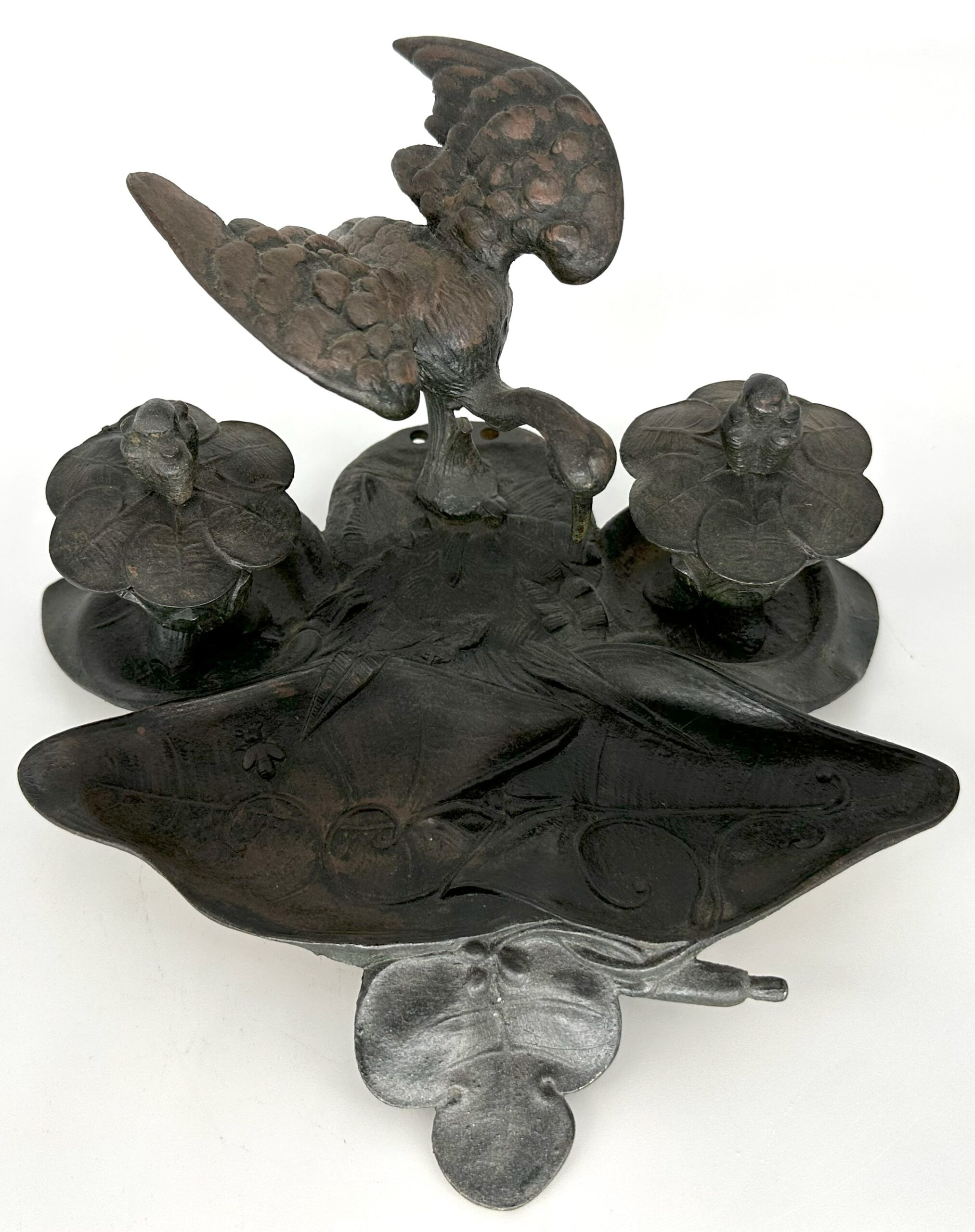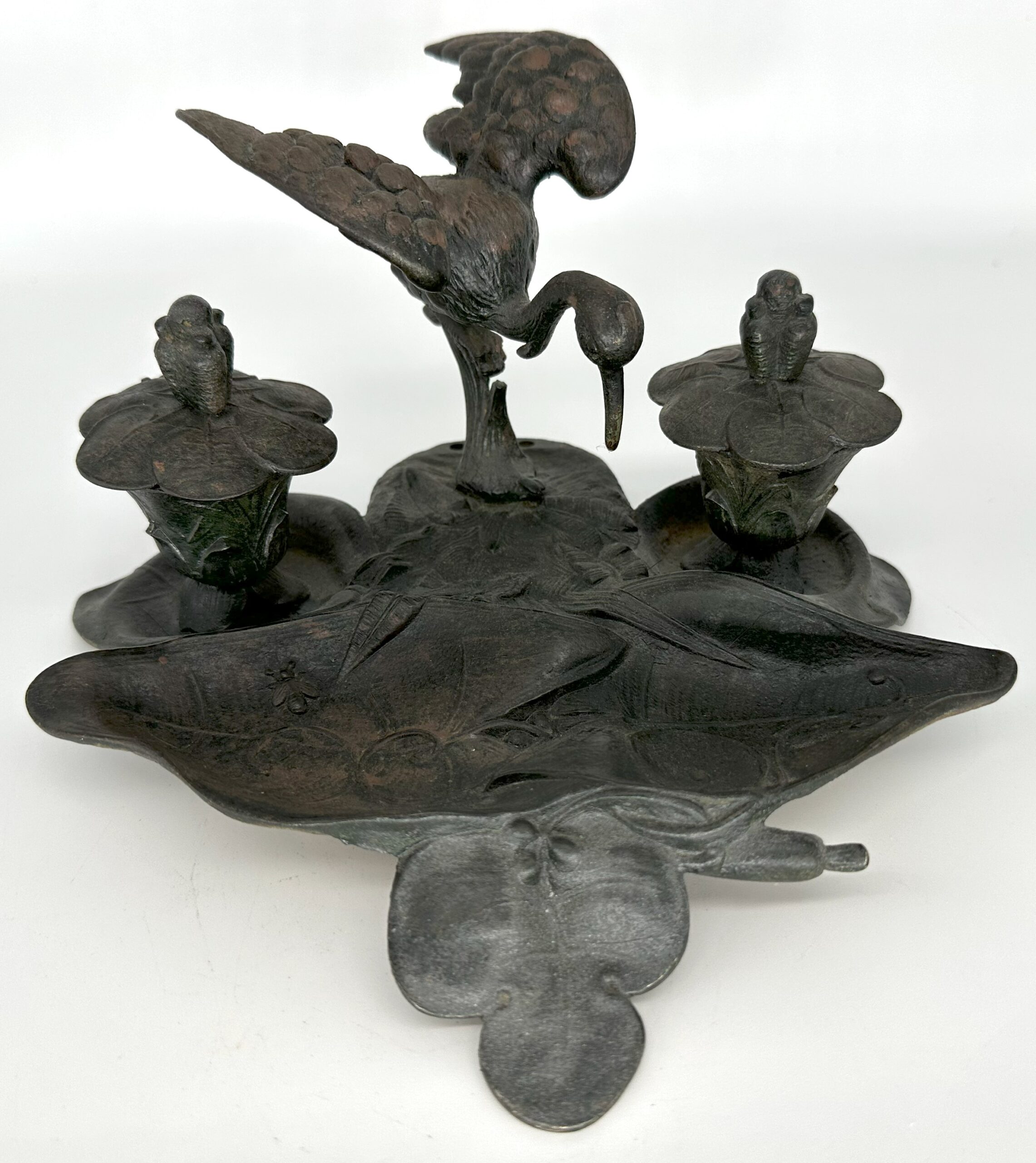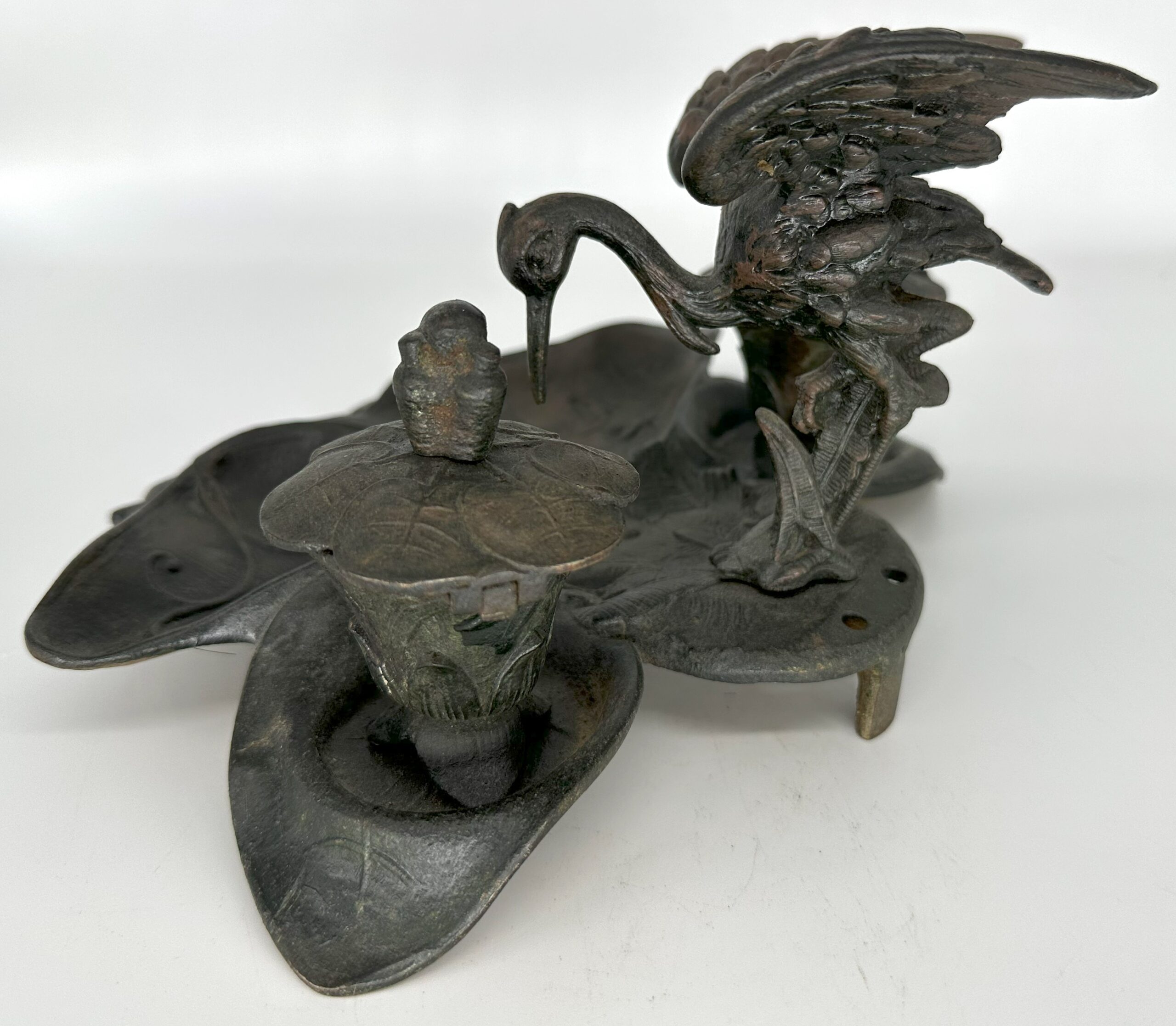 Cast iron inkstand with an Oriental theme, centering on a stork, lotus shaped inkwells, and floral /fauna pen tray. Marked on the bottom: “D219” in a square.