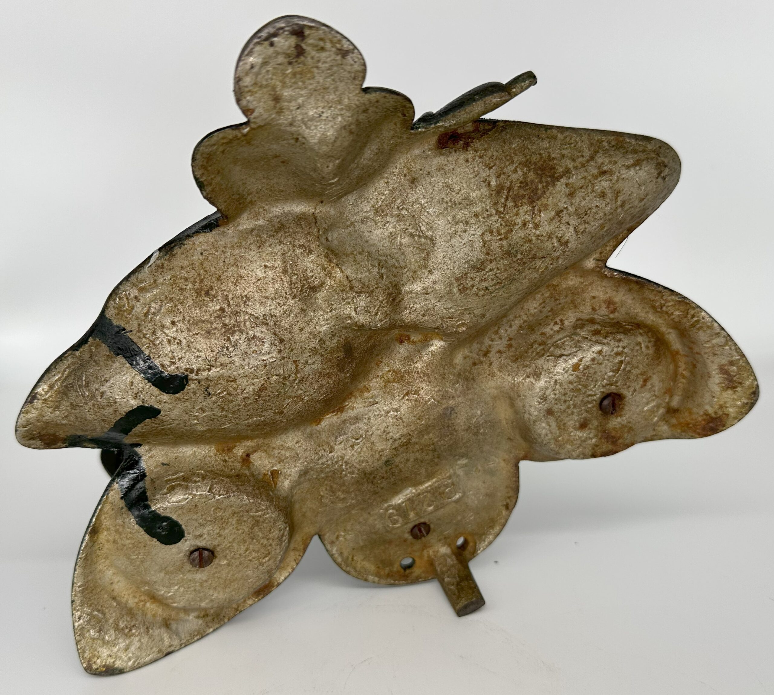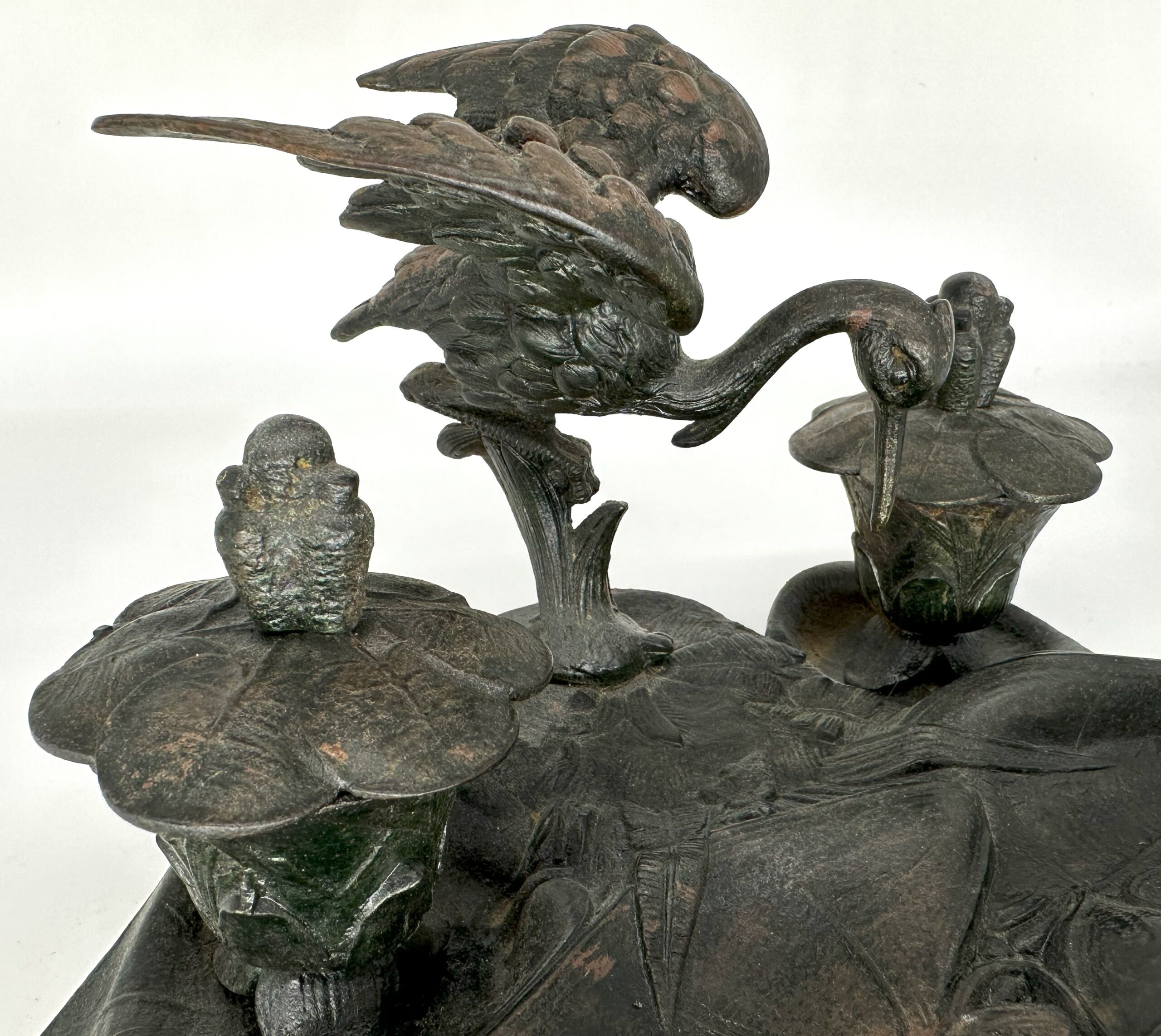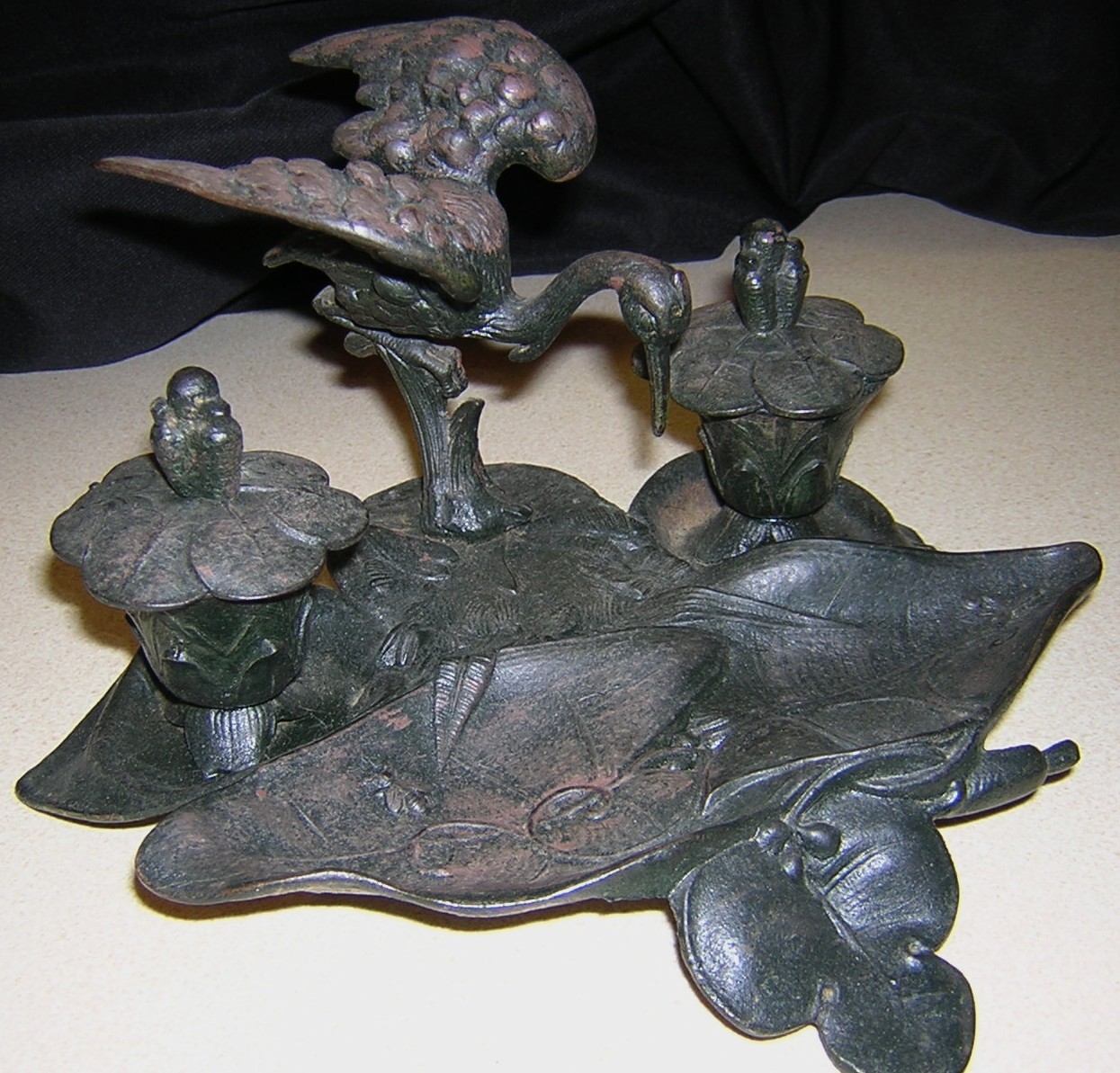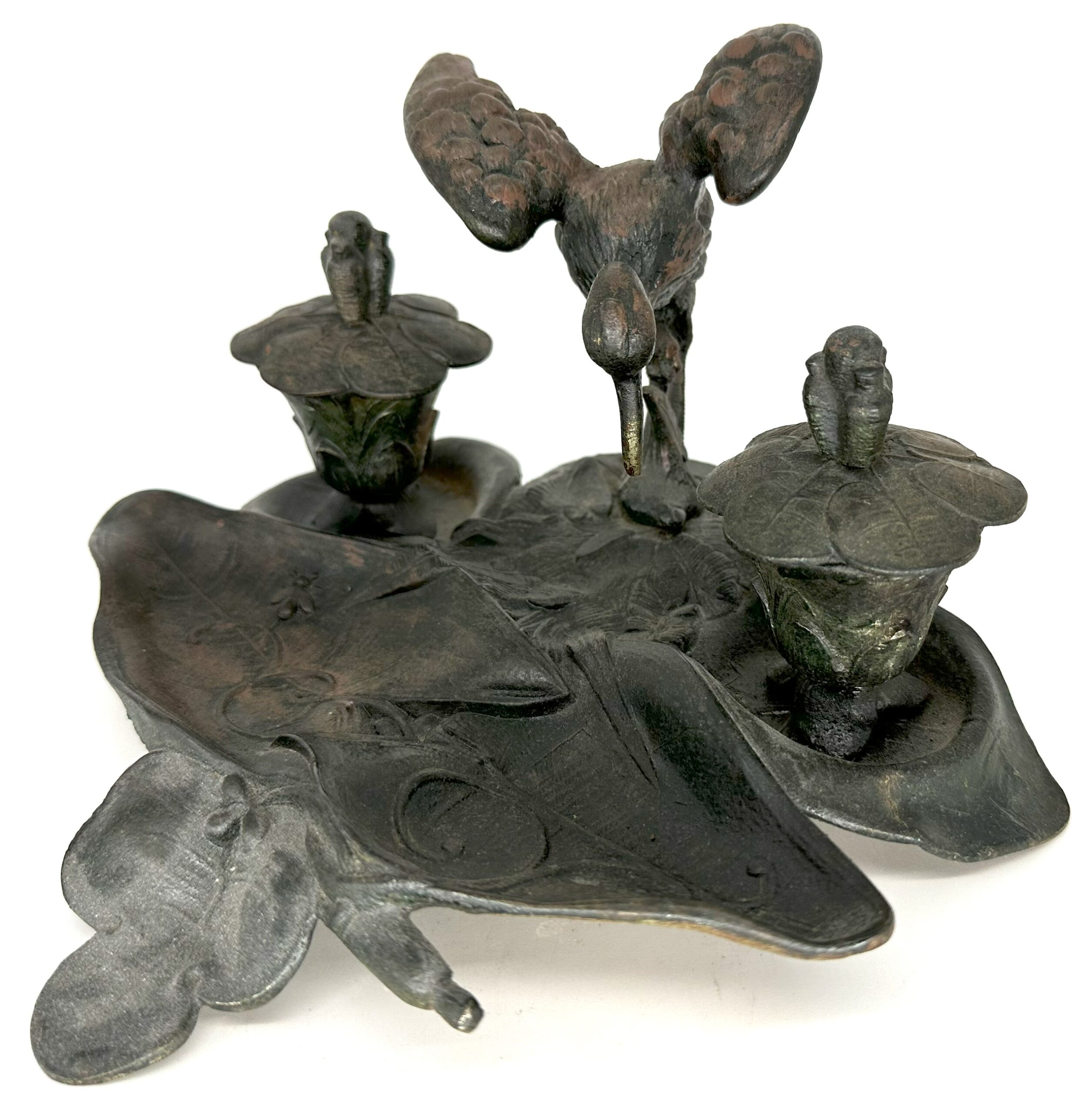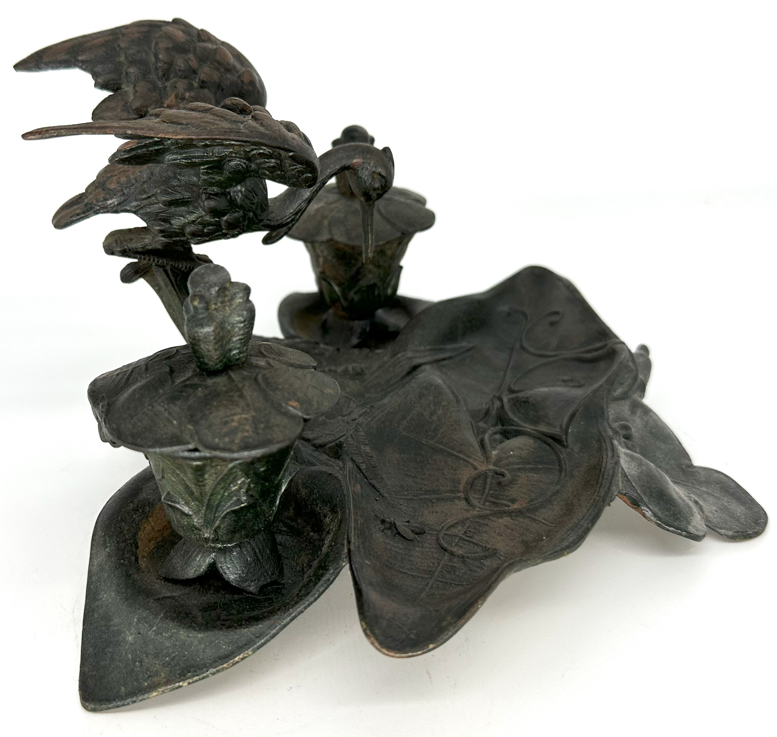 Cast iron inkstand with an Oriental theme, centering on a stork, lotus shaped inkwells, and floral /fauna pen tray. Marked on the bottom: “D219” in a square.