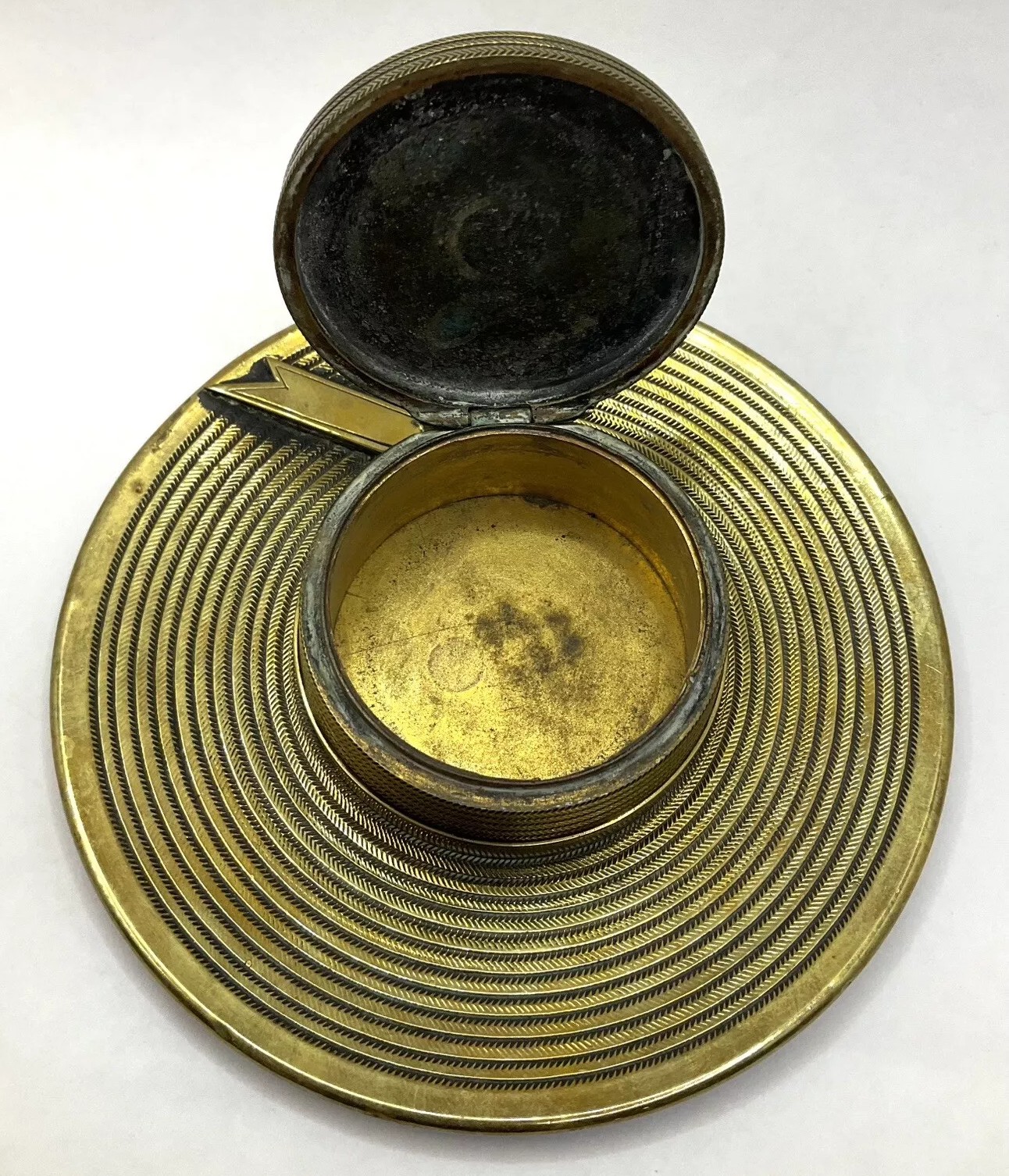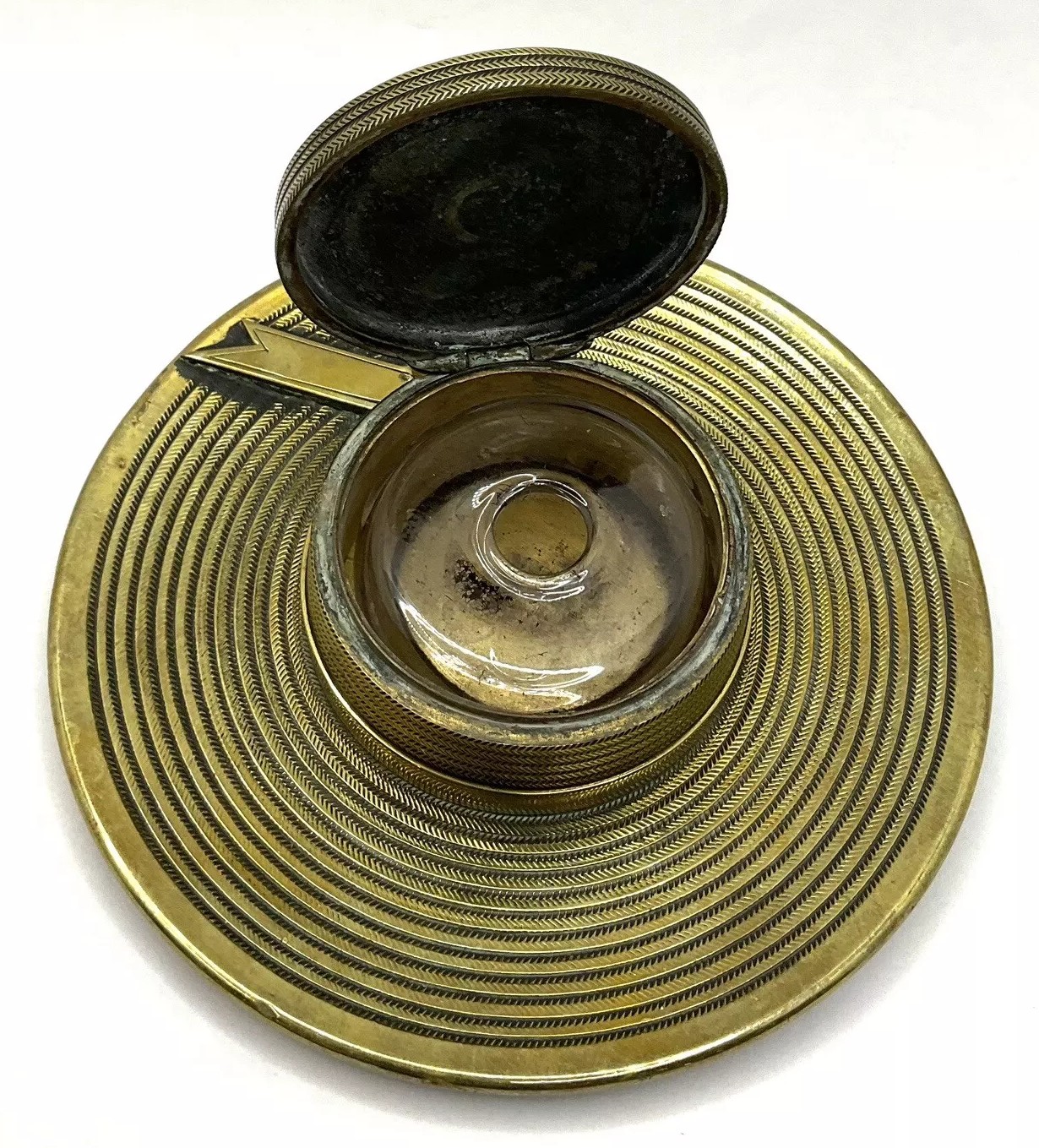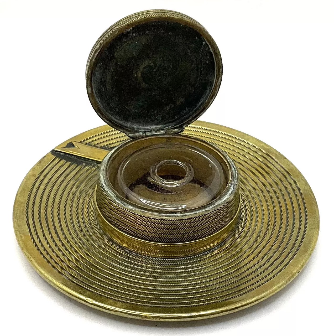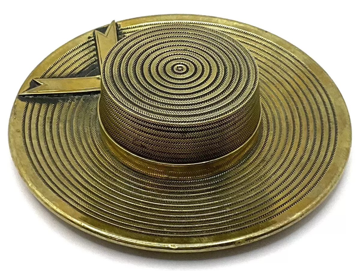 This brass inkwell is designed in the shape of a hat with a flat, circular brim adorned with intricate concentric patterns, mimicking the texture of a woven or straw hat. The crown, which holds the inkwell, is also decorated with similar detailed patterns. A small hinge on the side of the crown allows the top to be lifted to access the glass inkwell inside. Enhancing the hat is a ribbon with a bow placed around the crown.