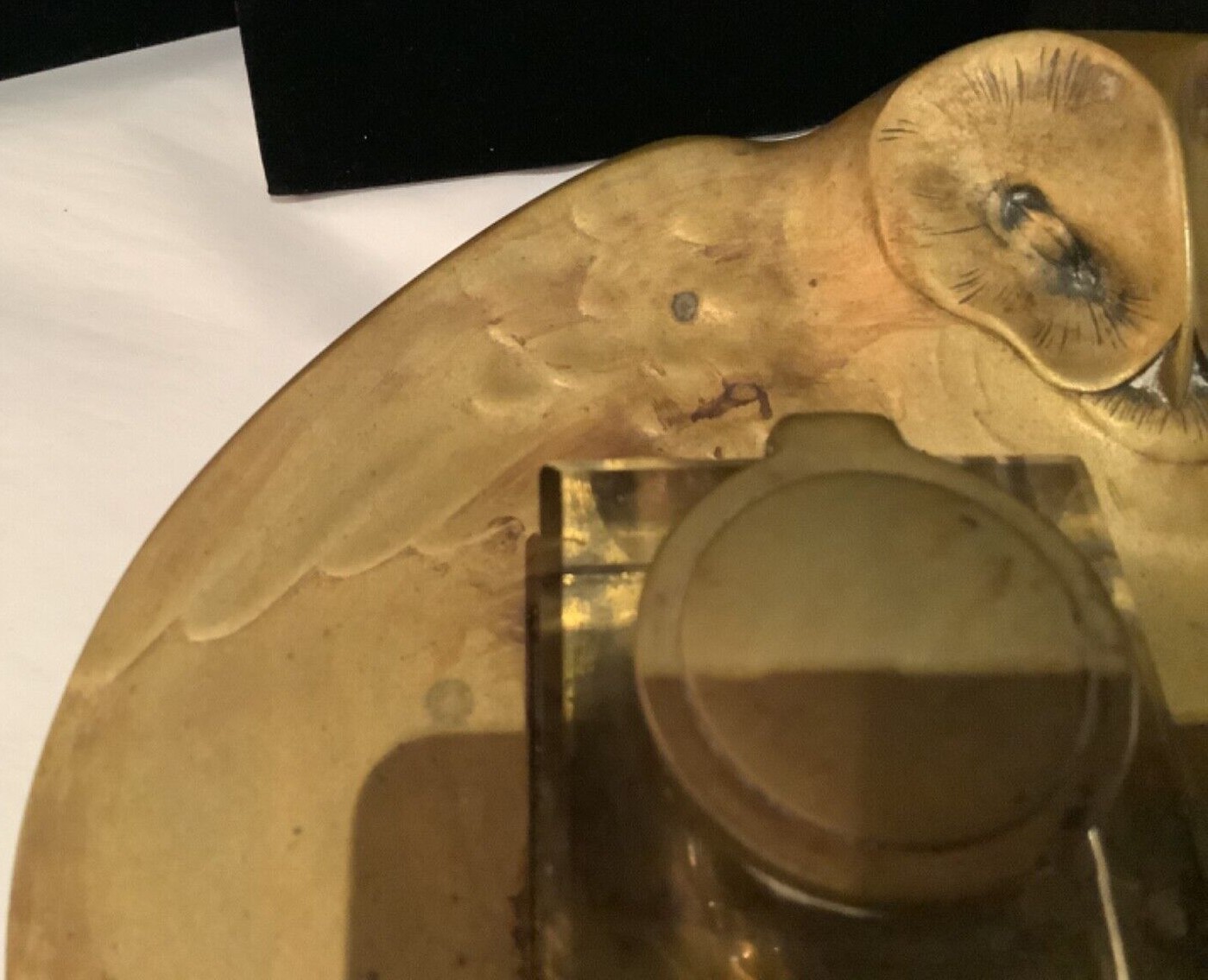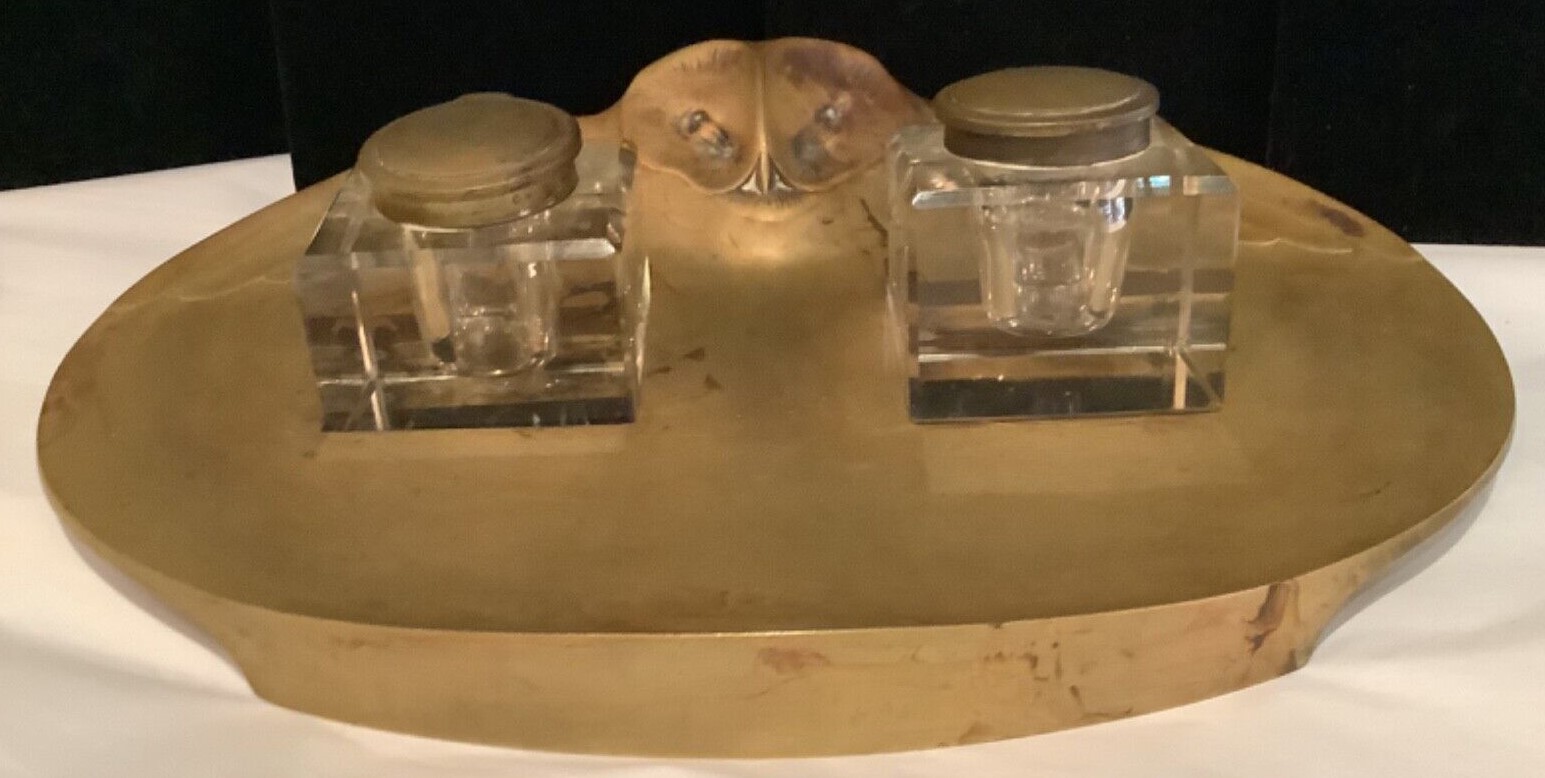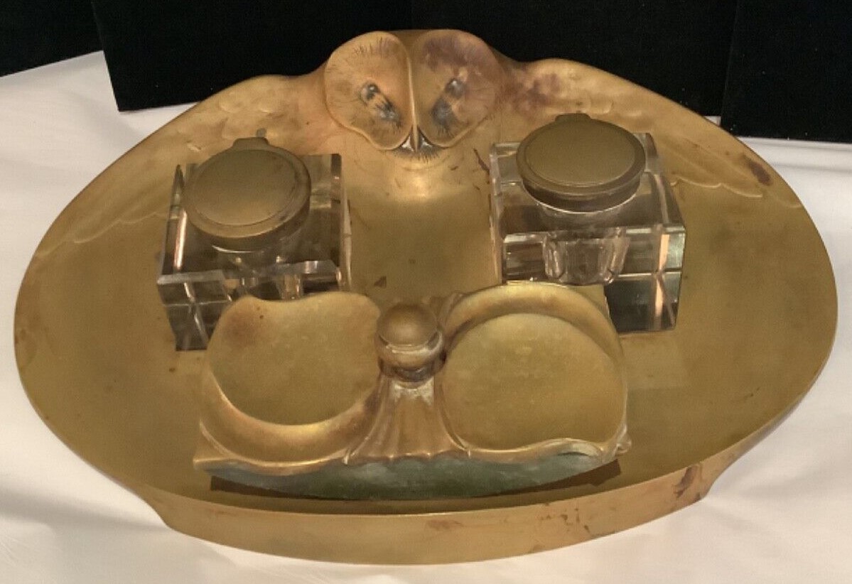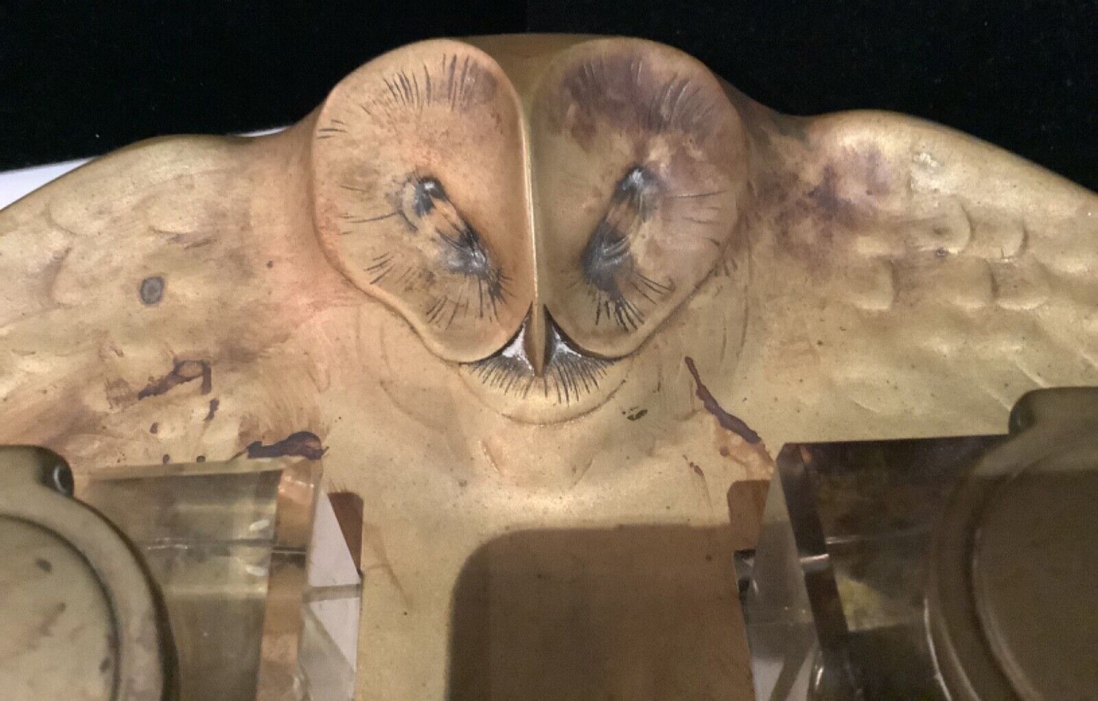 Sculptured bronze inkstand with rocker blotter create an owl motif. The rocker blotter rests in the pen tray, integral to the overall look. The piece is marked “Geschützt” and “Real Bronce[sic]”.