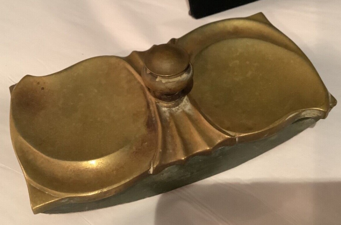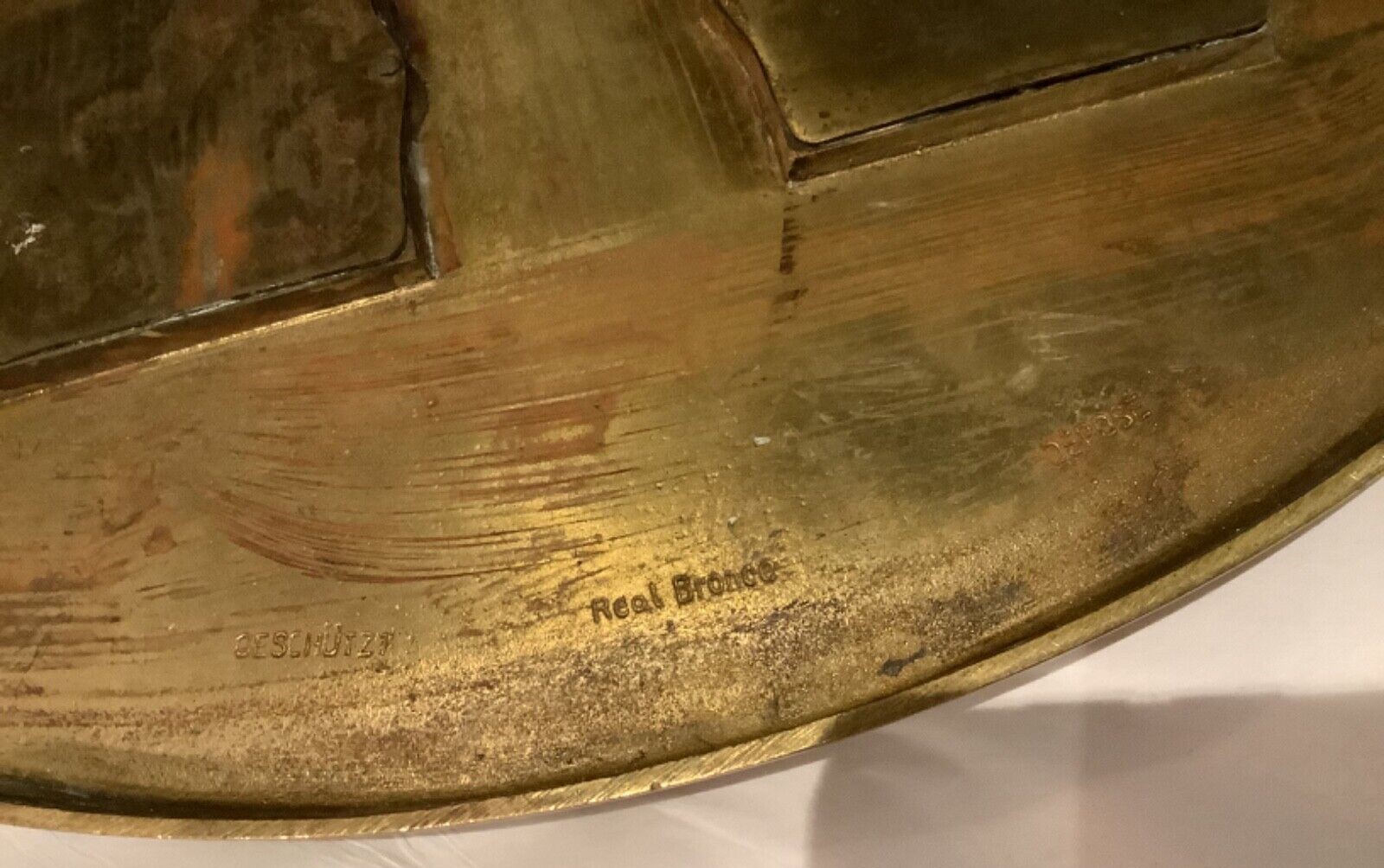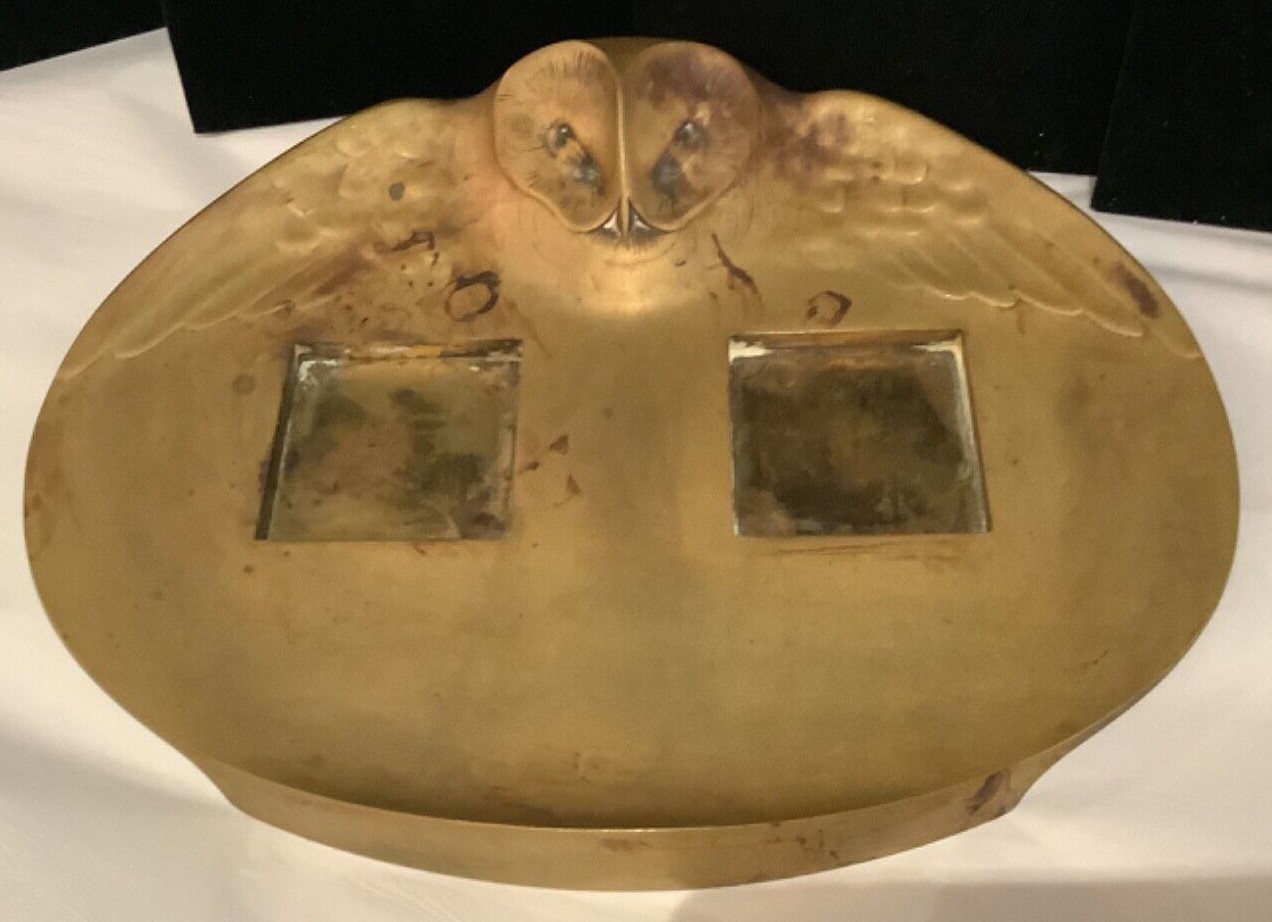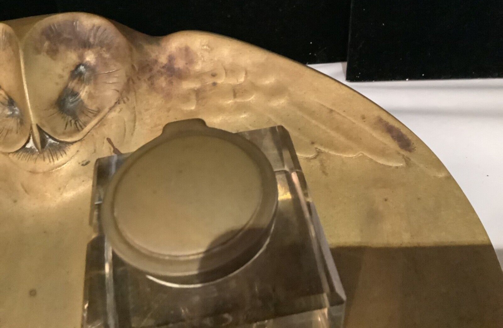 Sculptured bronze inkstand with rocker blotter create an owl motif. The rocker blotter rests in the pen tray, integral to the overall look. The piece is marked “Geschützt” and “Real Bronce[sic]”.