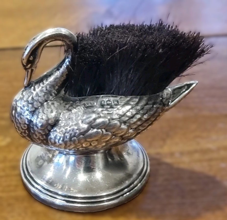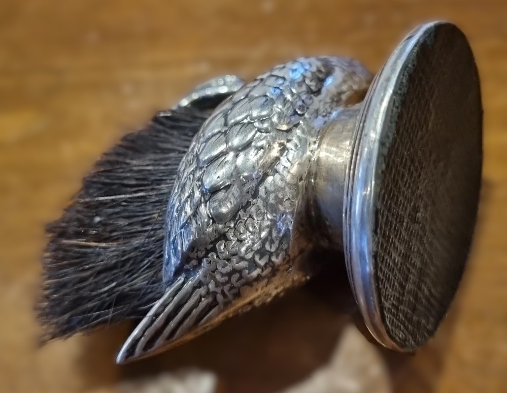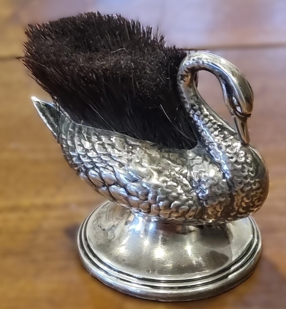 - The Brush: Emerging from the swan’s back is a dense, stiff-bristled brush. This was intended for the writer to dip their ink-stained nib into, effectively cleaning it between uses or before storage.