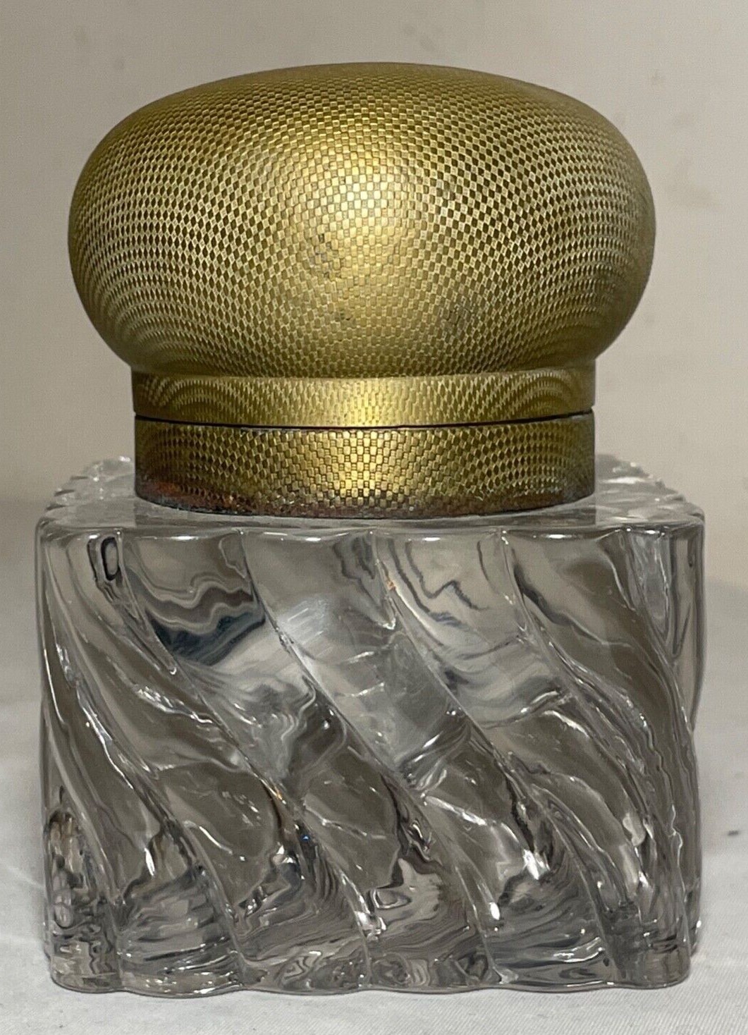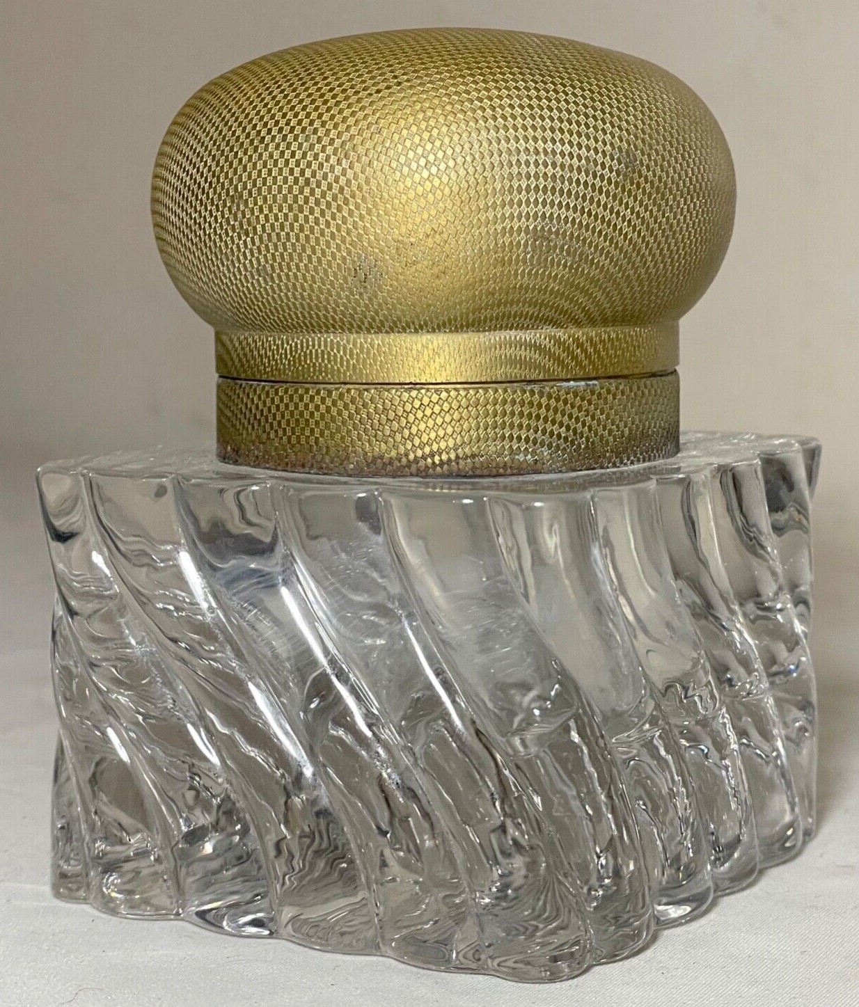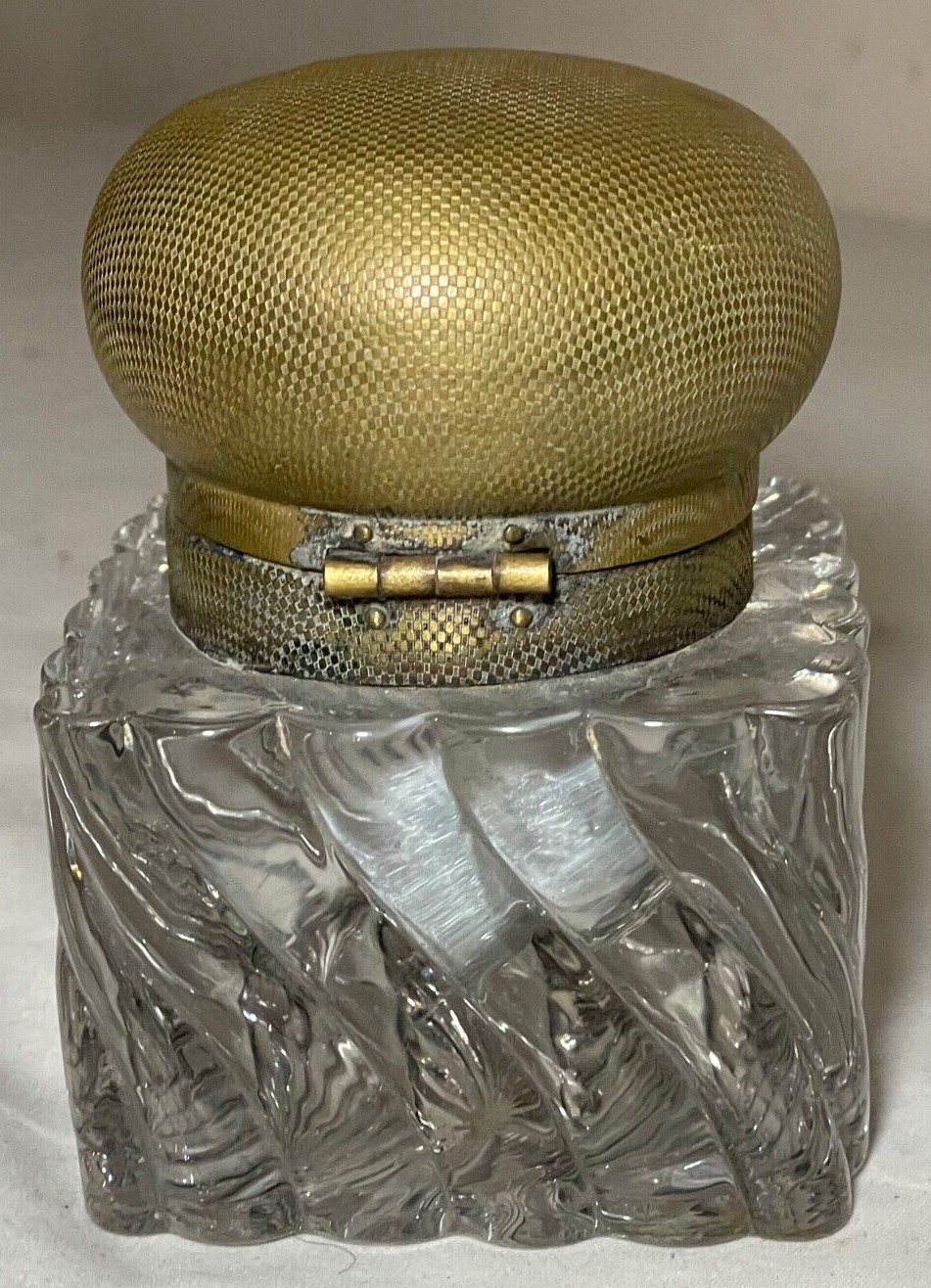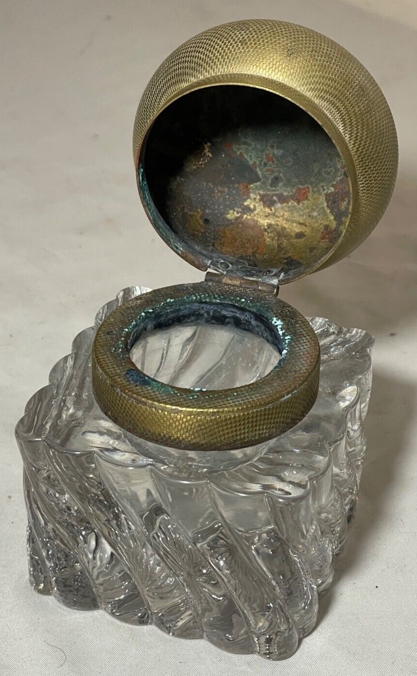 This swirled glass inkwell, with a starburst pattern on the bottom, has a brass bulbous, dome-shaped lid. The lid features a textured surface created by a pattern of finely detailed pattern with the look of scales.