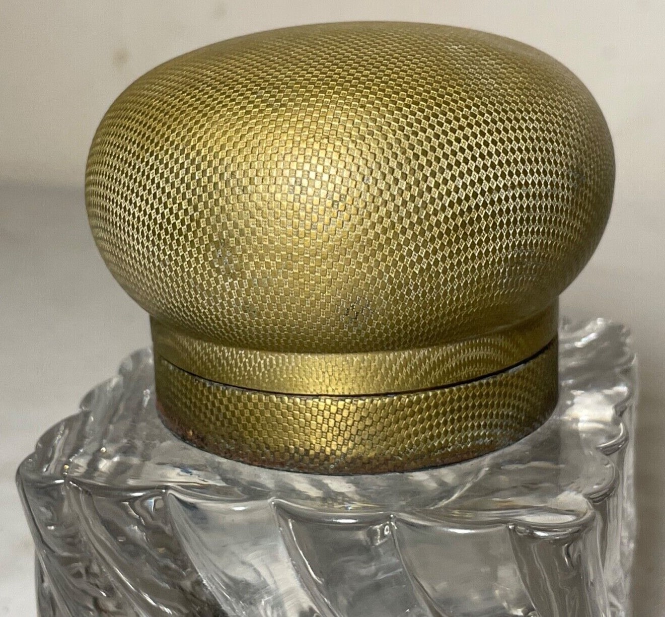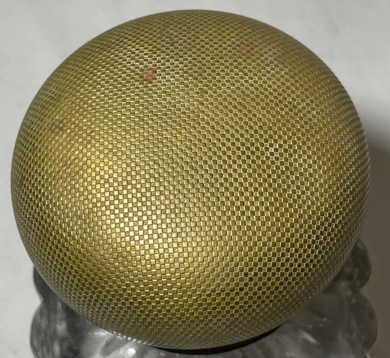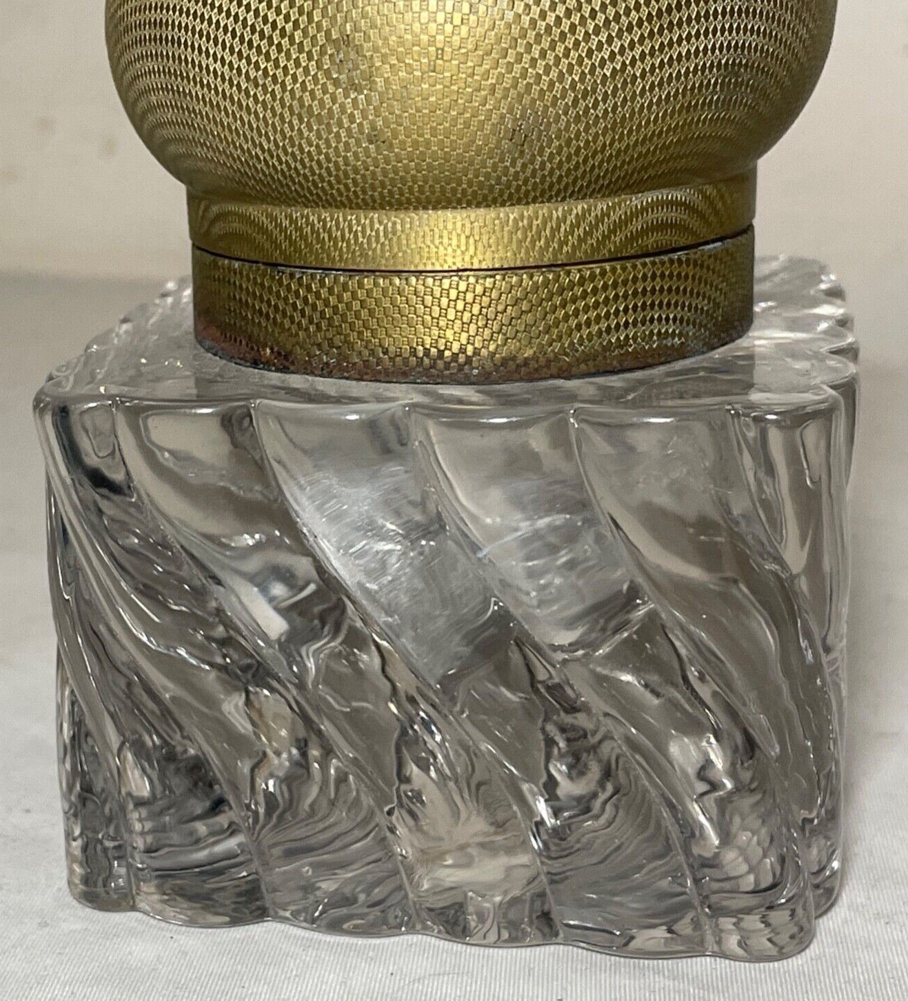 This swirled glass inkwell, with a starburst pattern on the bottom, has a brass bulbous, dome-shaped lid. The lid features a textured surface created by a pattern of finely detailed pattern with the look of scales.